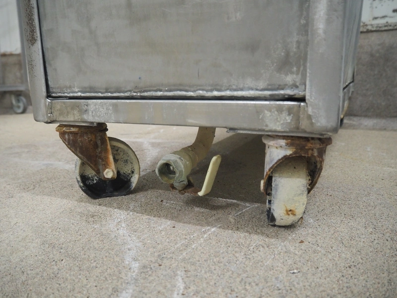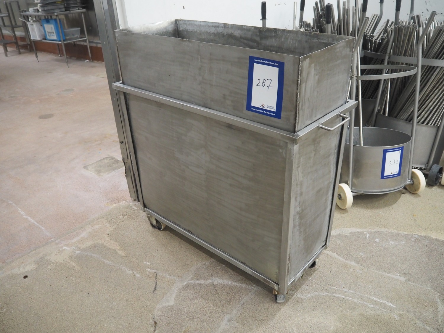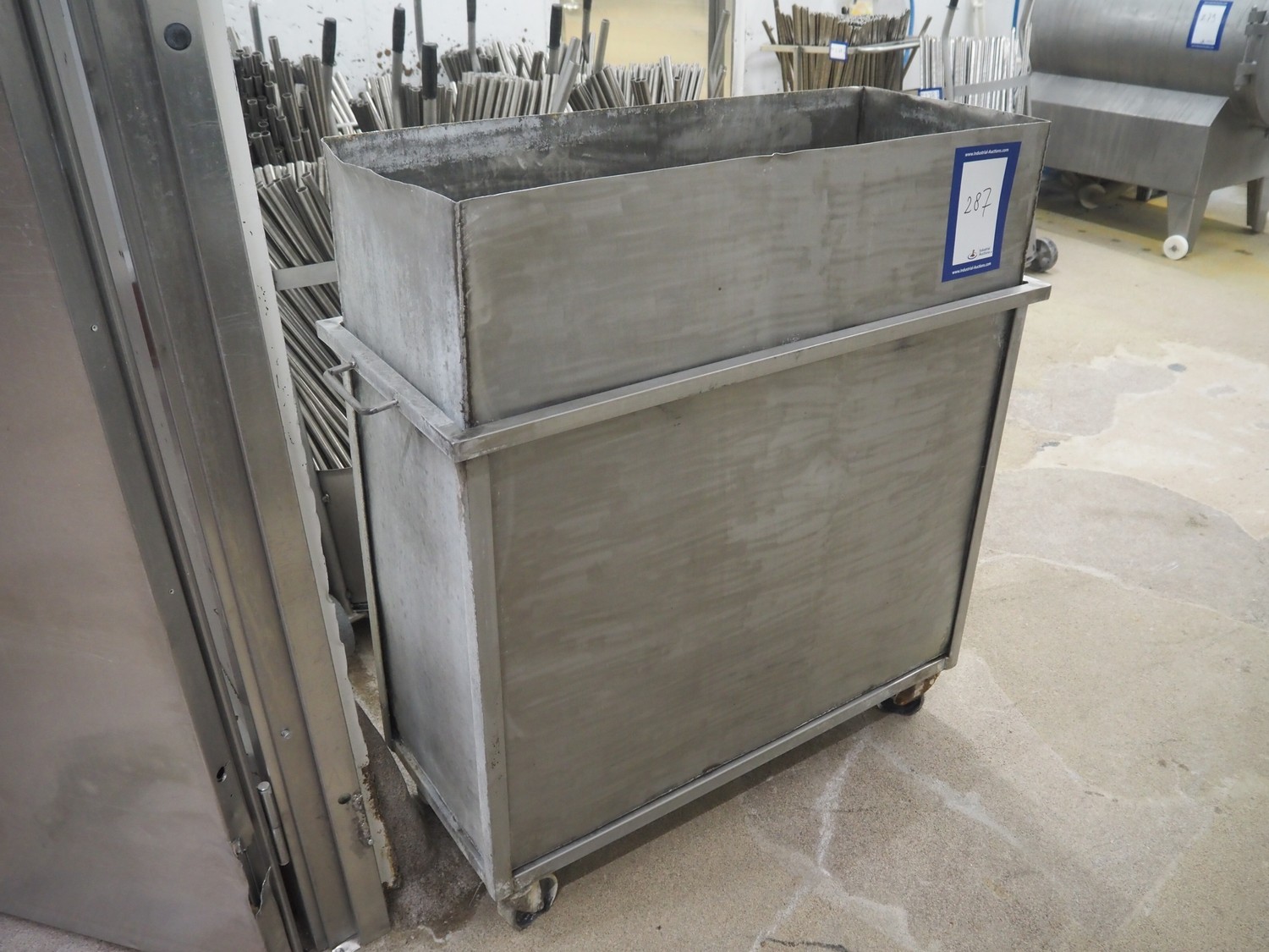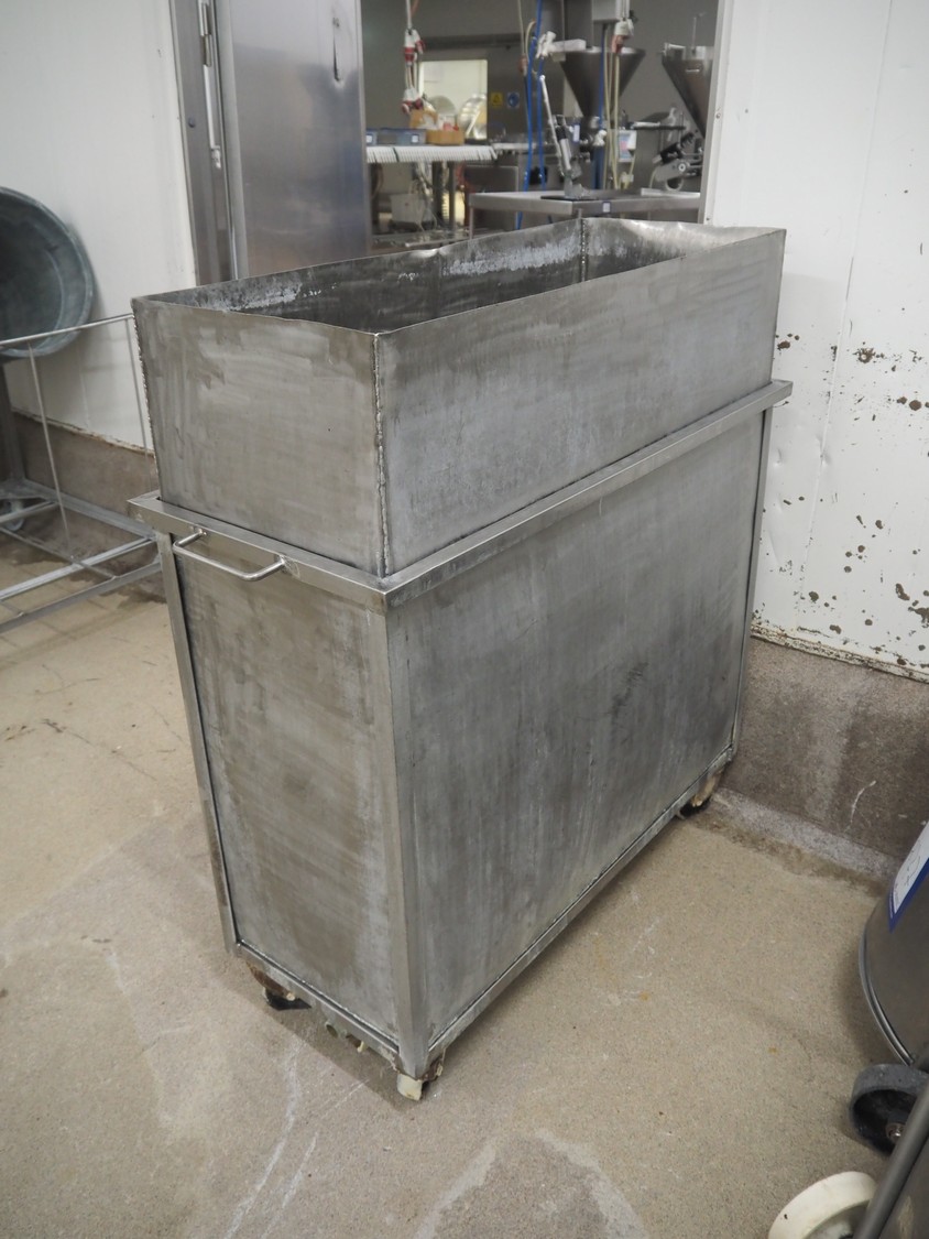 S/s mobile tub with drain, dimensions: 1100 mm x 460 mm x 1160 mm.