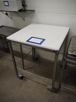 Mobile s/s table, plastic top, dimensions: 700 mm x 700 mm x 850 mm.€ 25,000 bids26/02/2026 14:50 -