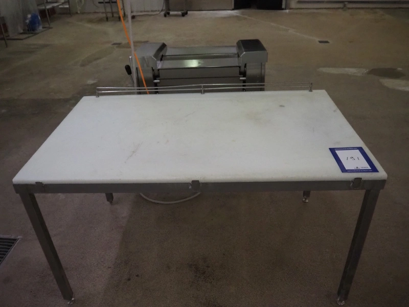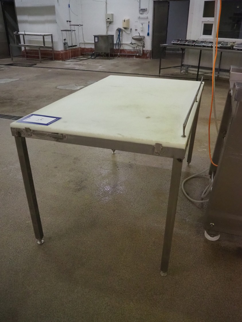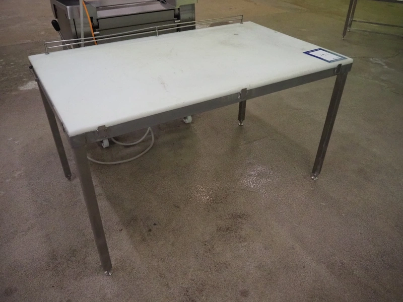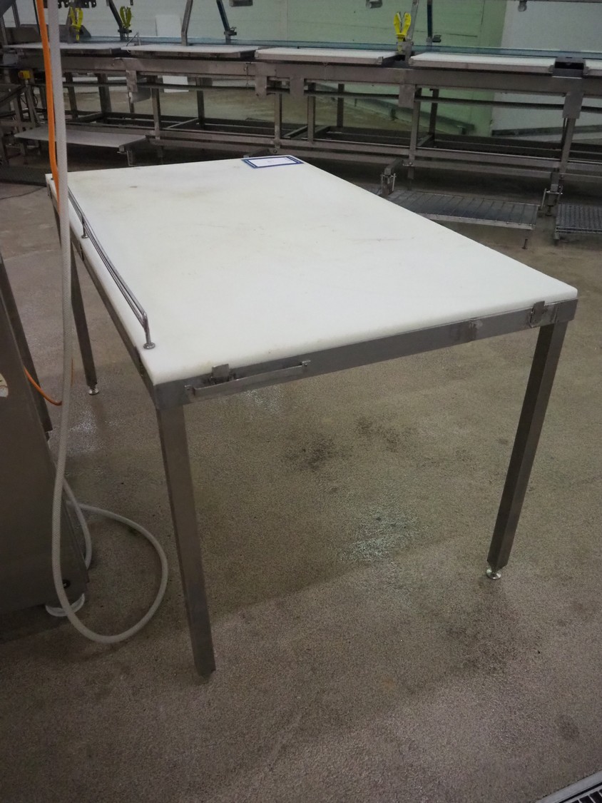 S/s table, plastic top, dimensions: 1500 mm x 900 mm x 910 mm.