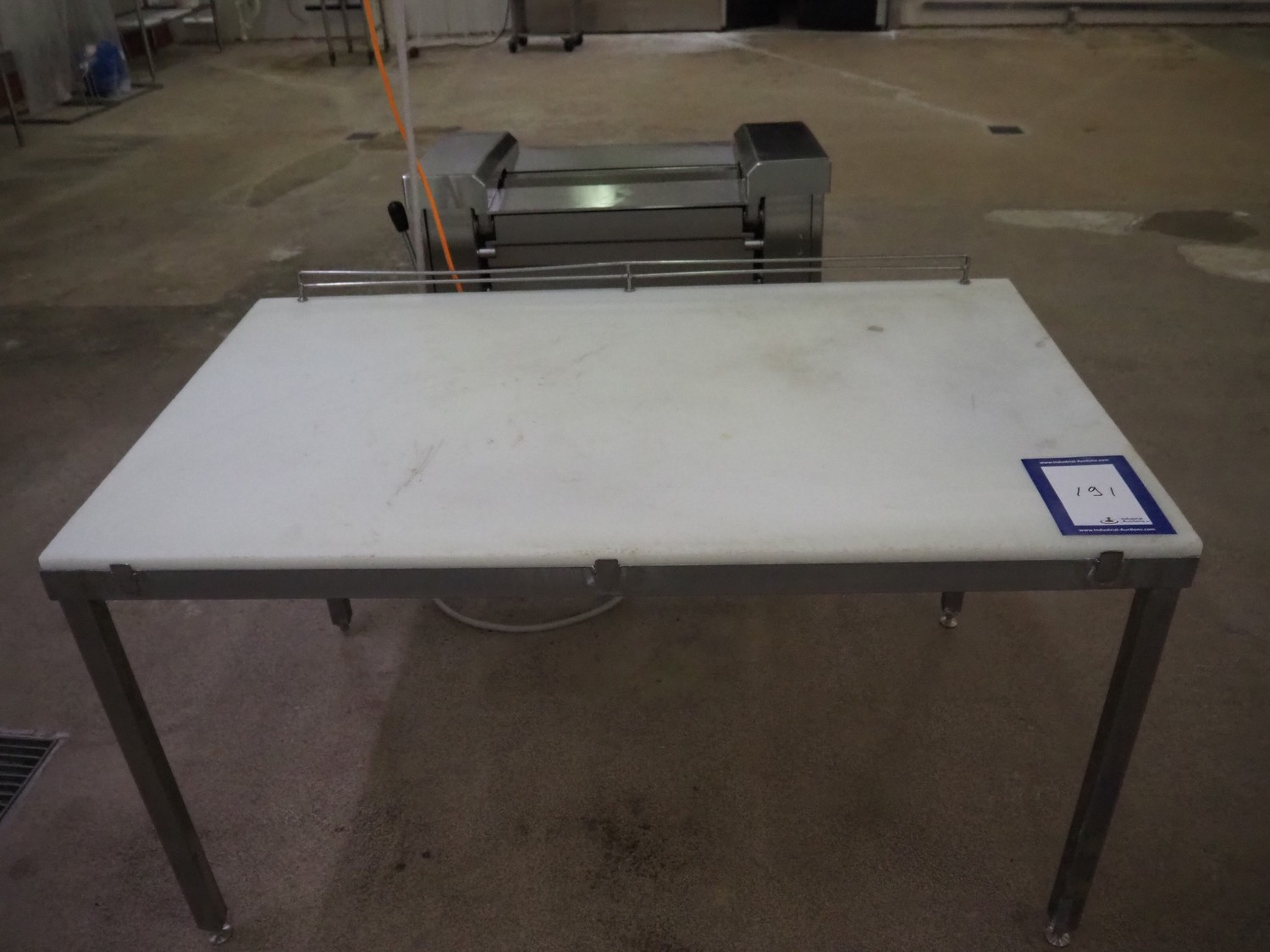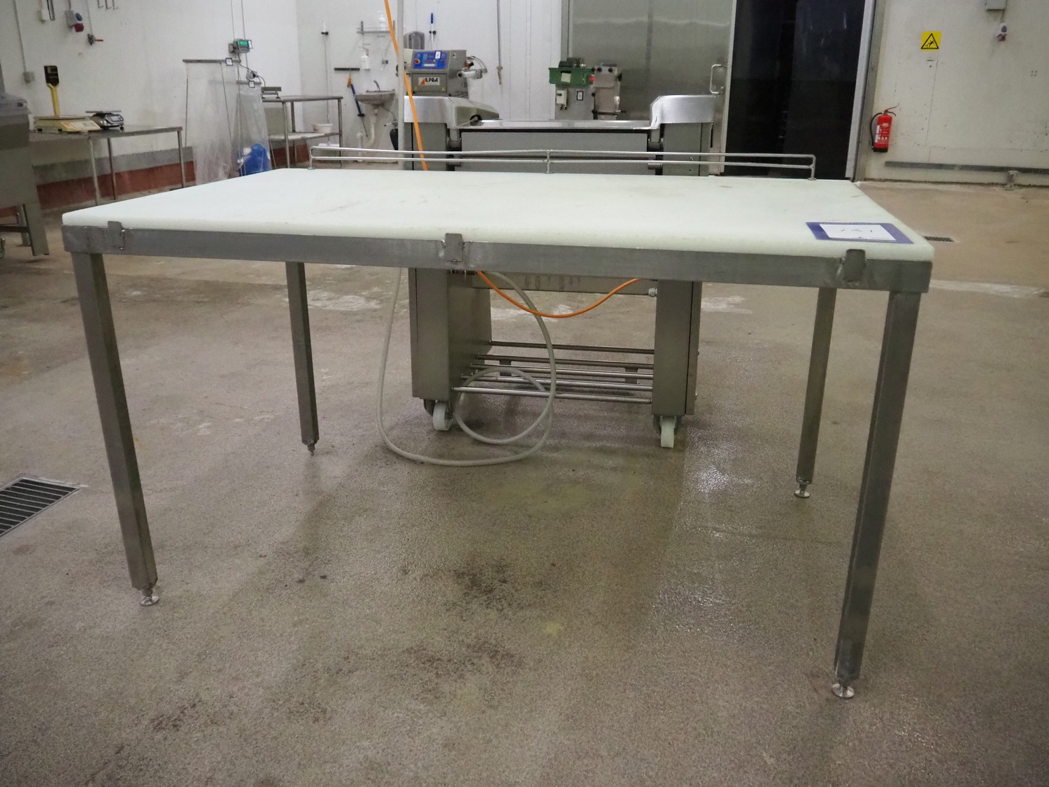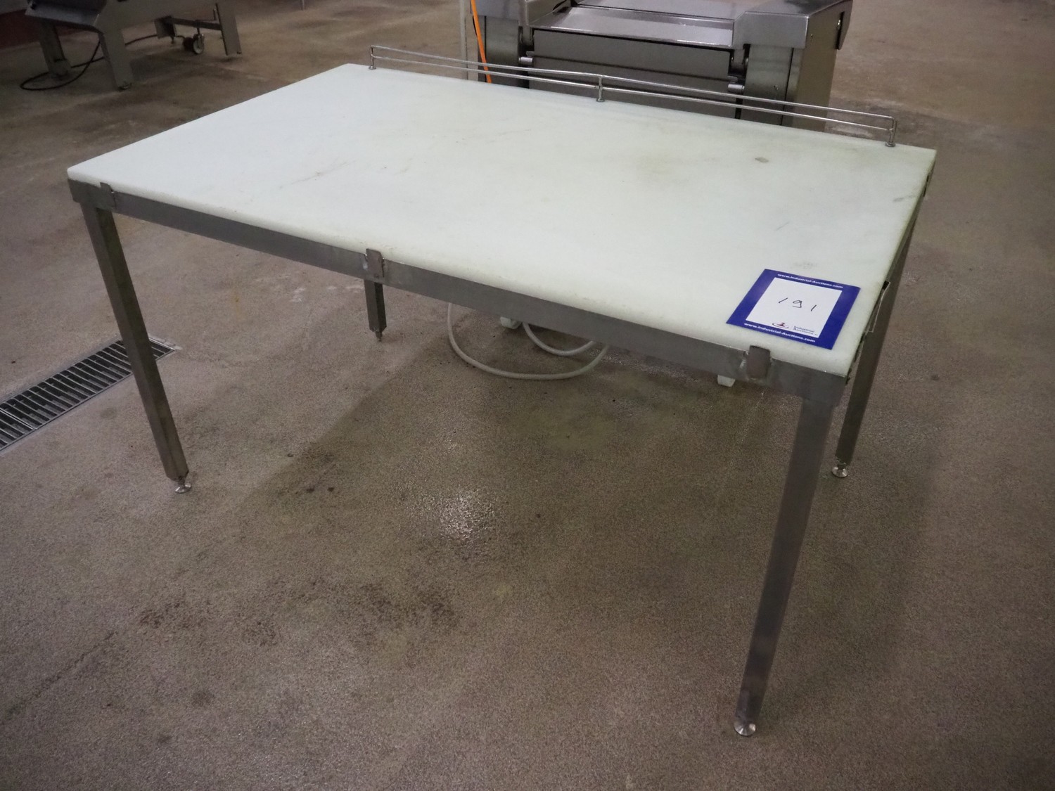 S/s table, plastic top, dimensions: 1500 mm x 900 mm x 910 mm.