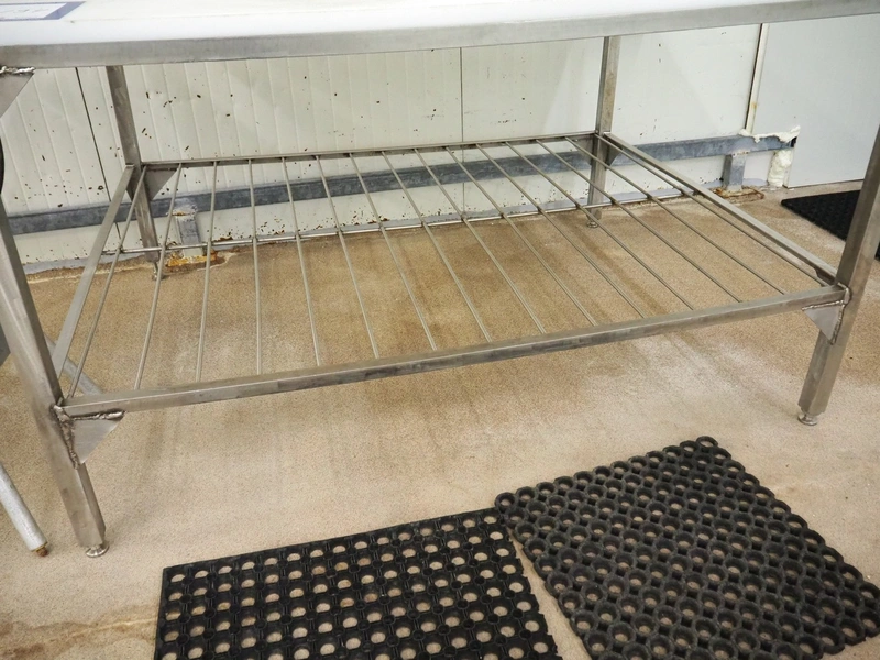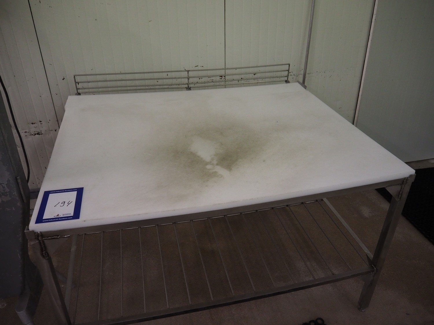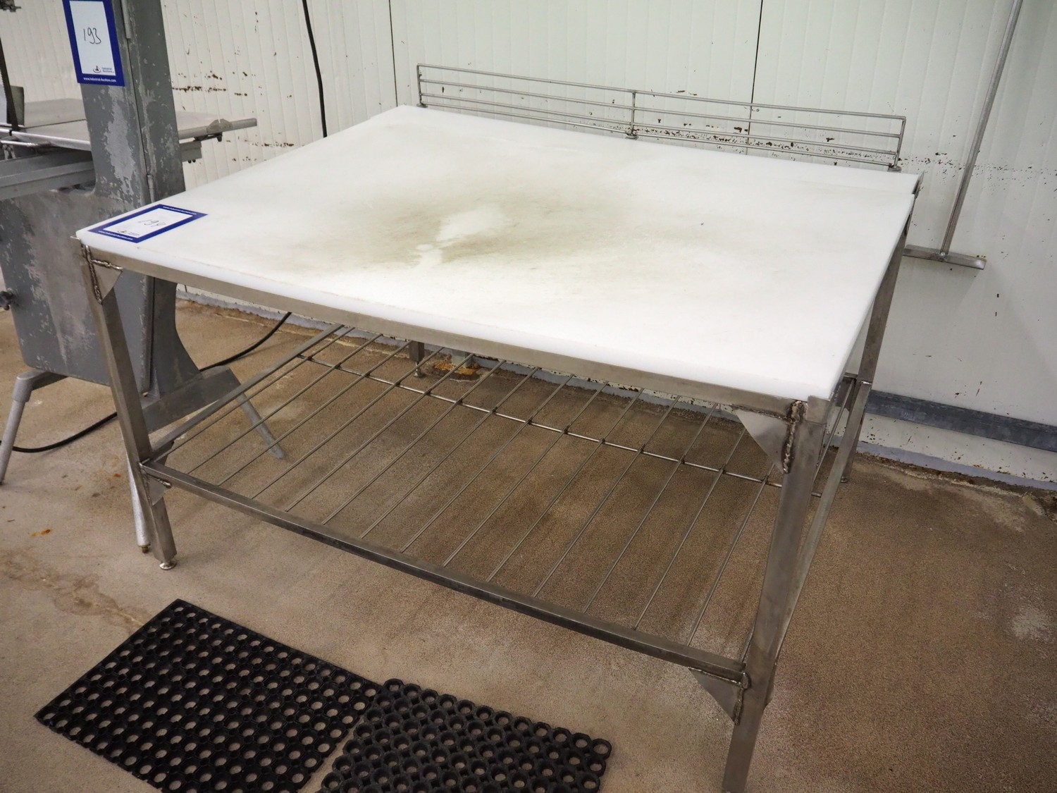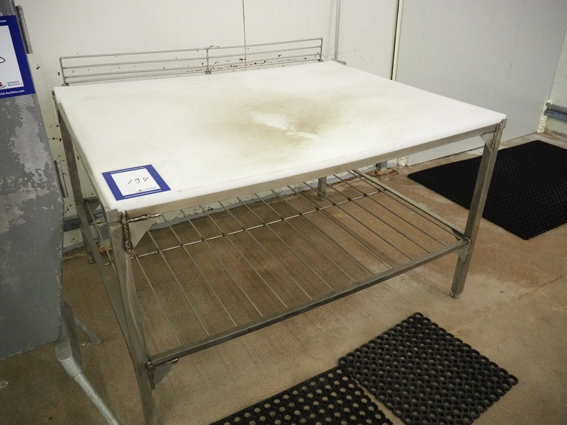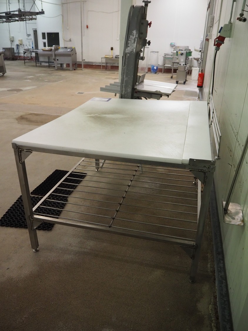 S/s table, plastic top, dimensions: 1500 mm x 1220 mm x 1000 mm.