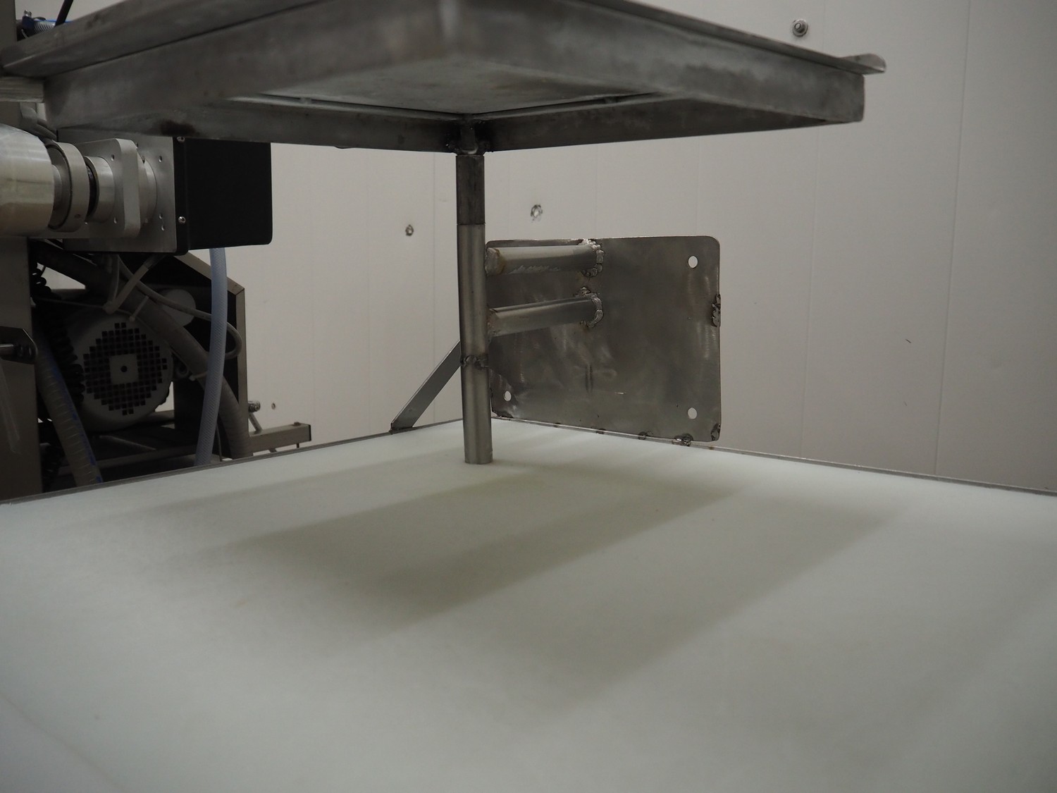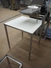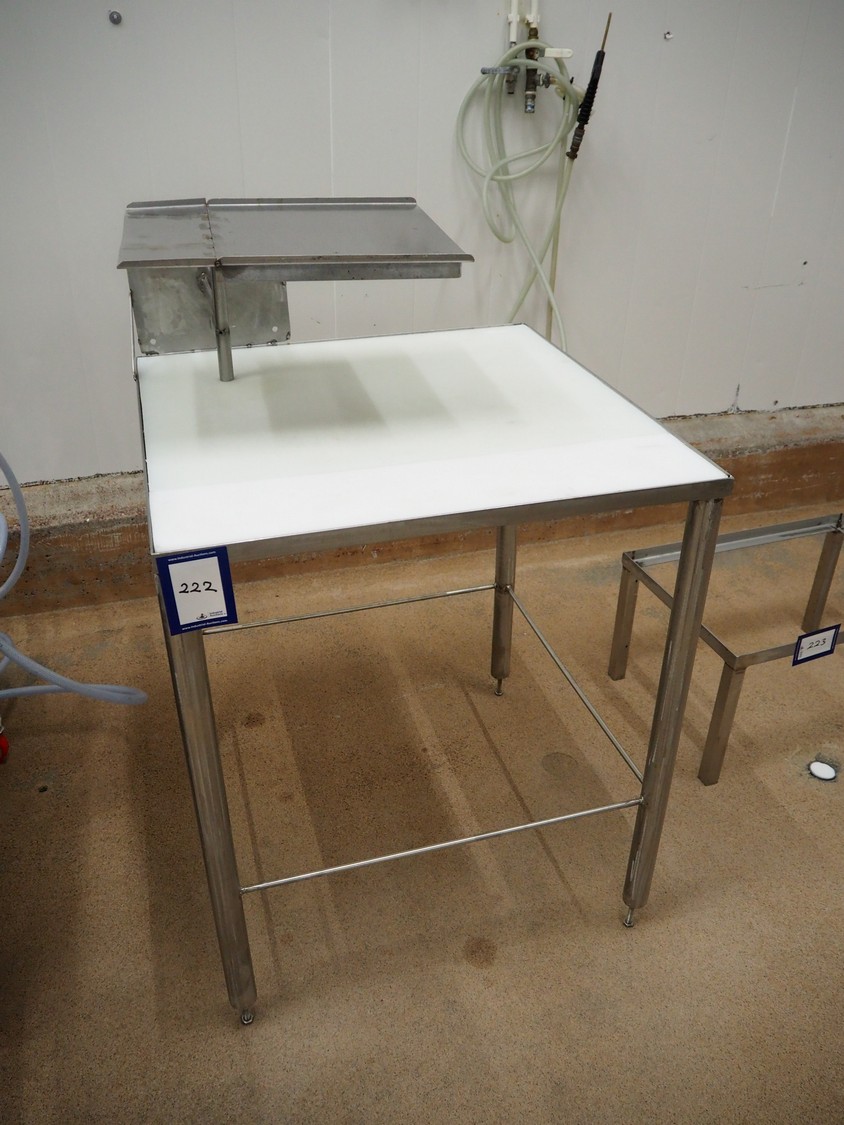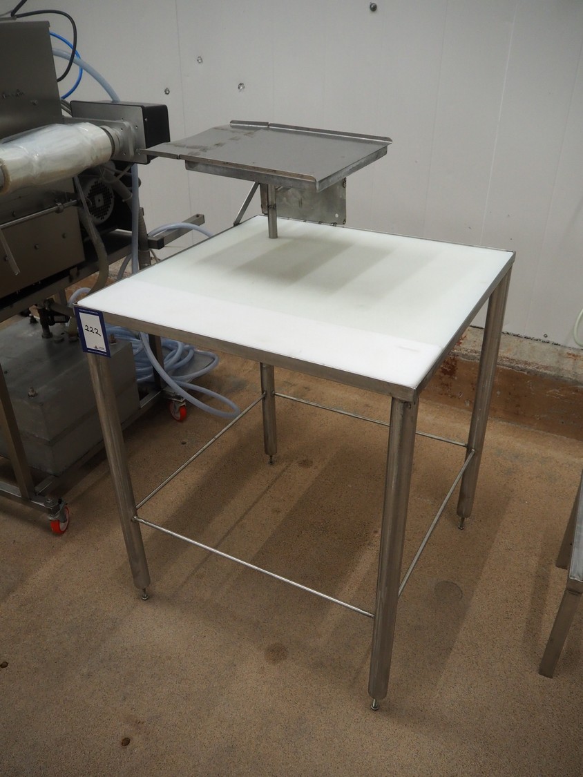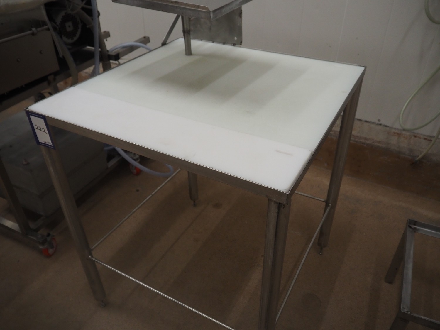 S/s table, plastic top, dimensions: 700 mm x 700 mm x 1100 mm.
