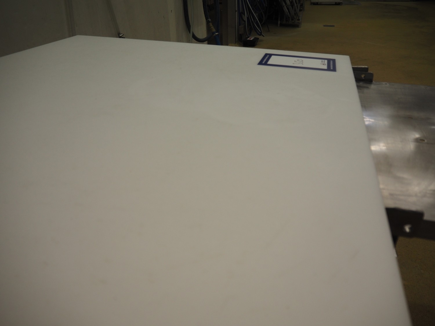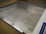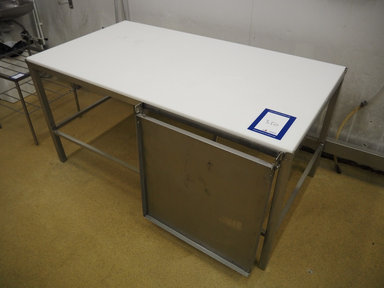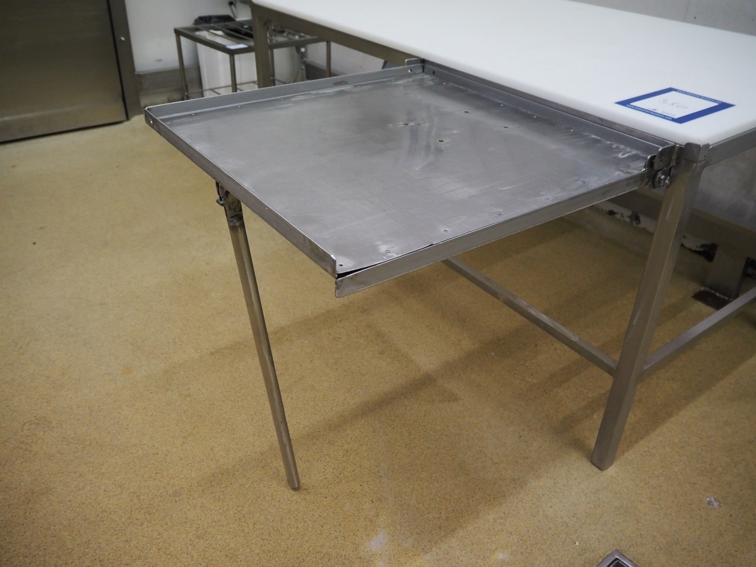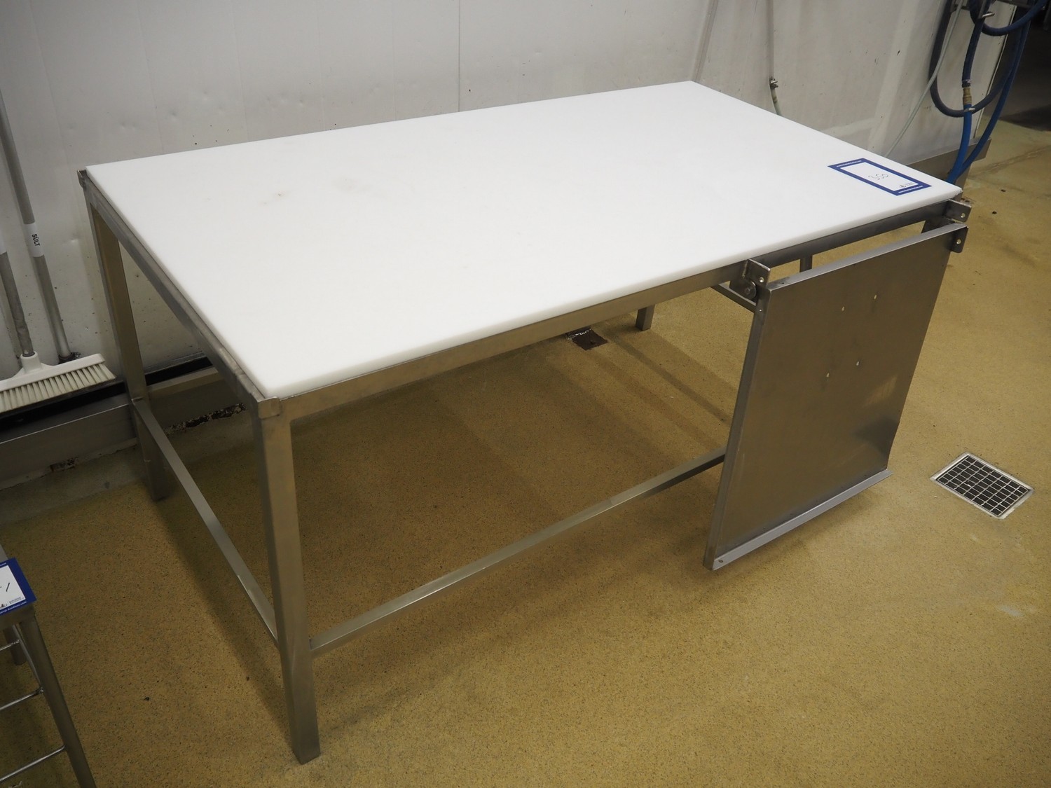 S/s table, plastic top, dimensions top: 1680 mm x 690 mm, total dimensions: 1680 mm x 1600 mm x 840 mm.