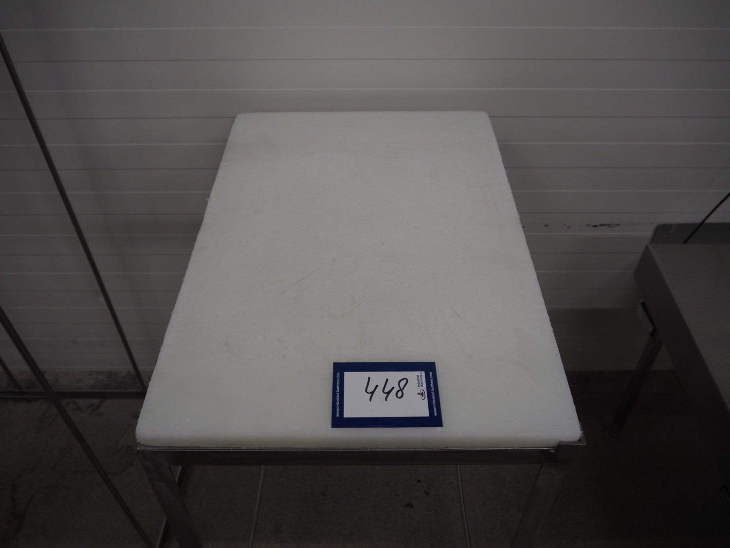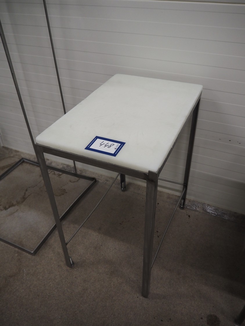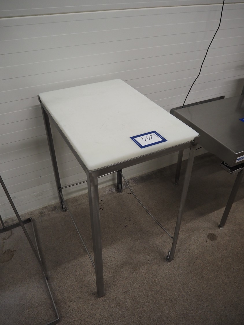 S/s table, plastic top, dimensions: 600 mm x 400 mm x 730 mm.