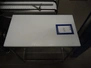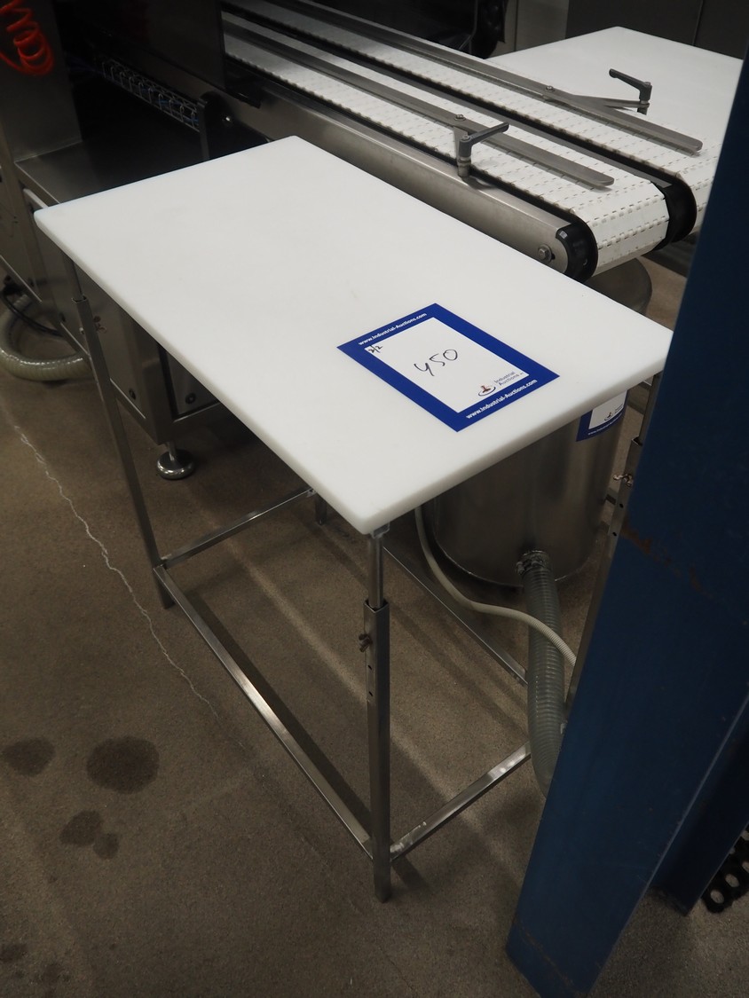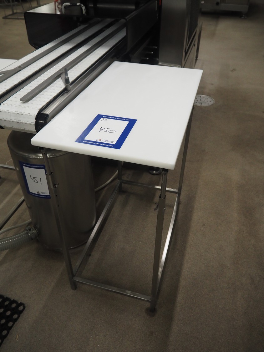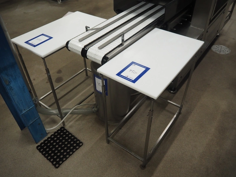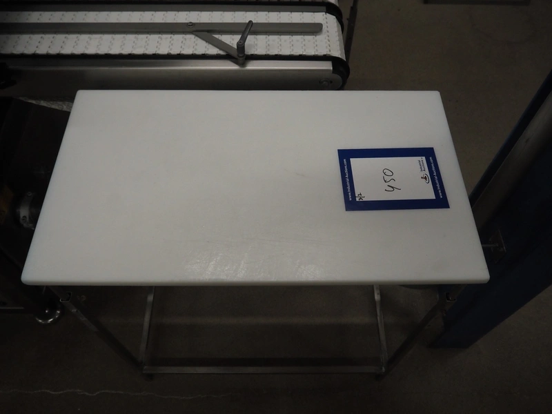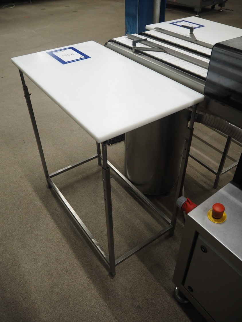 2 s/s tables, plastic tops, dimensions: (2x) 800 mm x 450 mm x 870 mm.