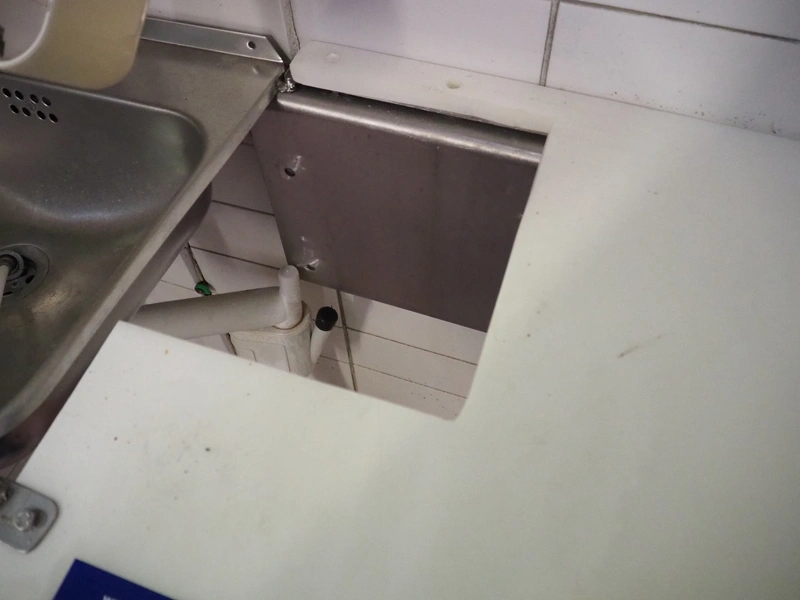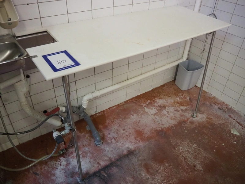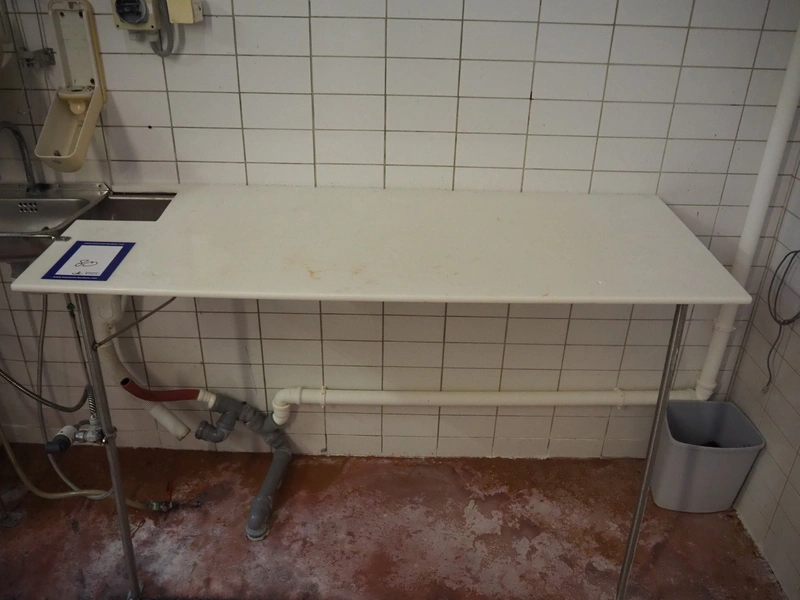 S/s wall mounted table, plastic top, dimensions: 1600 mm x 620 mm x 1000 mm.
