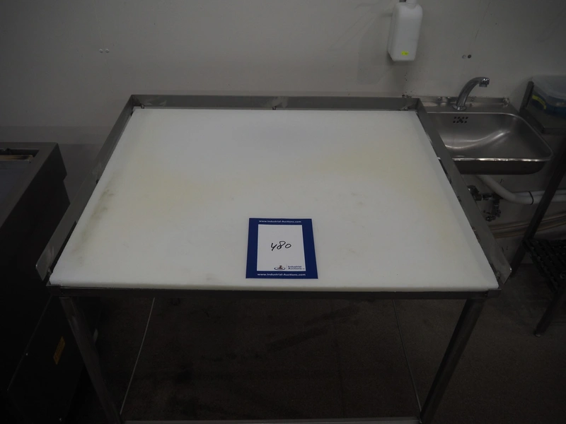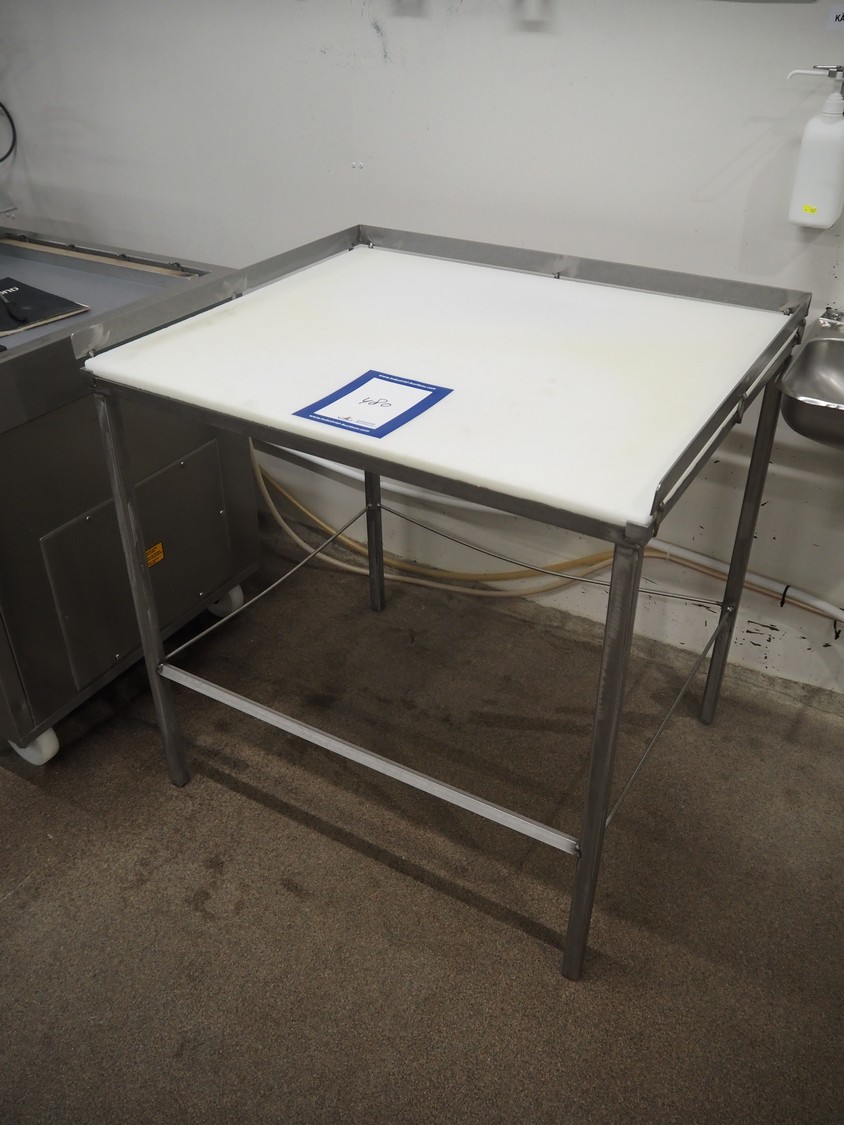 S/s table, plastic top, dimensions: 920 mm x 760 mm x 950 mm.