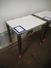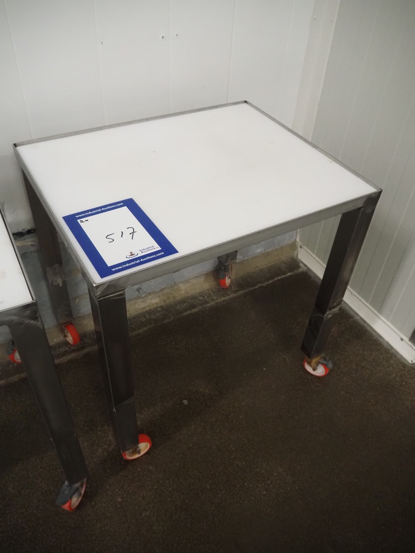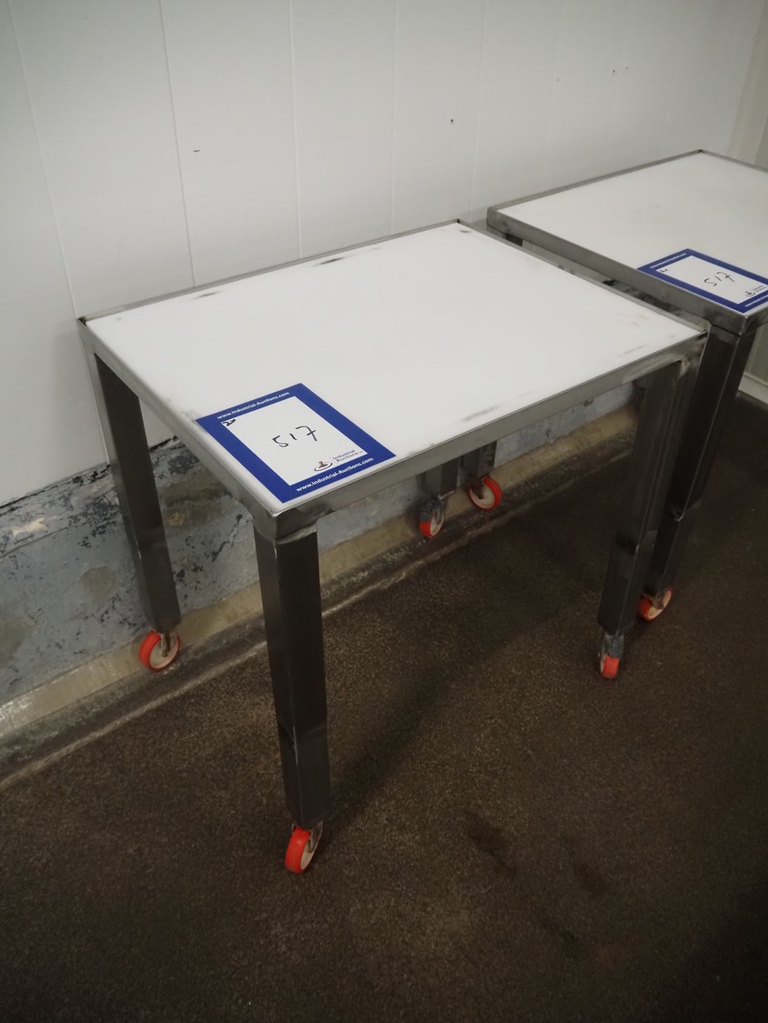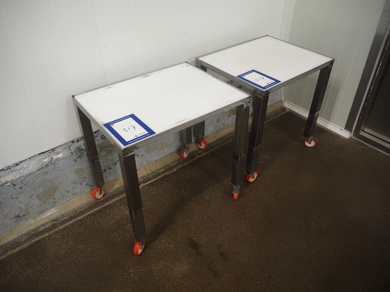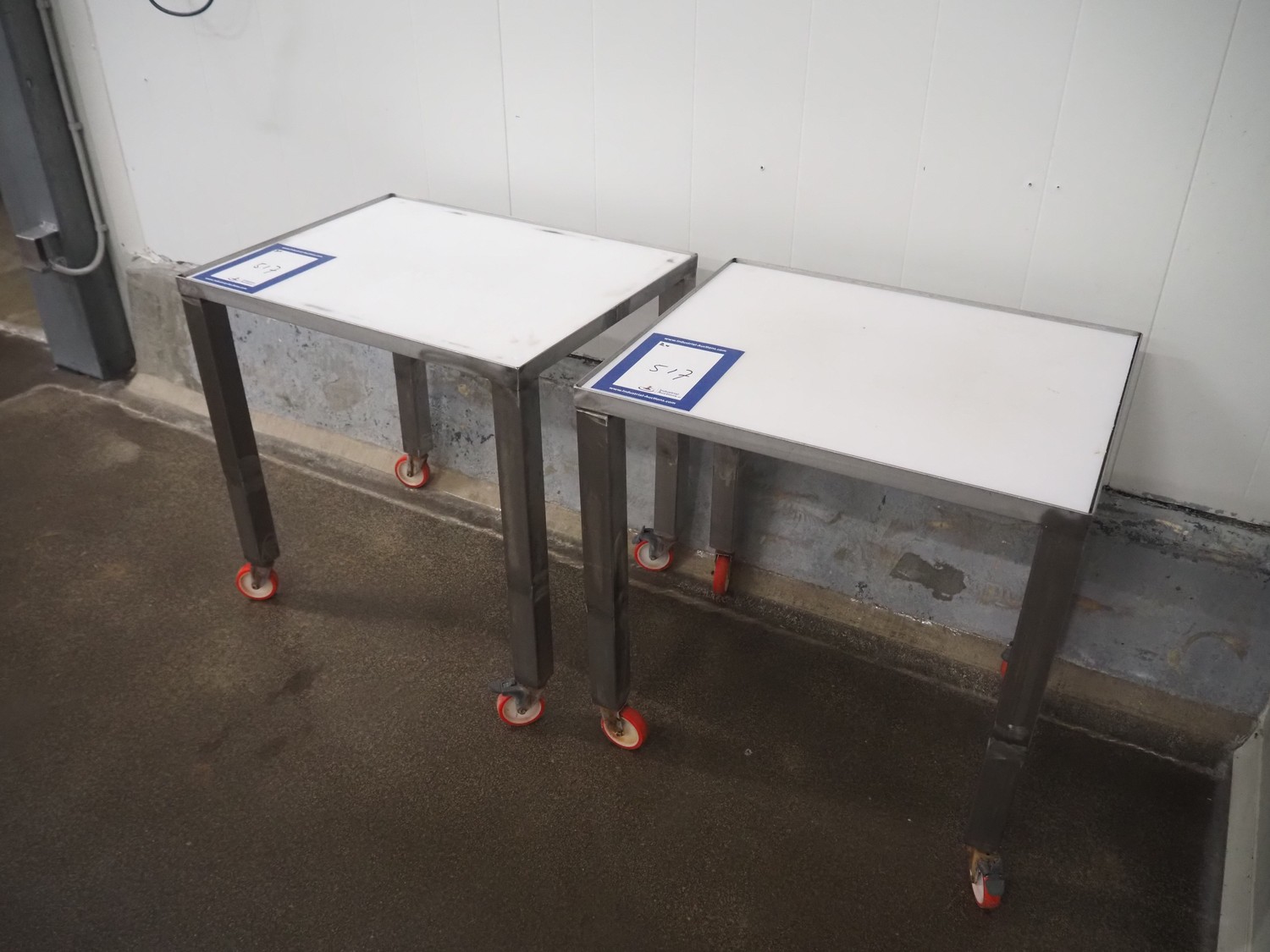 2 mobile s/s tables with plastic worktop, dimensions: (2x) 660 mm x 530 mm x 680 mm.