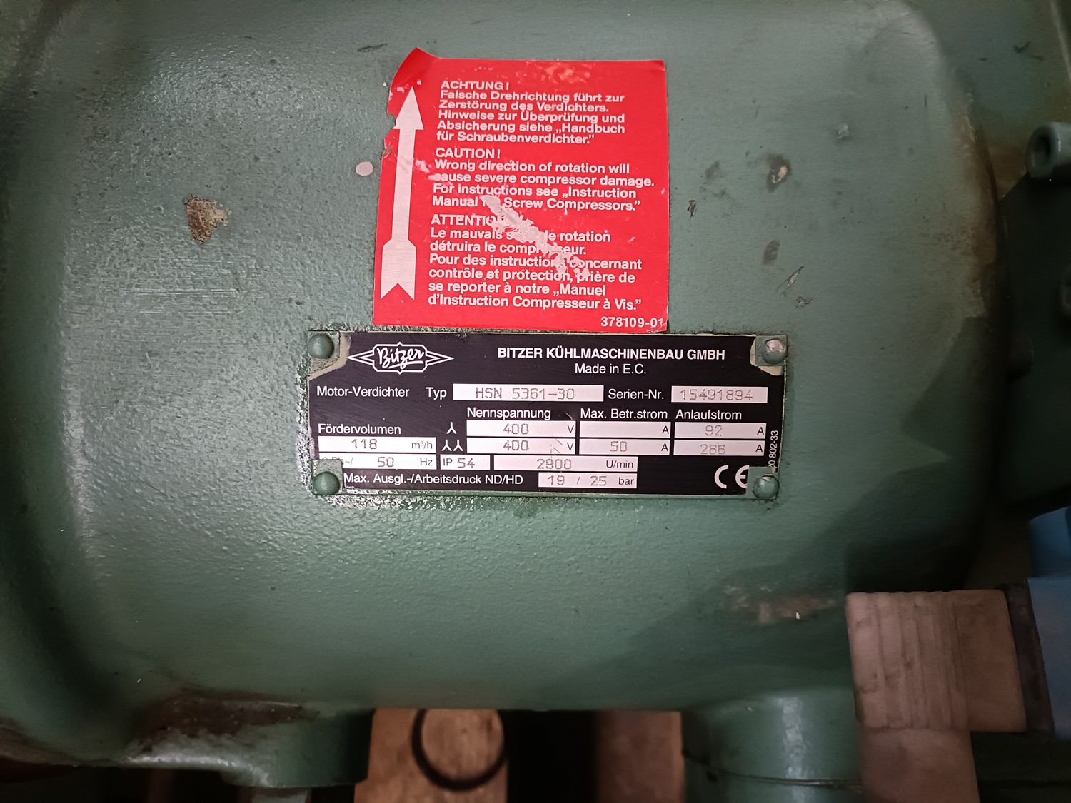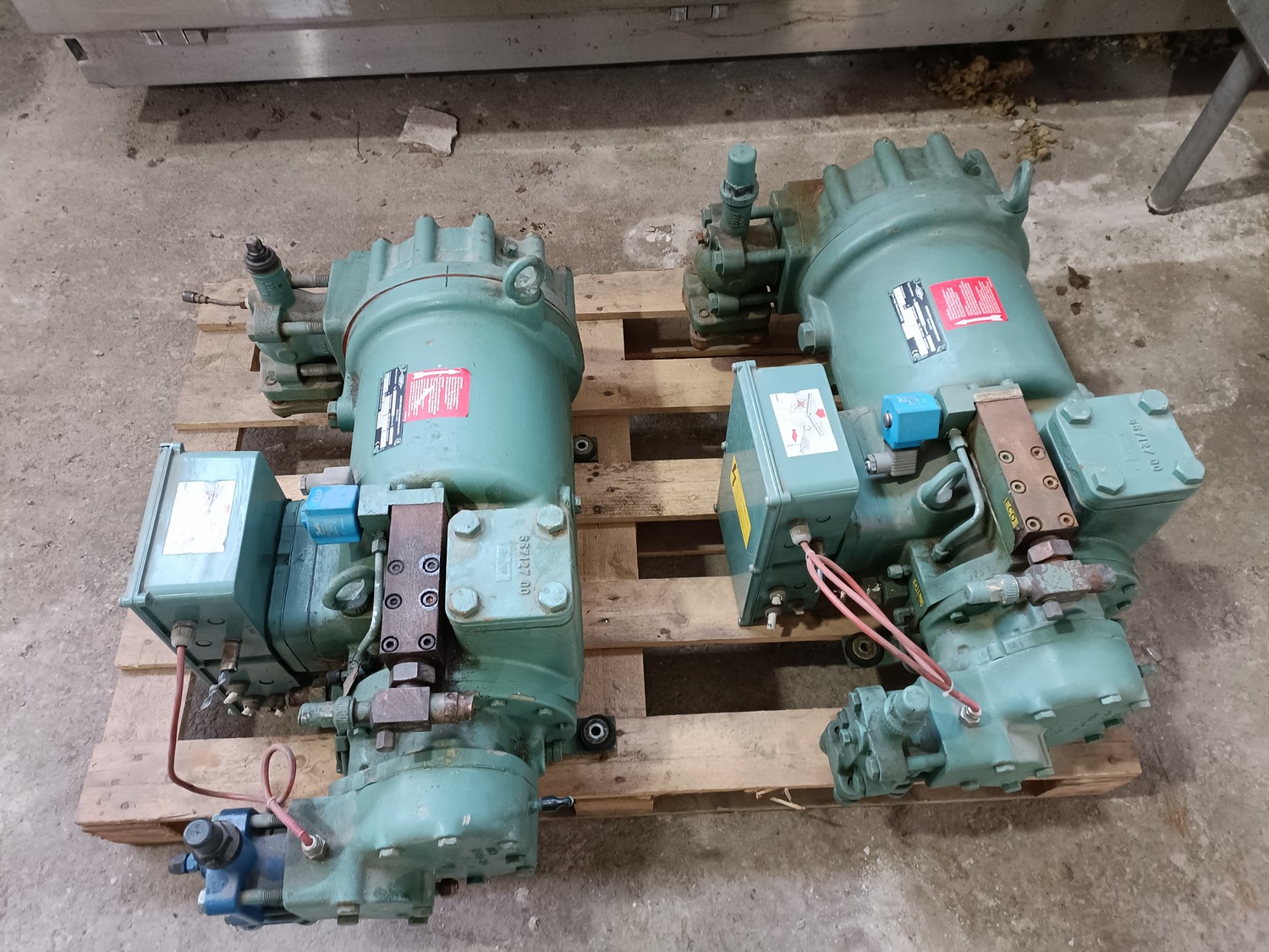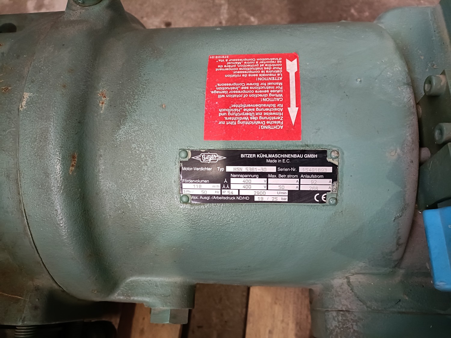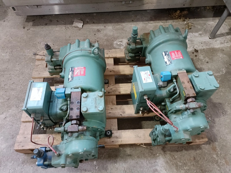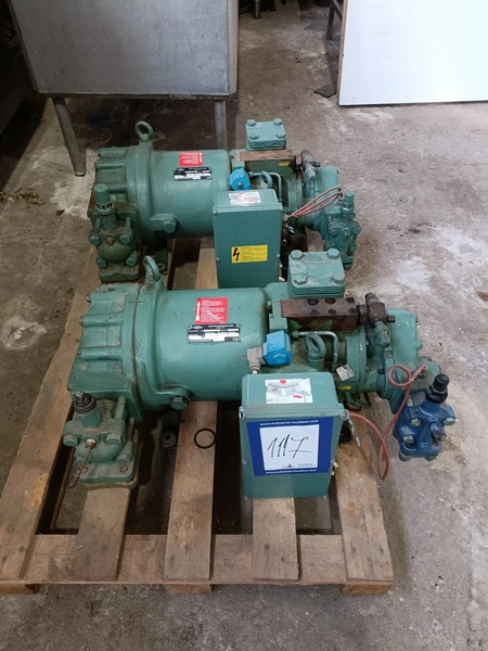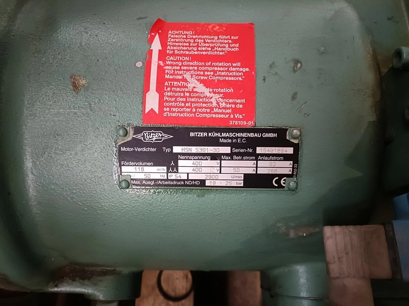 2 Bitzer Kühlmaschinenbau GmbH cooling compressors, type: HSN 5361-30, serial number: 15491894 / 15491893, 400 V, 3 Ph, 50 Hz, 92 / 266 A, volume: 118 m³ per hour, dimensions: (2x) 760 mm x 430 mm x 320 mm.