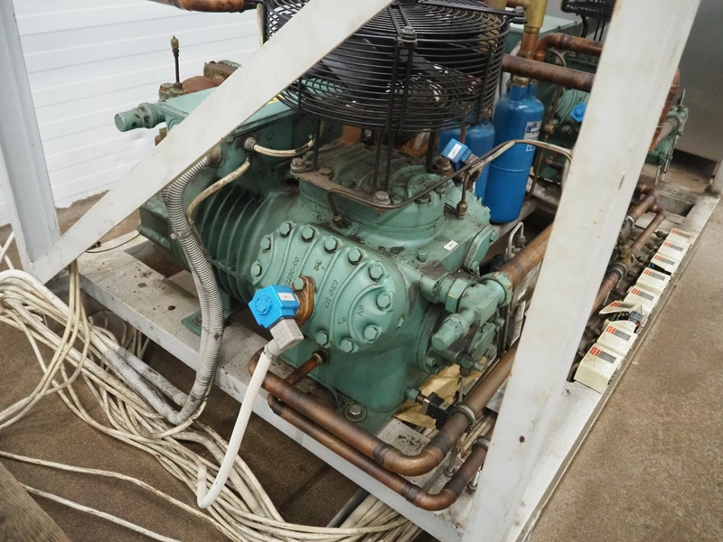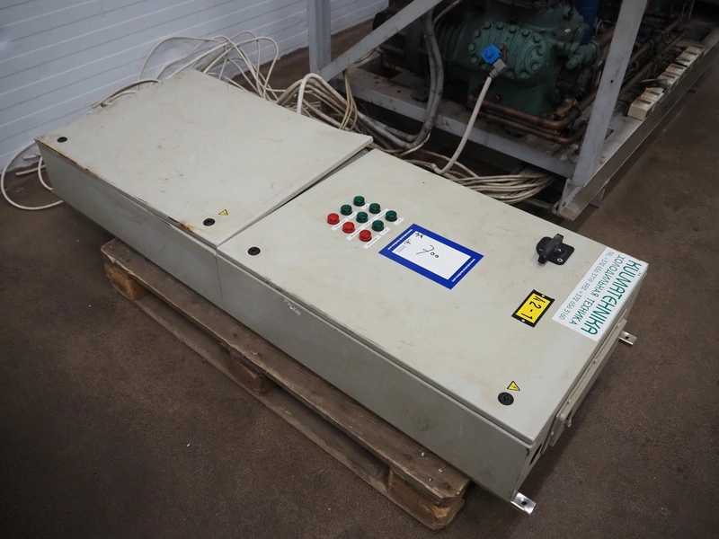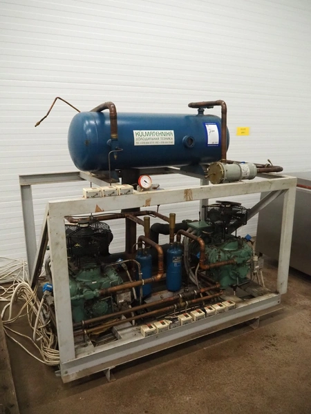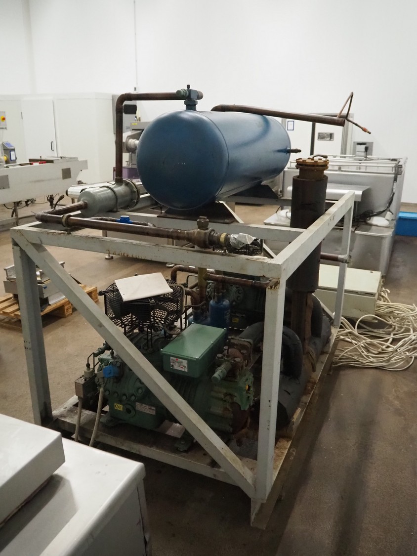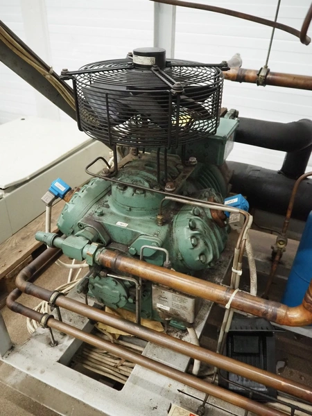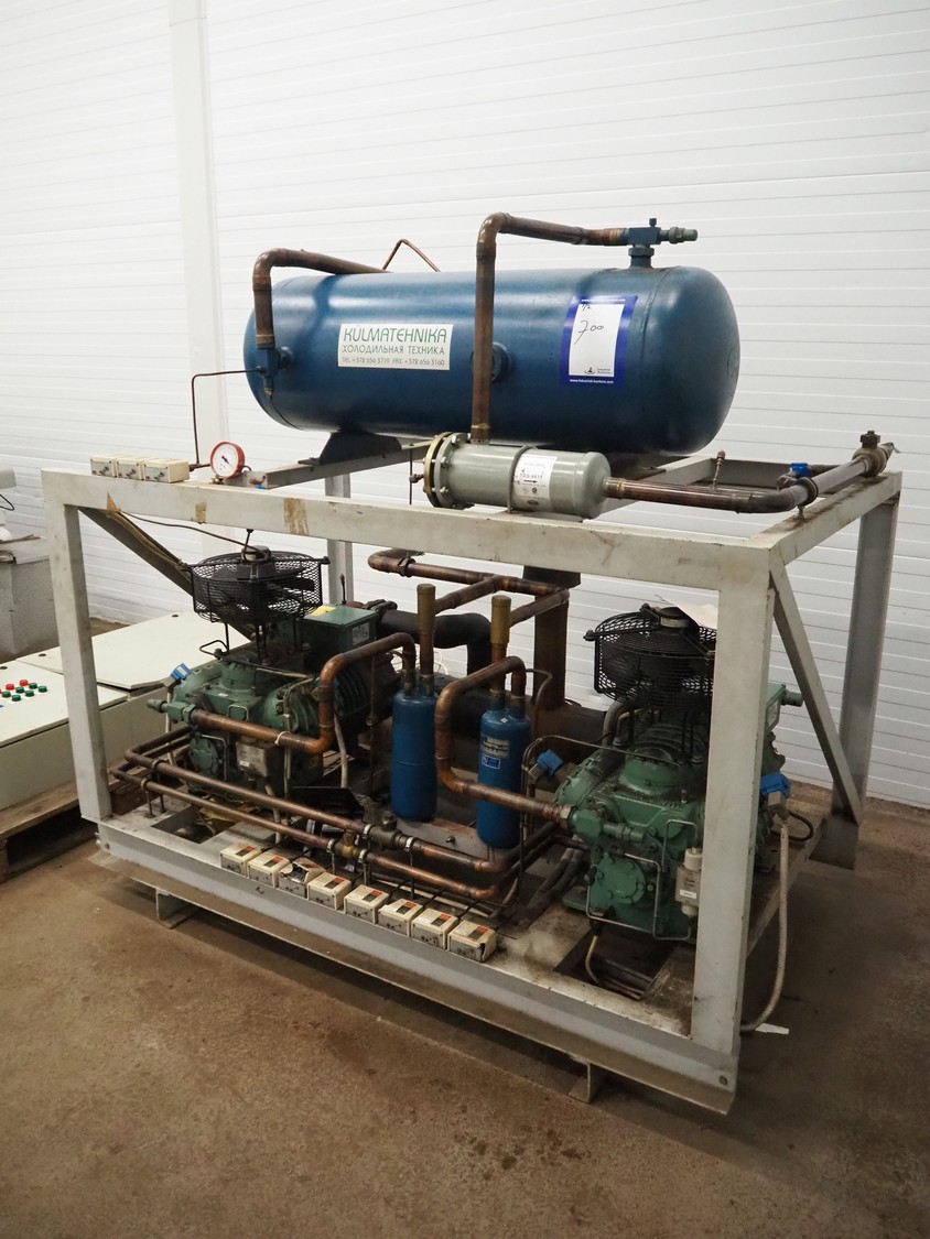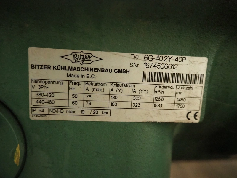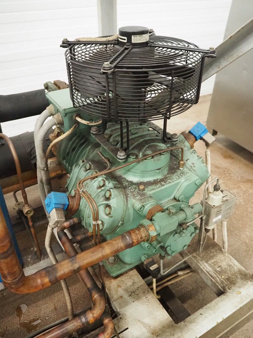 Cooling compressor rack with 2 Bitzer Kühlmaschinenbau GmbH cooling compressors, type: 6G-40.2Y-40P, Q: 126.8/153.1m³/h and 6G-40.2, Q: 126.8 m³/h, dimensions rack: 1800 mm x 1120 mm x 1750 mm, including switch cabinet, dimensions: 600 mm x 250 mm x 1600 mm.