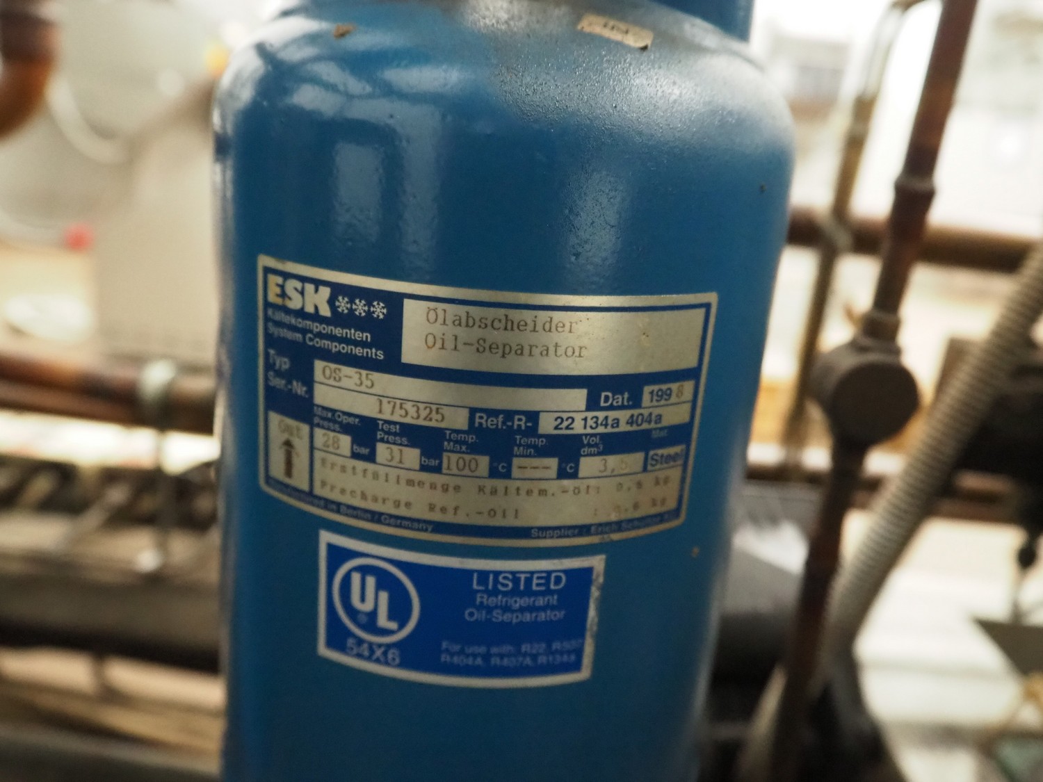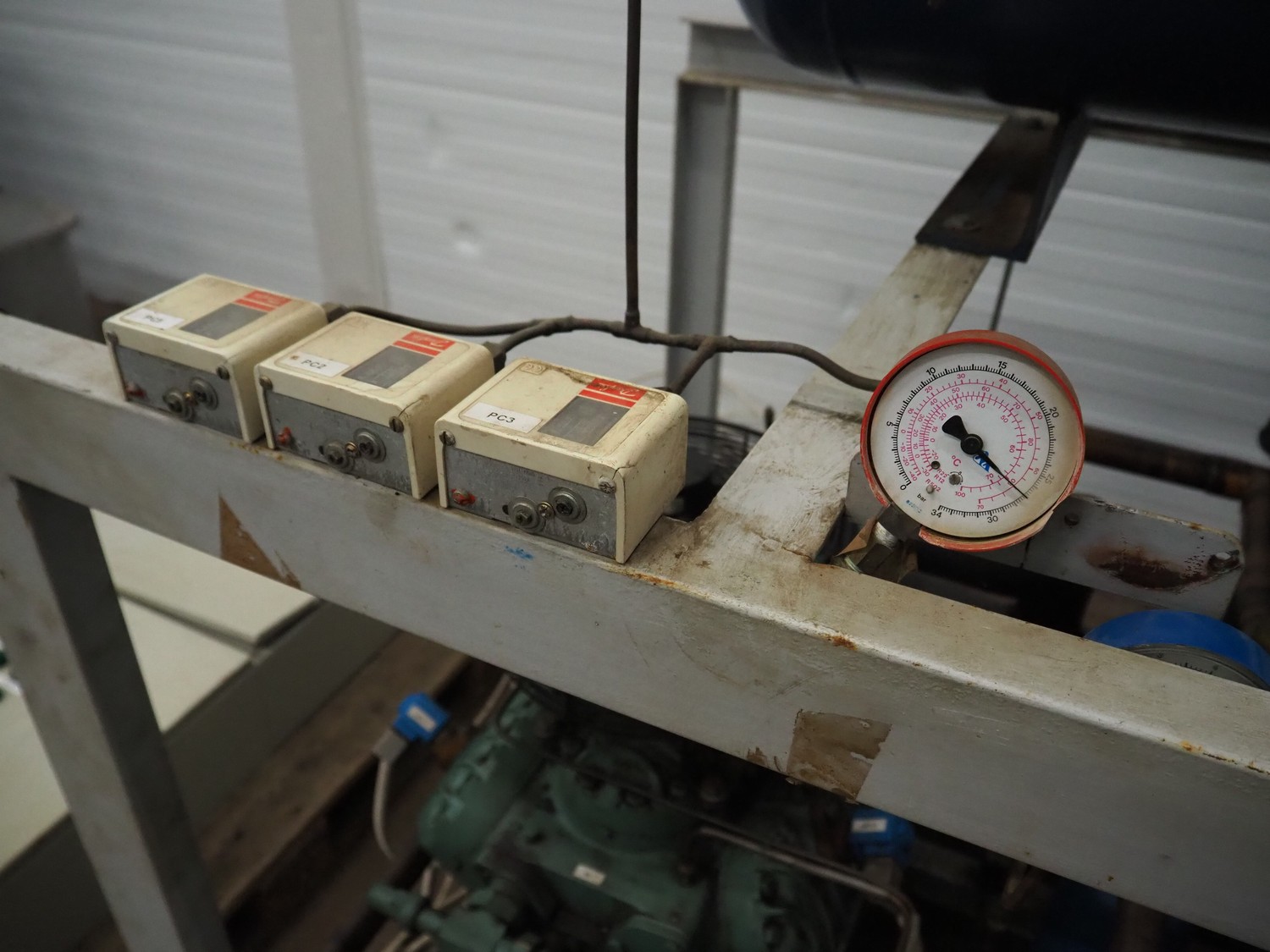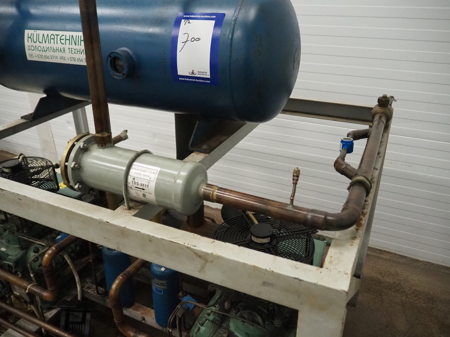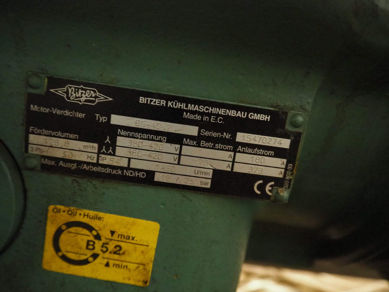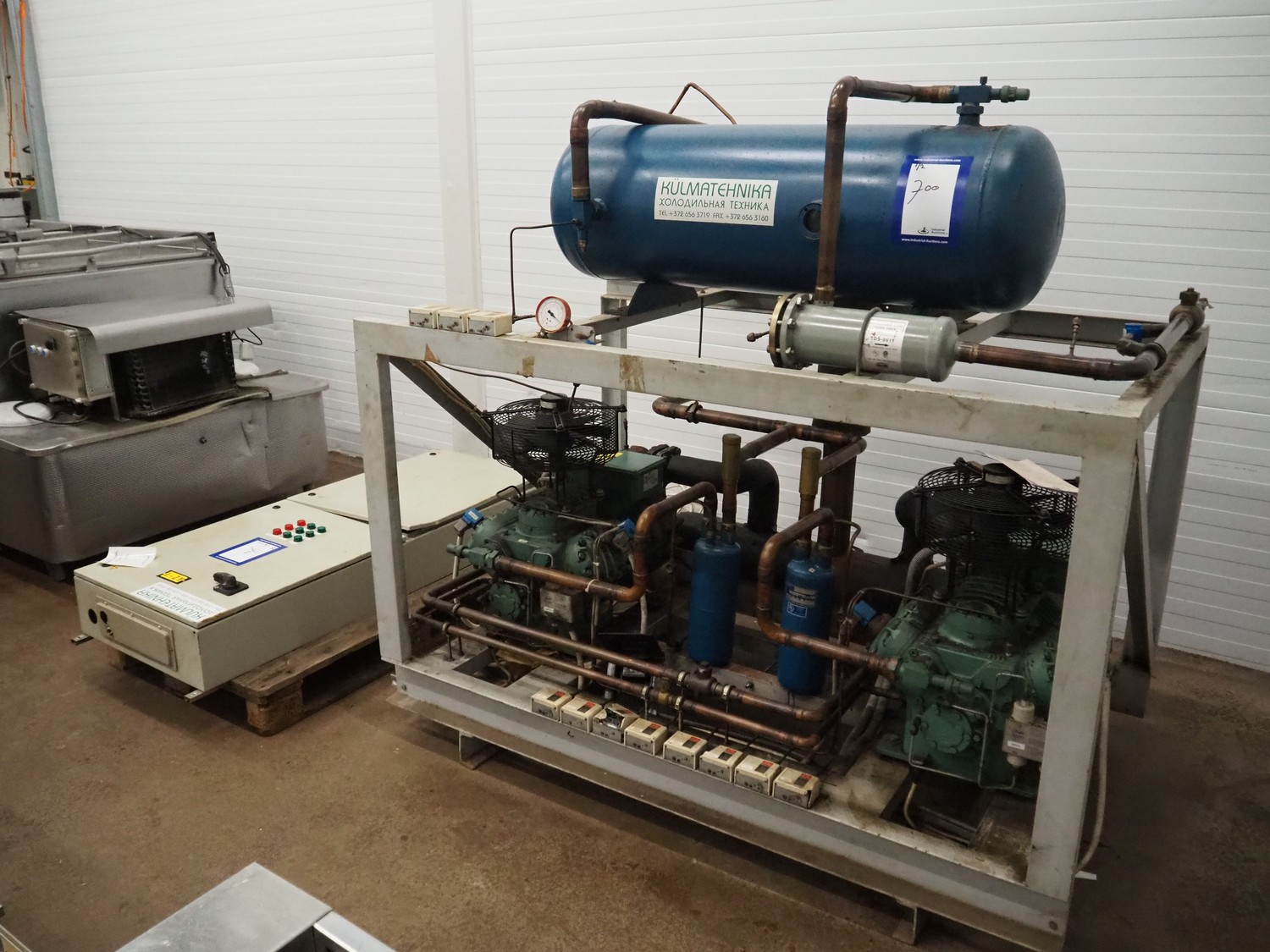Cooling compressor rack with 2 Bitzer Kühlmaschinenbau GmbH cooling compressors, type: 6G-40.2Y-40P, Q: 126.8/153.1m³/h and 6G-40.2, Q: 126.8 m³/h, dimensions rack: 1800 mm x 1120 mm x 1750 mm, including switch cabinet, dimensions: 600 mm x 250 mm x 1600 mm.