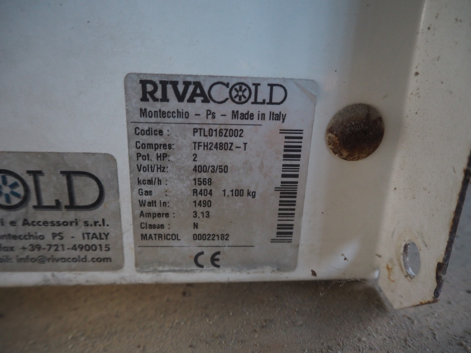Rivacold refrigeration unit for cooling cell, type: PTL016Z002, number: 00022182, 400 V, 3 Ph, 50 Hz, 3.13 A, 1490 W, refrigerant: R404, dimensions: 1050 mm x 630 mm x 750 mm.