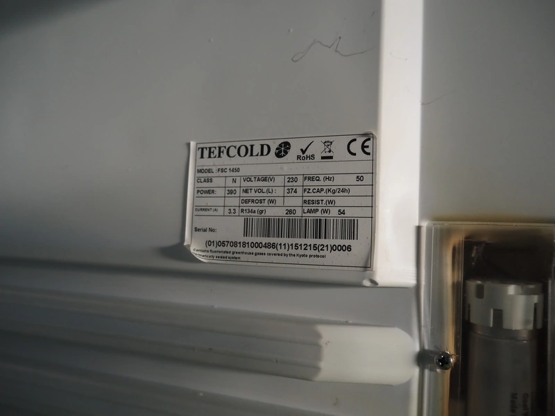 Tefcold refrigerator, model: FSC 1450, 230 V, 50 Hz, 390 W, refrigerant: R134a/260 gram, net volume: 374 kg, dimensions: 680 mm x 670 mm x 2090 mm.
