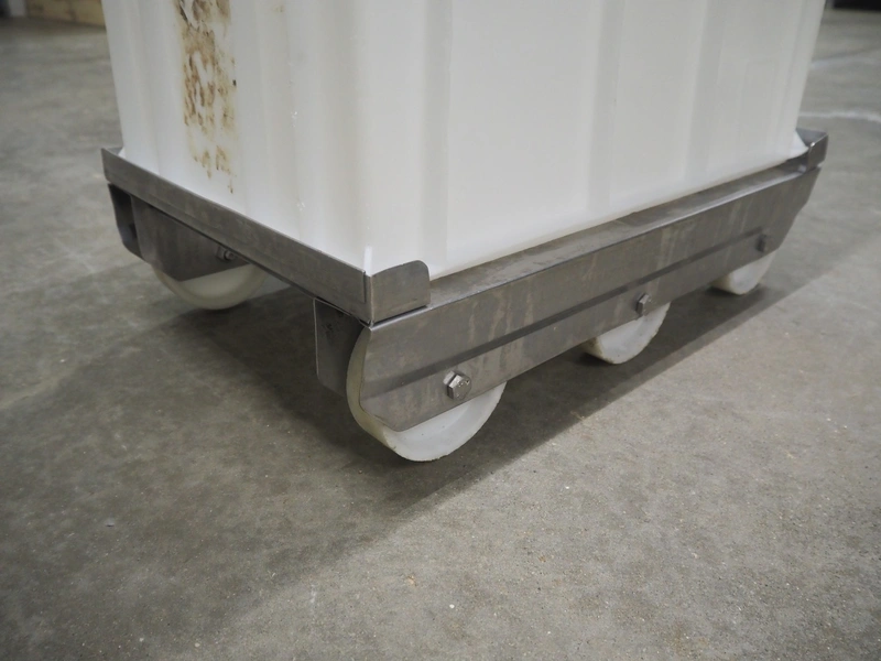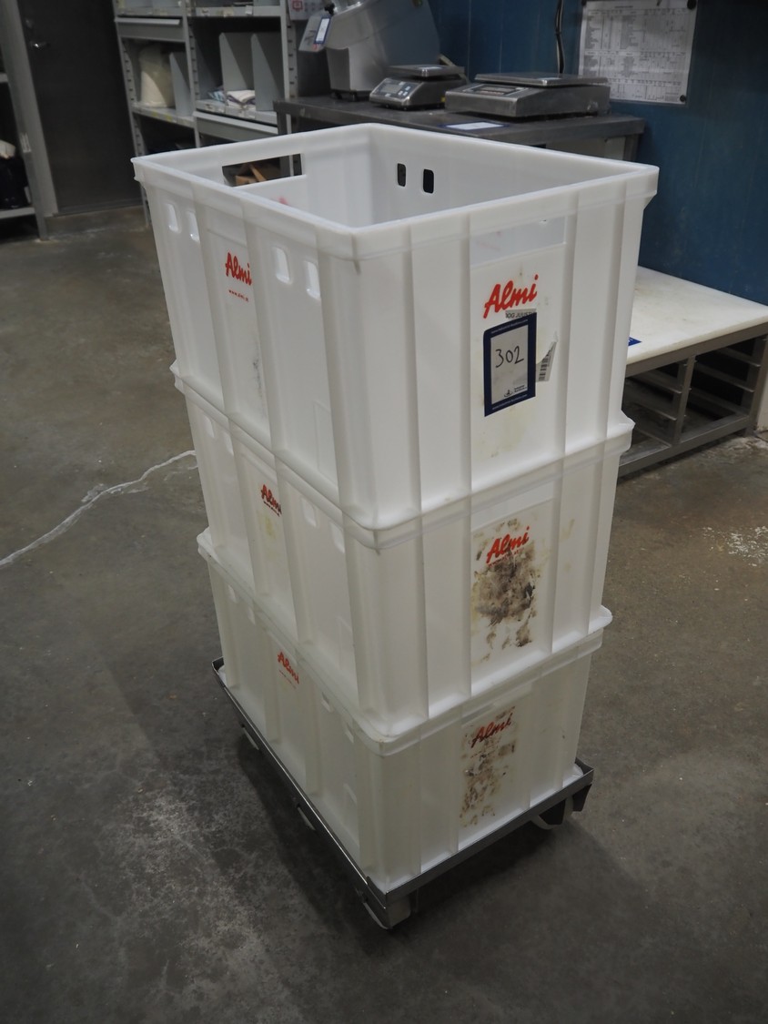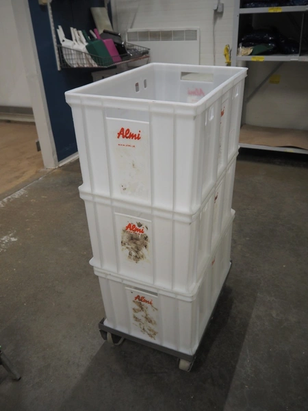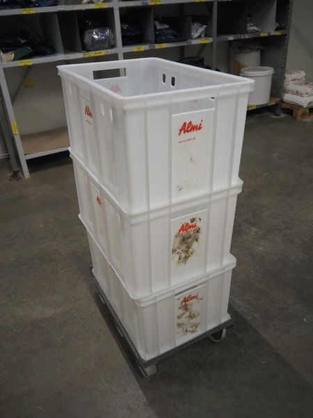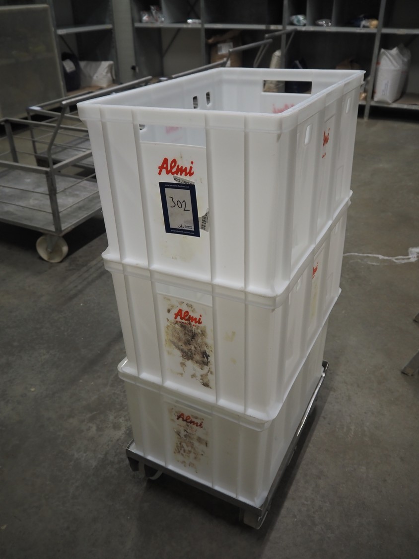 S/s rollie with 3 plastic crates, dimensions rollie: 610 mm x 410 mm x 130 mm, dimensions crates: (3x) 600 mm x 400 mm x 310 mm.
