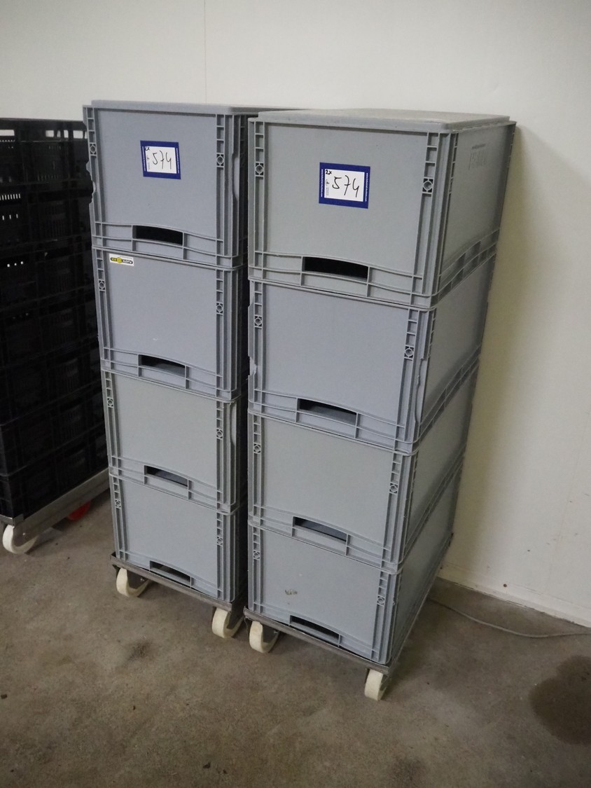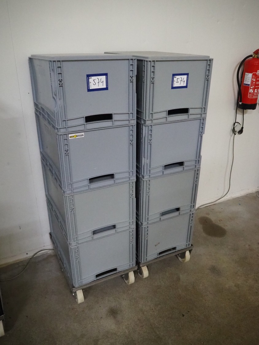 2 s/s rollies with 8 plastic crates, dimensions crates: 600 mm x 400 mm x 300 mm.