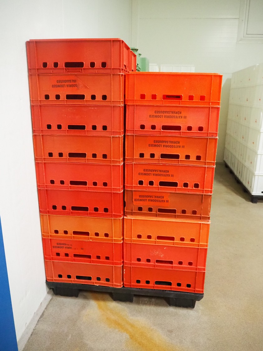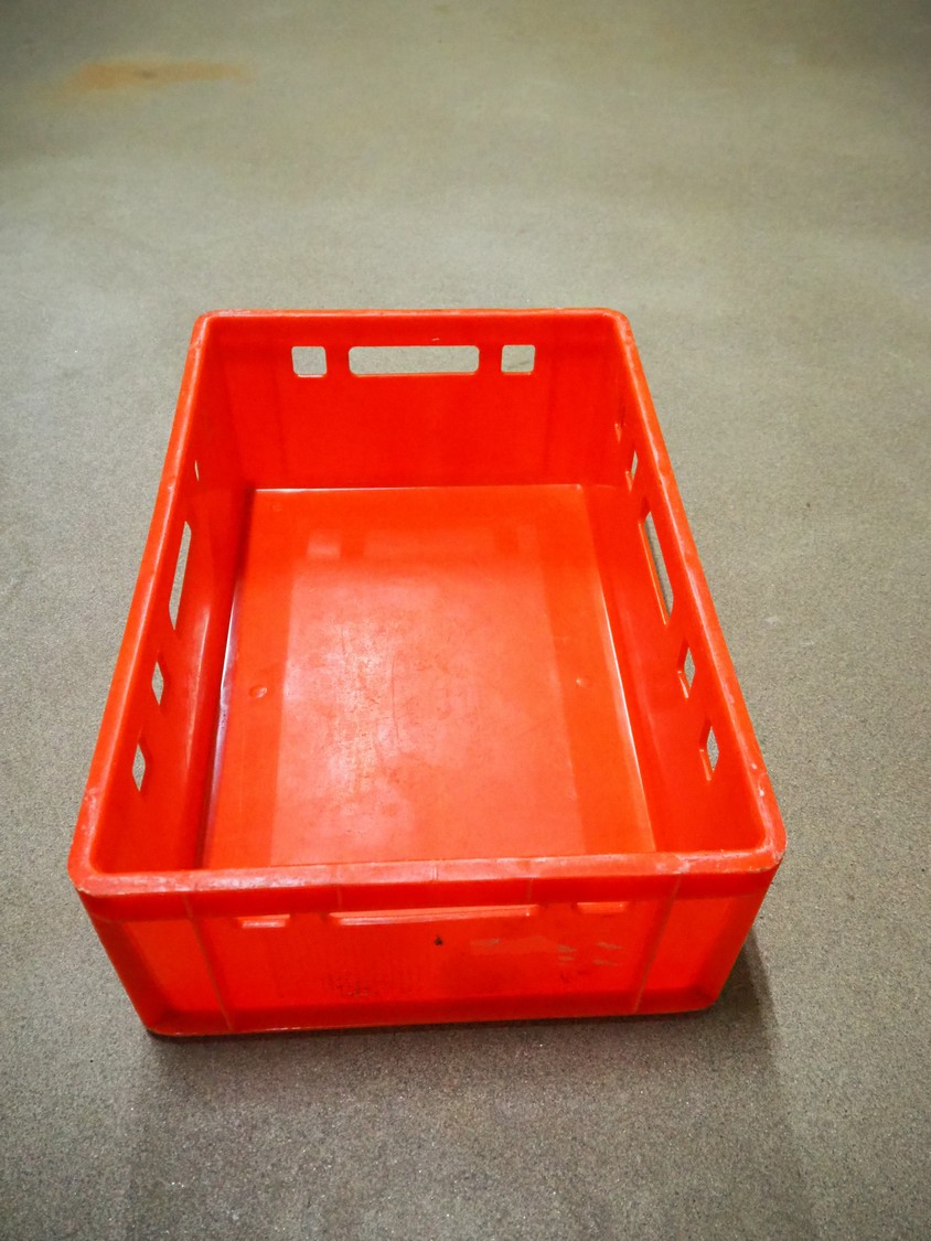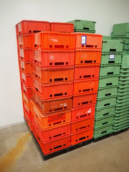 Pallet approximately 34 plastic crates, dimensions crates: 600 mm x 400 mm x 170 mm.