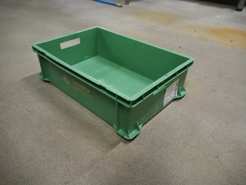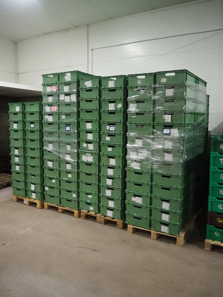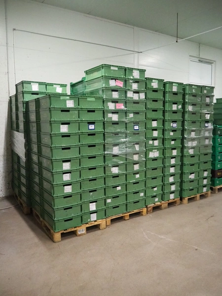 9 pallets with approximately 370 plastic crates, dimensions crates: 600 mm x 400 mm x 170 mm.