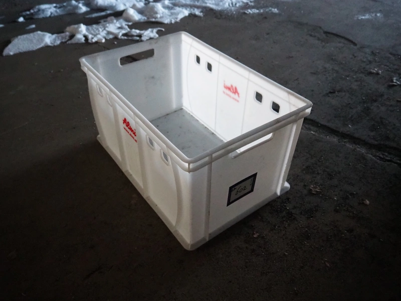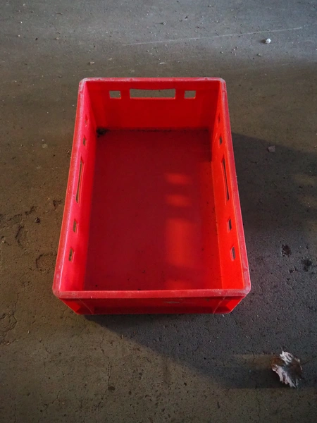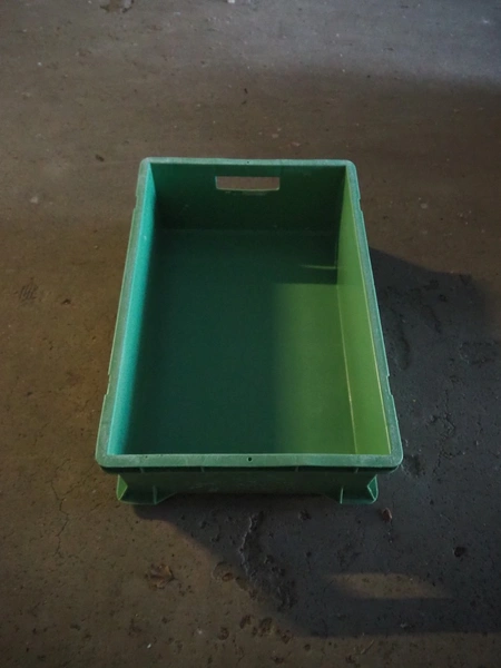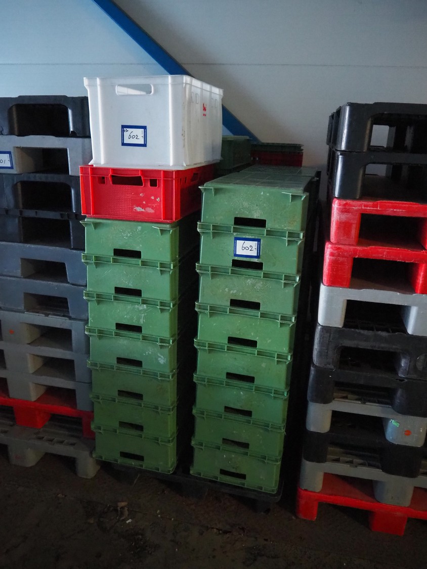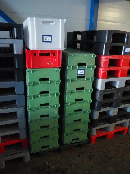 Pallet with approximately 43 plastic crates, dimensions crates: 600 mm x 400 mm x 170 mm.