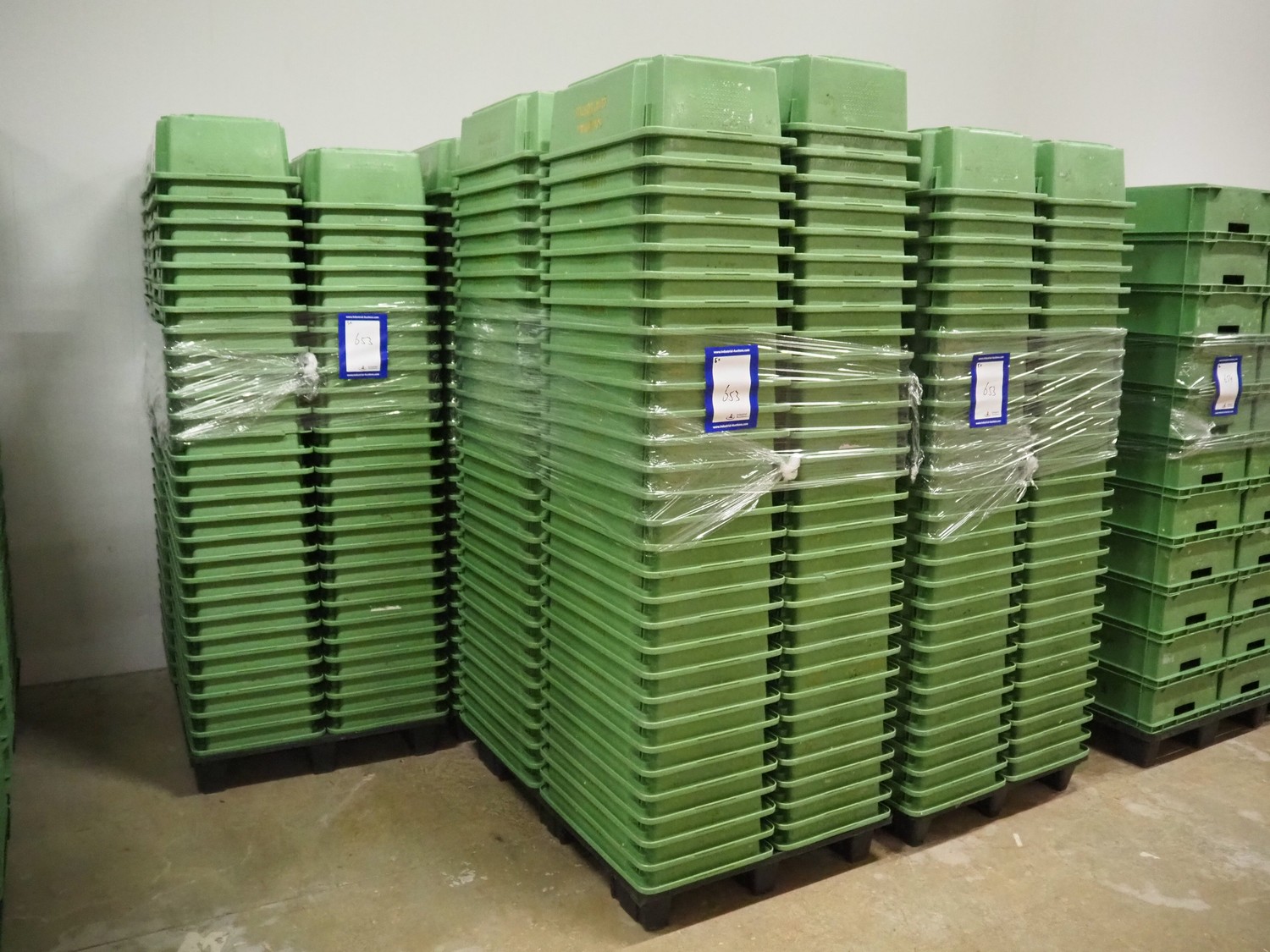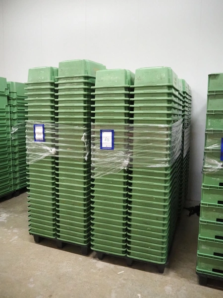 5 pallets with approximately 580 plastic crates, dimensions crates: 600 mm x 400 mm x 180 mm.