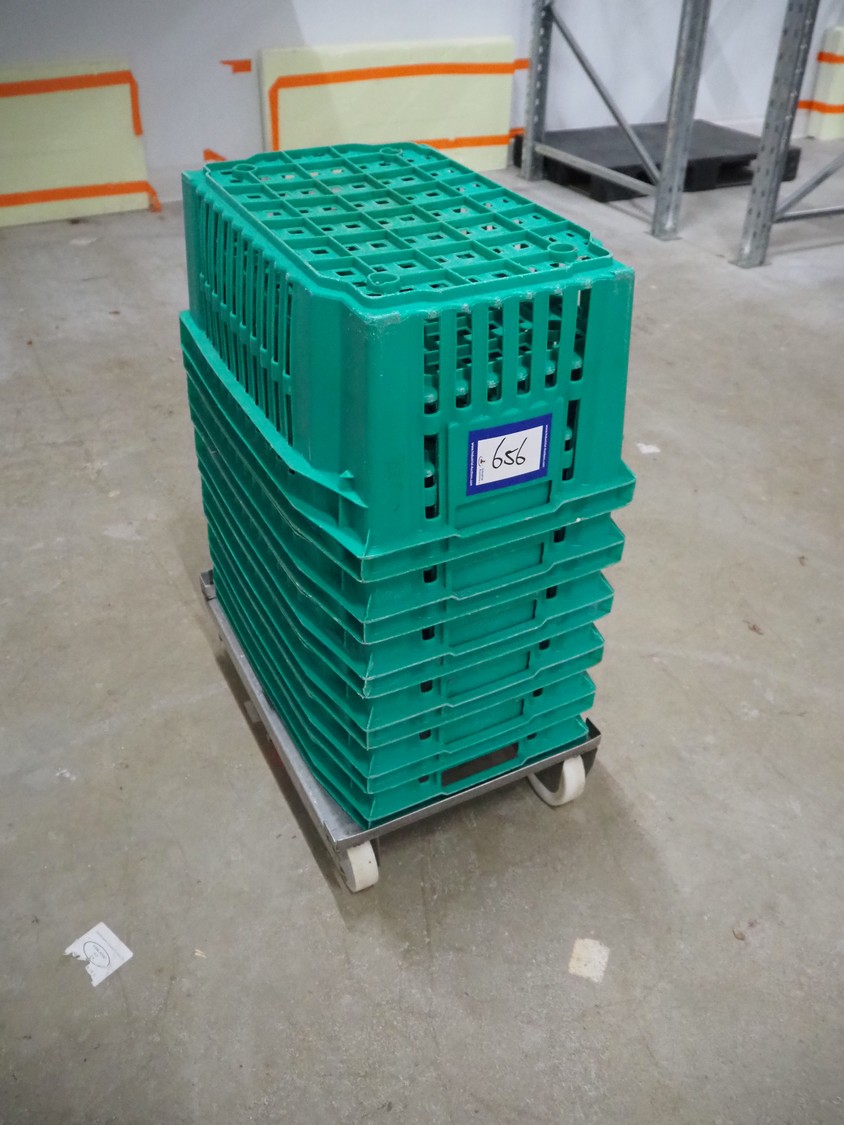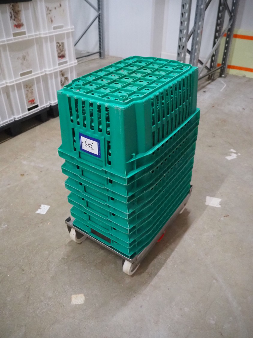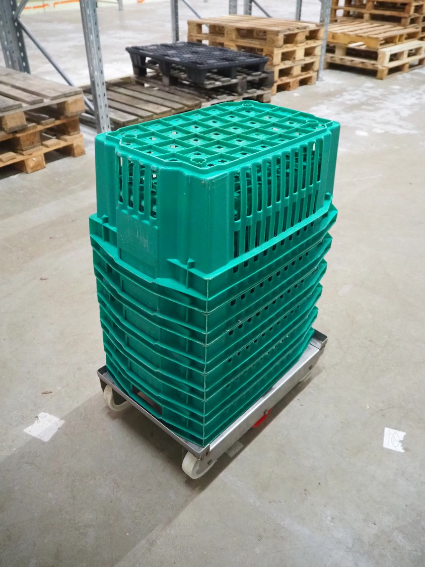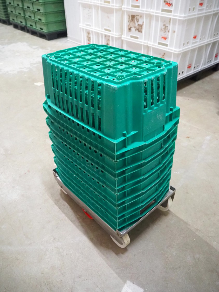 S/s rollie with 6 plastic crates, dimensions crates: 600 mm x 400 mm x 280 mm.