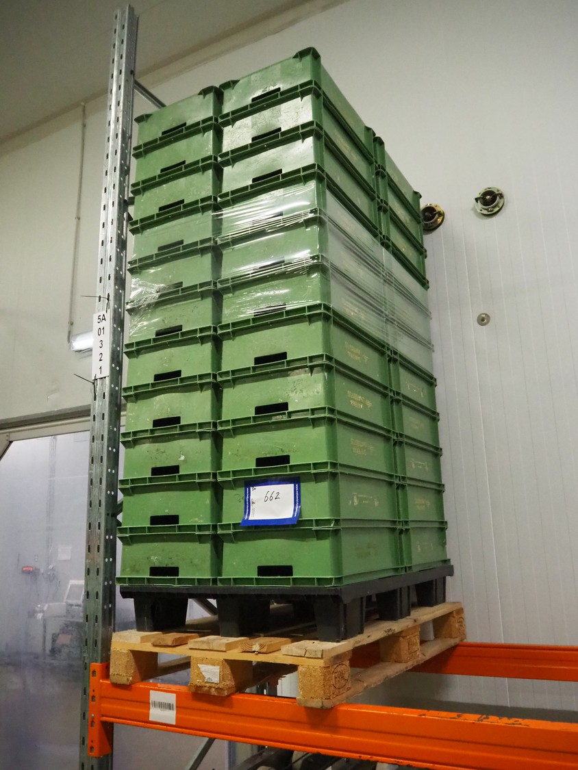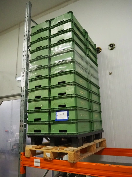3 pallets with approximately 132 plastic crates, dimensions crates: 600 mm x 400 mm x 170 mm.