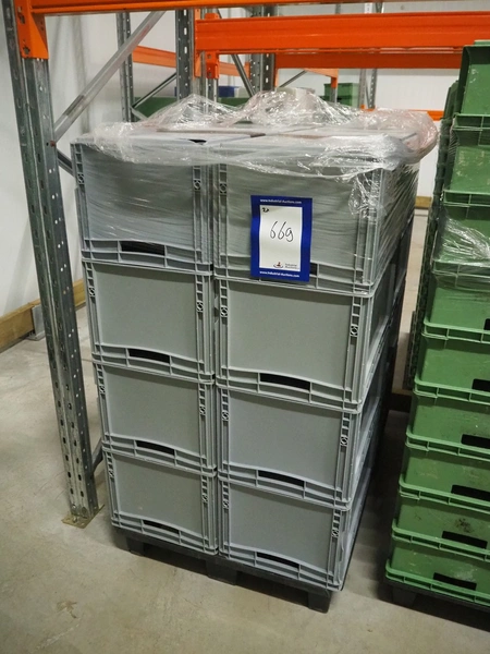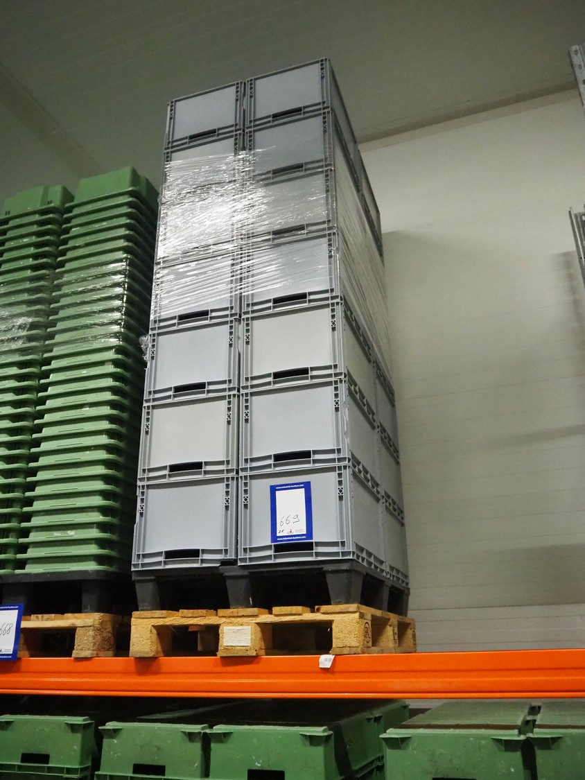 2 pallets with approximately 44 plastic crates, dimensions crates: 600 mm x 400 mm x 320 mm.