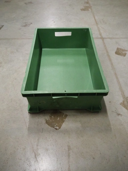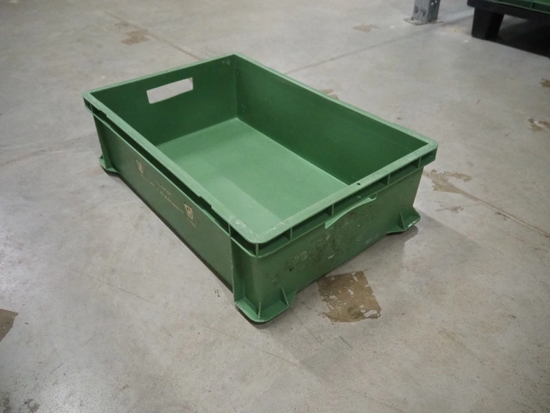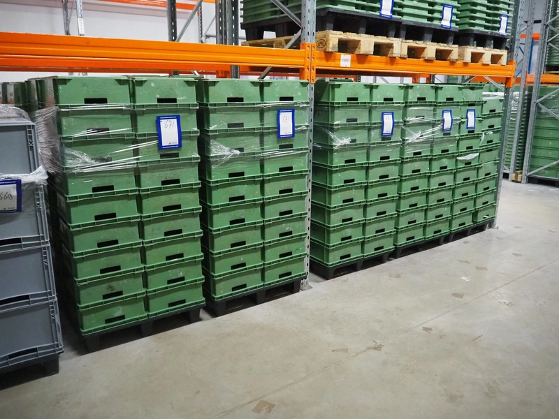 6 pallets with approximately 200 plastic crates, dimensions crates: 600 mm x 400 mm x 170 mm.