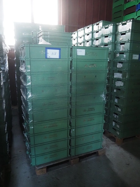 8 pallets with approximately 448 plastic crates, dimensions crates: 600 mm x 400 mm x 170 mm.