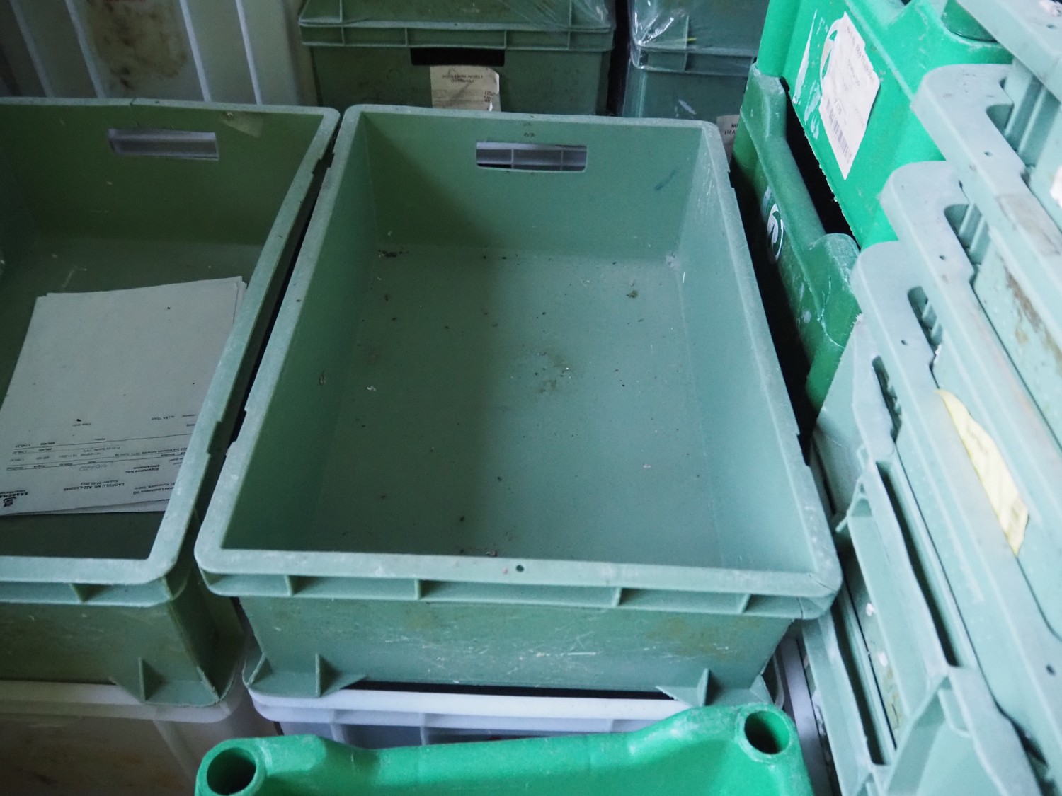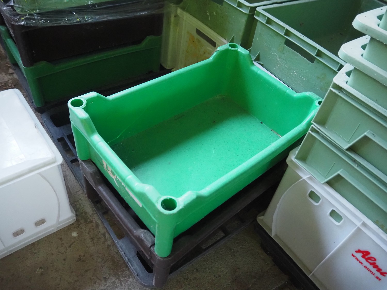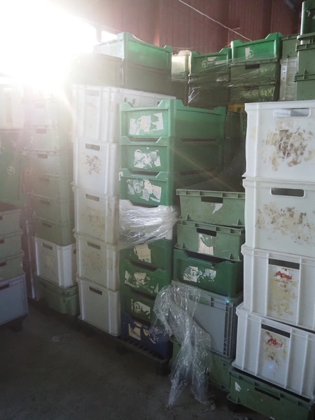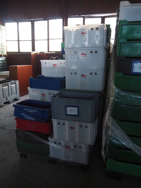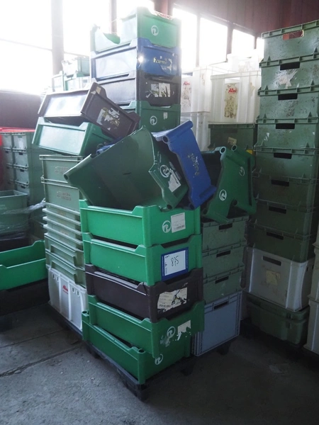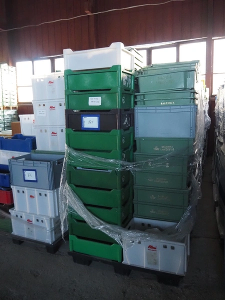 20 pallets with approximately 600 plastic crates, dimensions crates: 600 mm x 400 mm x 170 mm 600 mm x 400 mm x 180 mm and 600 mm x 400 mm x 320 mm.