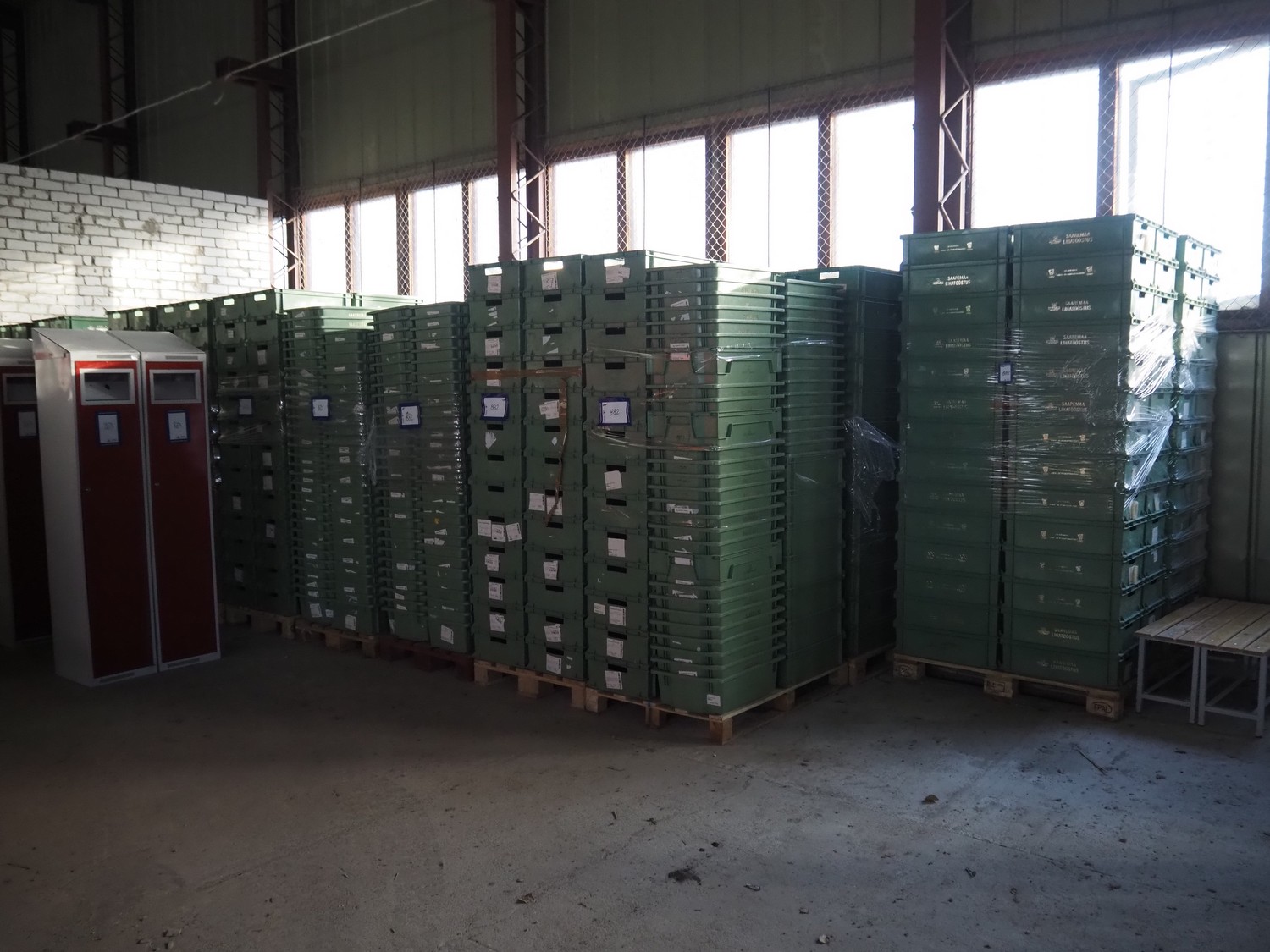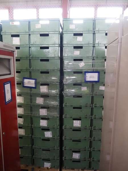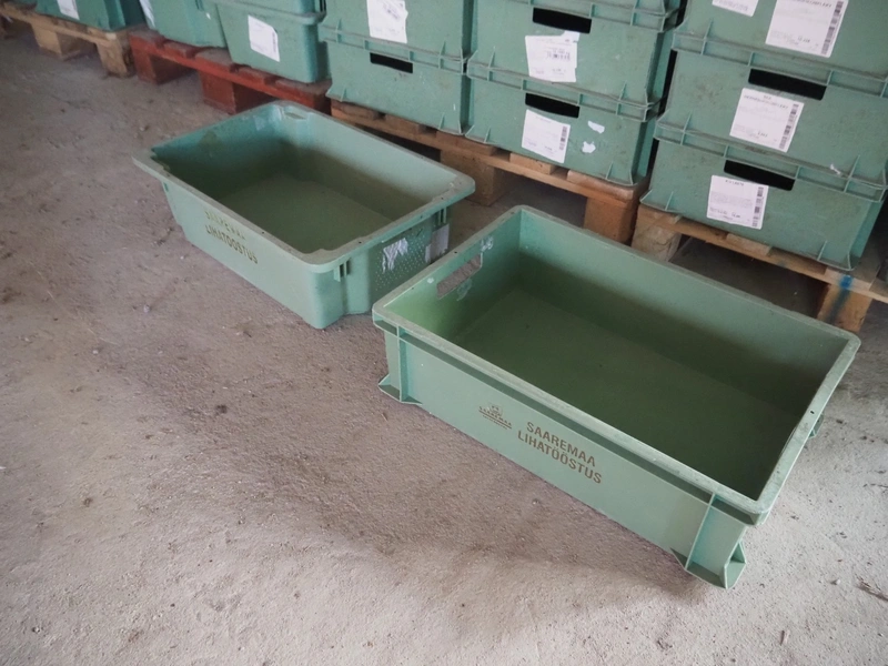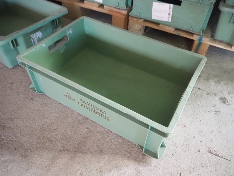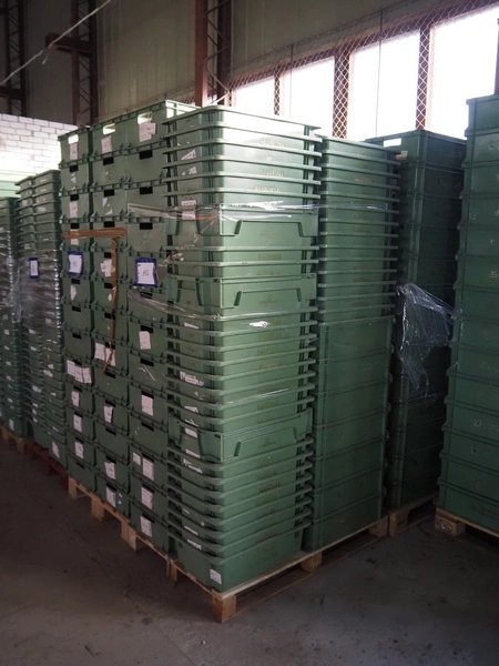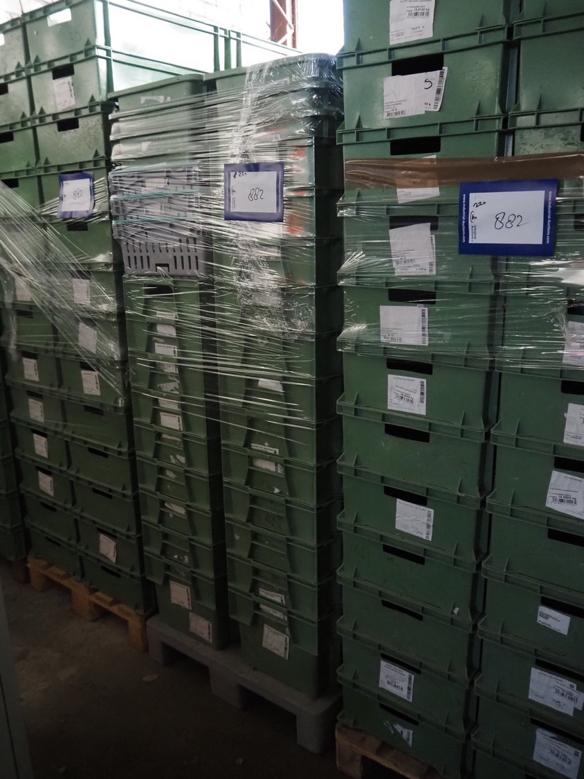 22 pallets with approximately 1200 plastic crates, dimensions crates: 600 mm x 400 mm x 170 and 600 mm x 400 mm x 180 mm.
