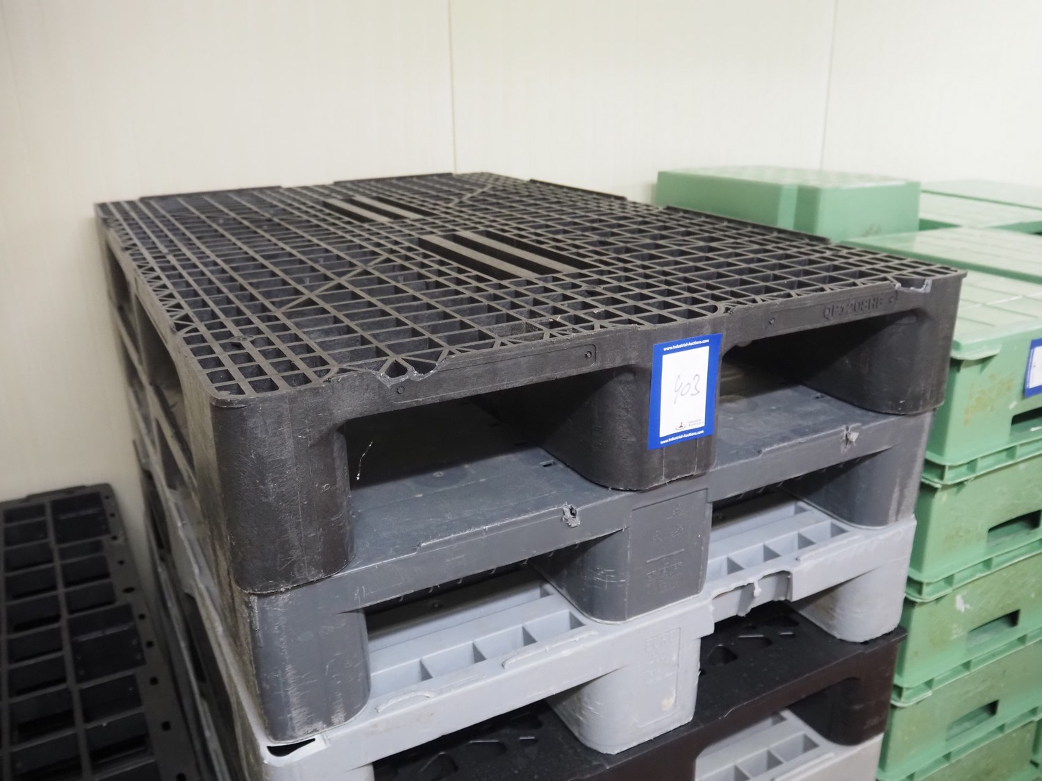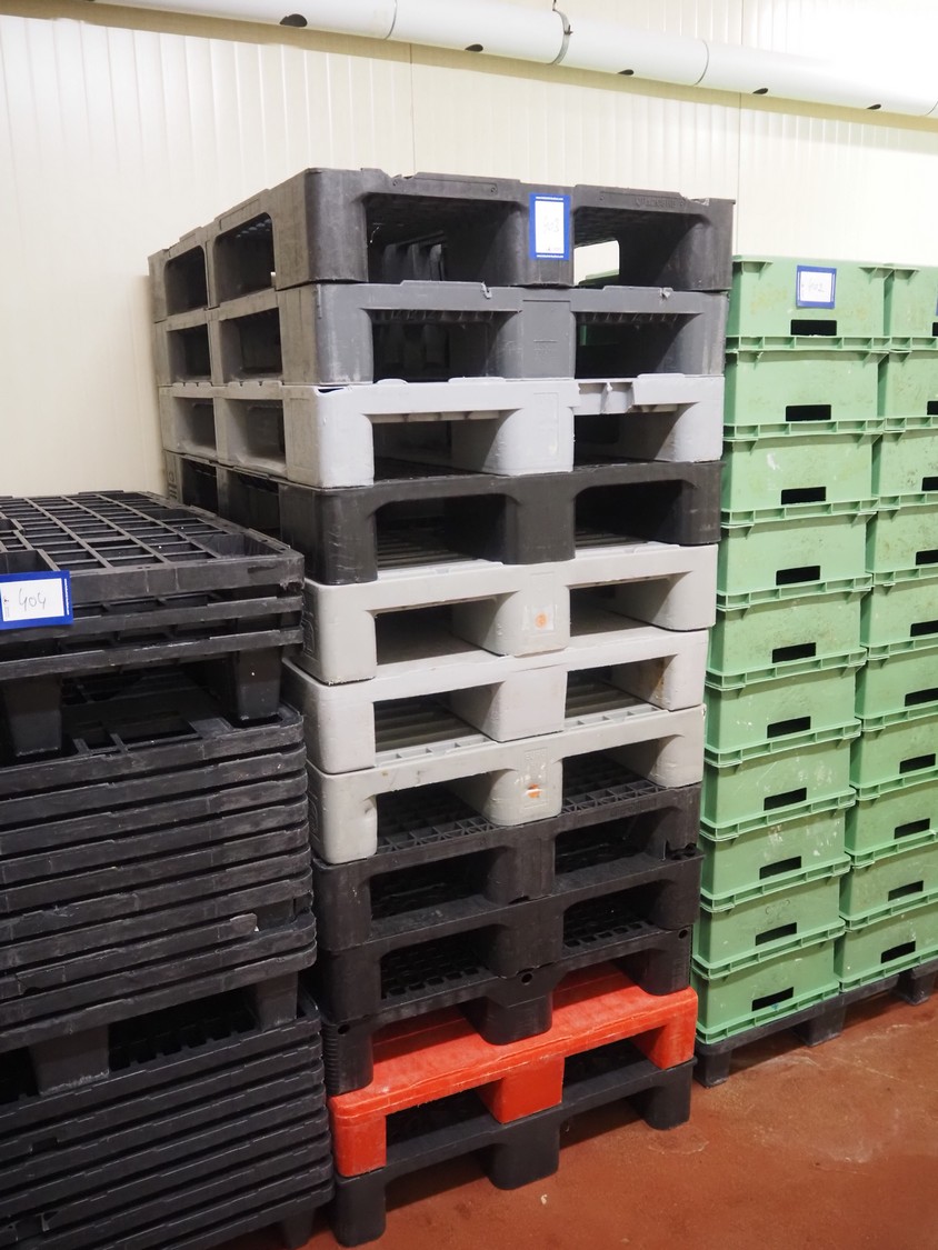 12 plastic Euro H1 pallets, dimensions: (12x) 1200 mm x 800 mm x 155 mm.