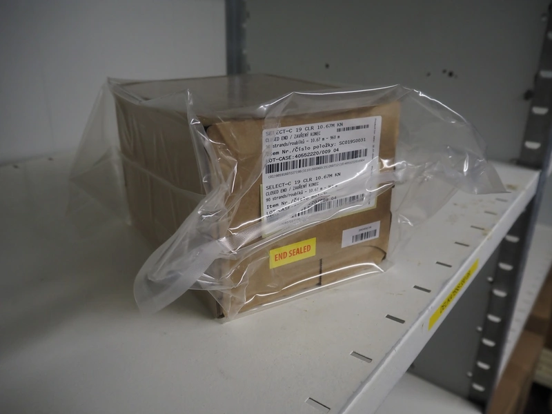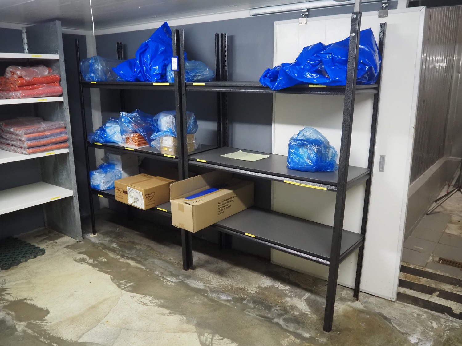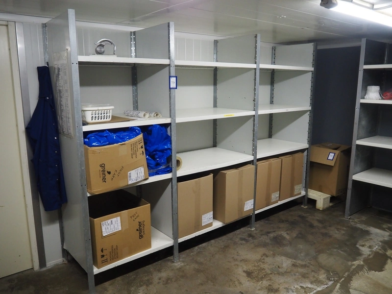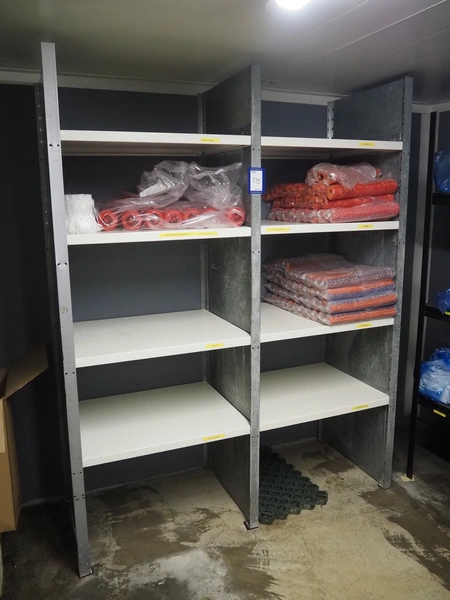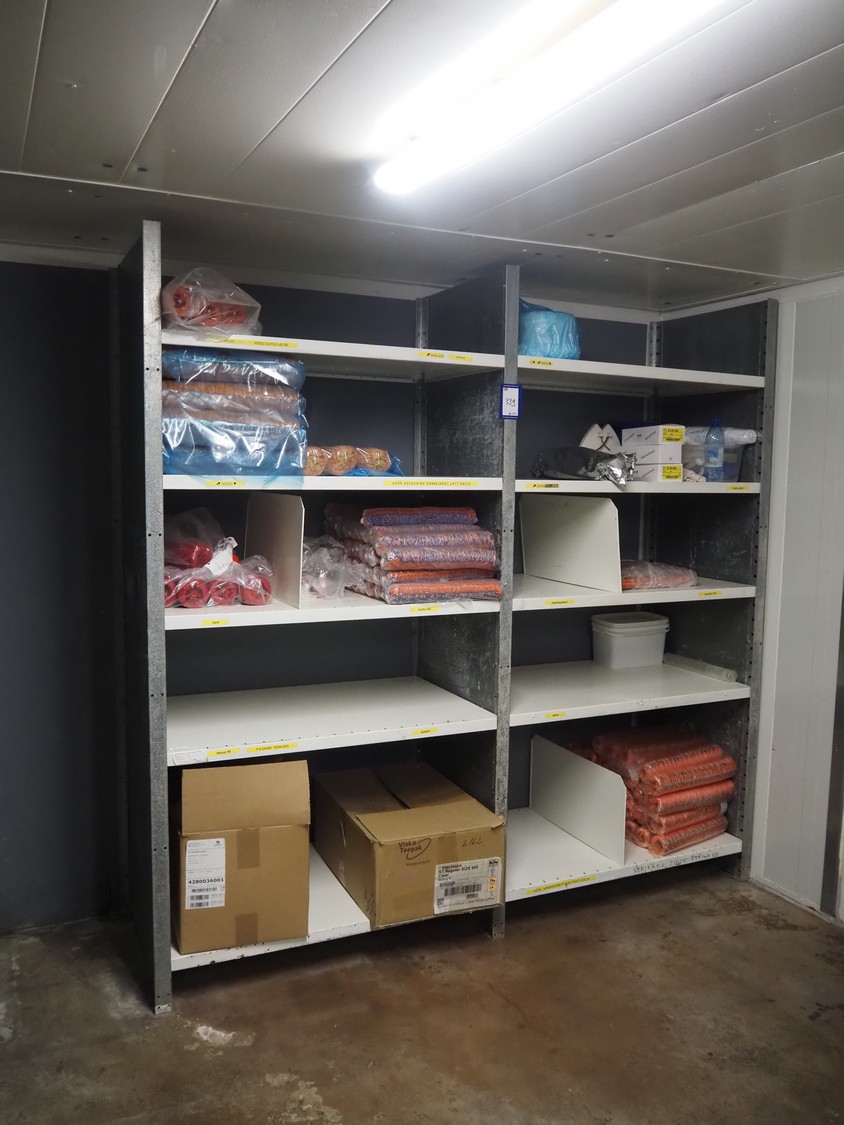 5 steel racks with large amount of casings and plastic trays, dimensions racks: 2040 mm x 600 mm x 2000 mm, 2800 mm x 600 mm x 2000, 1540 mm x 600 mm x 2000 mm and (2x) 1230 mm x 470 mm x 1830 mm.