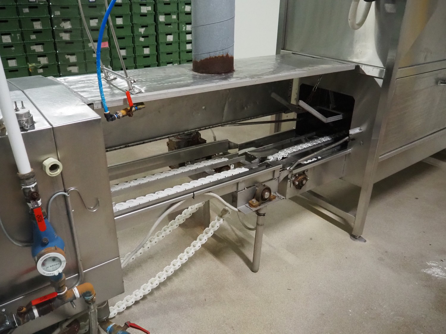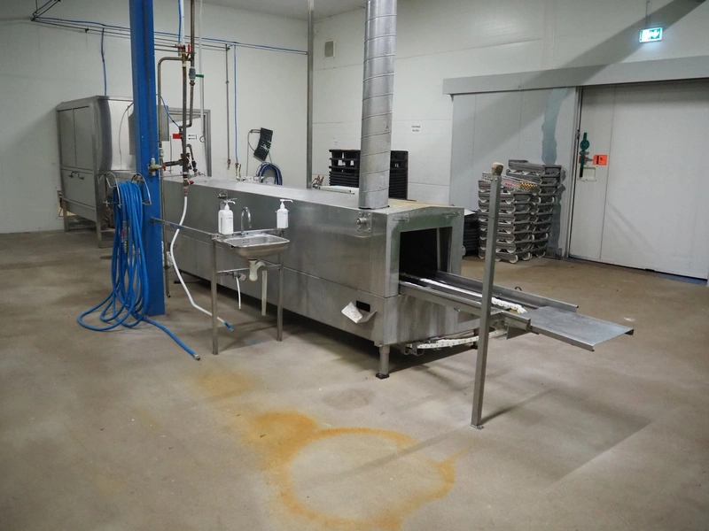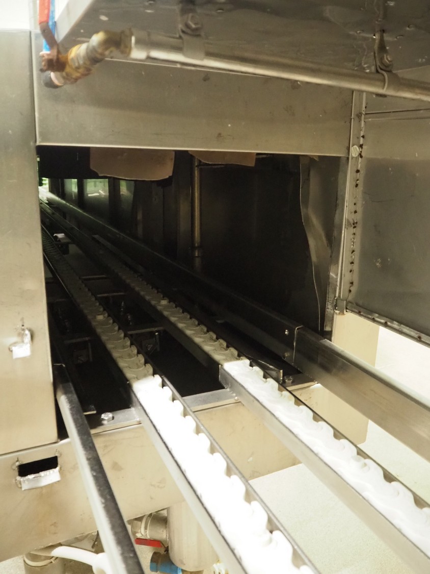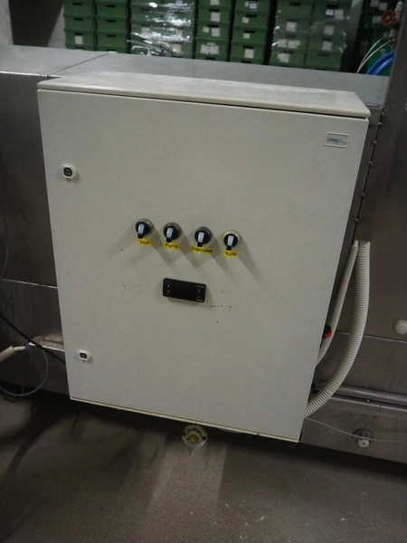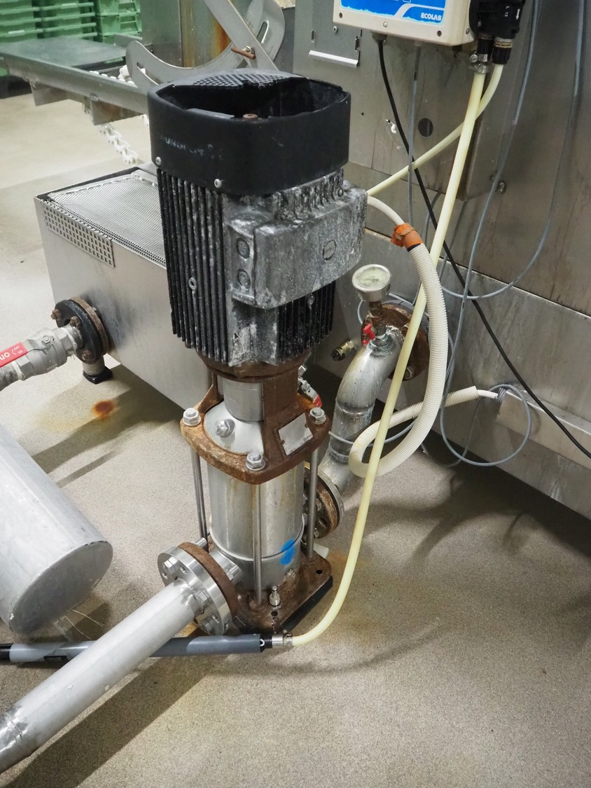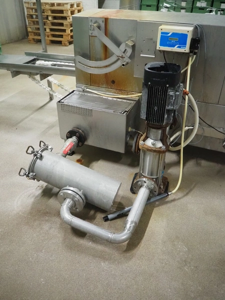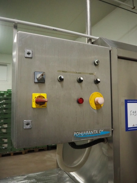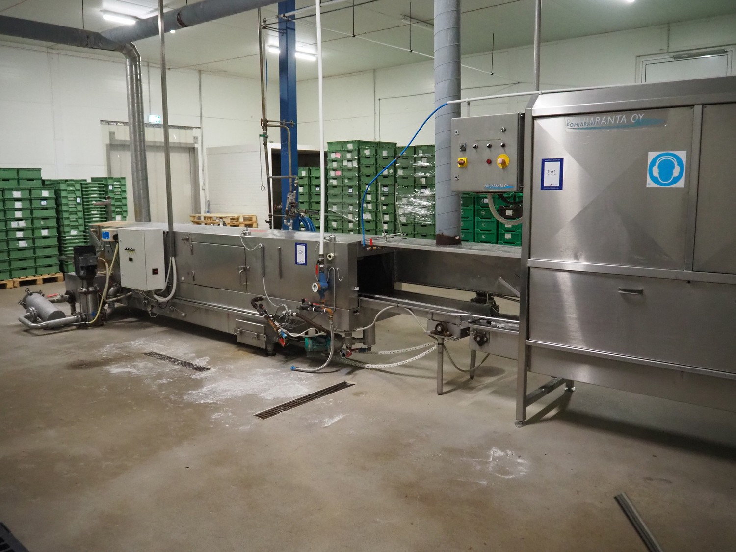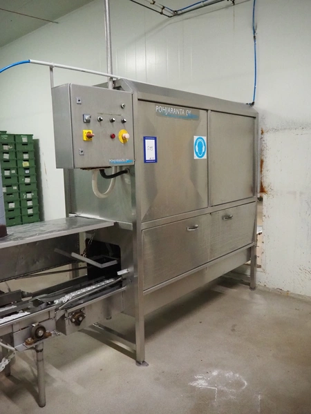 Pohjaranta OY crate washer and dryer, clearance washer: 450 mm x 380 mm, clearance dryer: 410 mm x 360 mm, total dimensions washer: 7400 mm x 1800 mm x 1100 mm, total dimensions dryer: 3800 mm x 1000 mm x 2200 mm, including Grundfos pump and s/s filter.