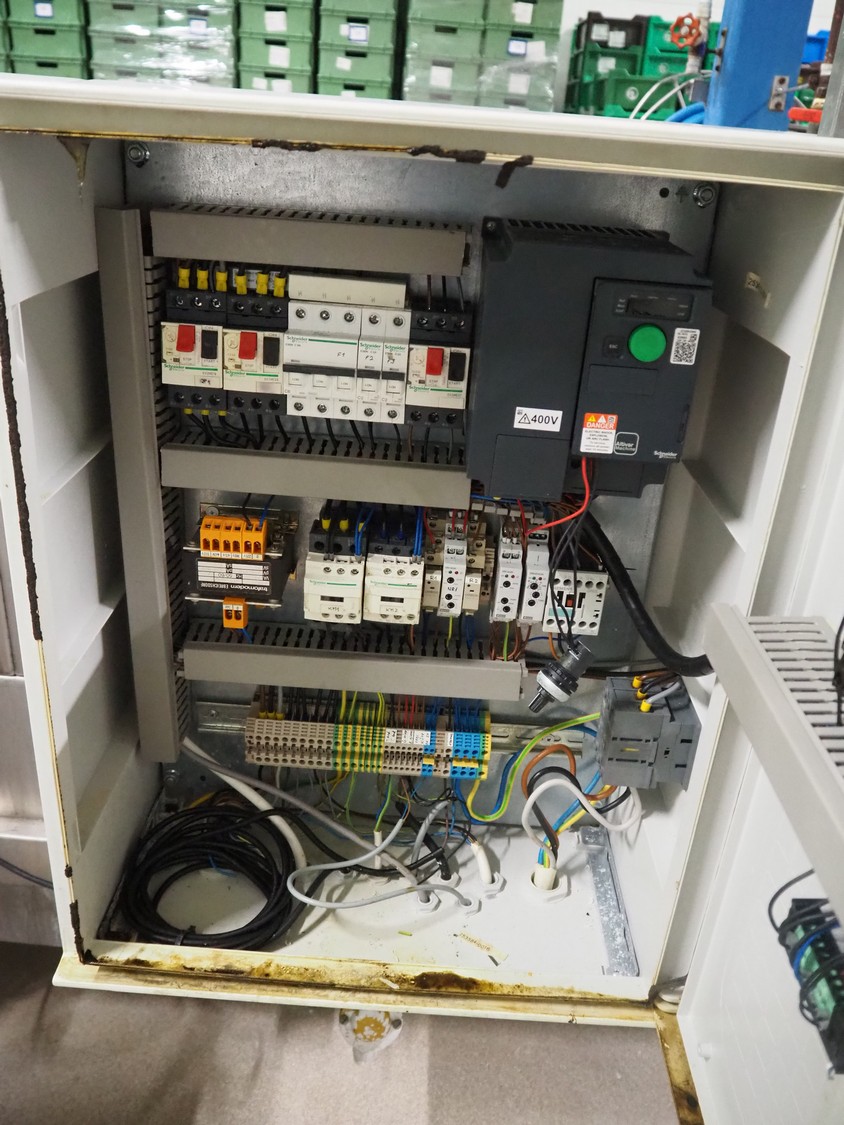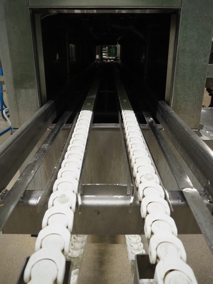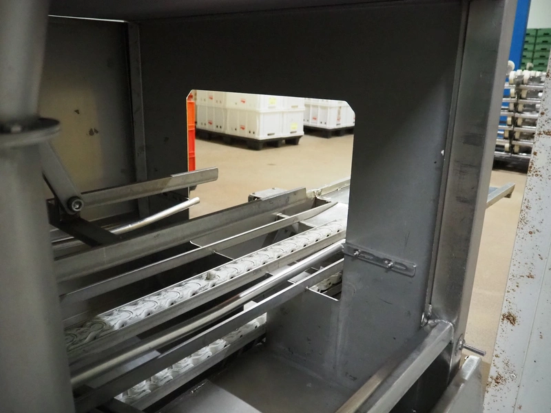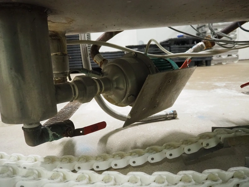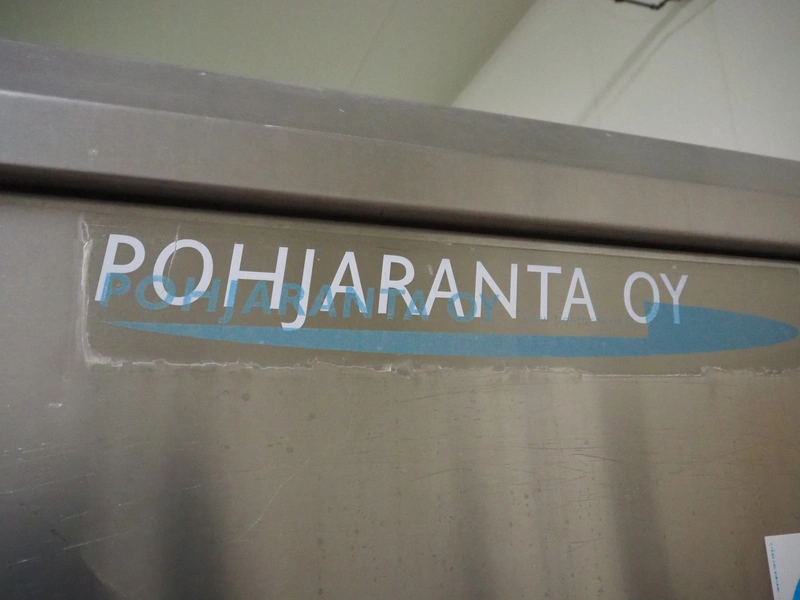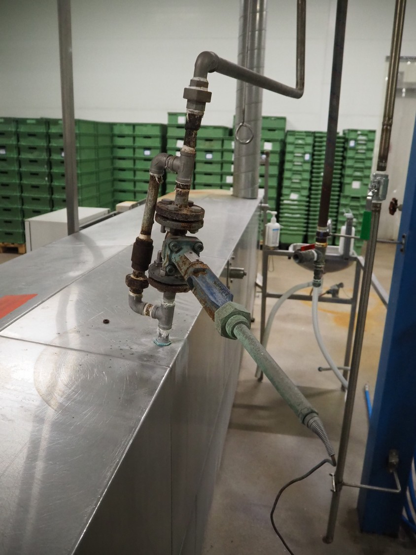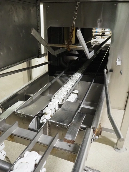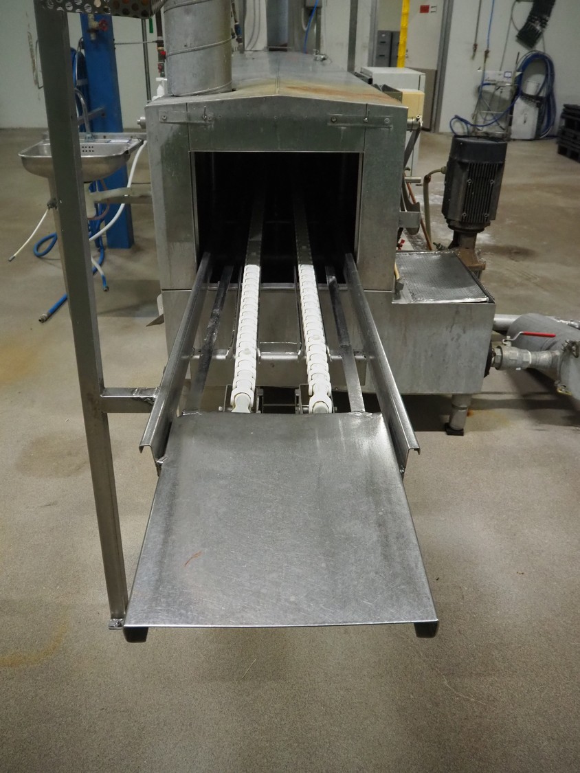 Pohjaranta OY crate washer and dryer, clearance washer: 450 mm x 380 mm, clearance dryer: 410 mm x 360 mm, total dimensions washer: 7400 mm x 1800 mm x 1100 mm, total dimensions dryer: 3800 mm x 1000 mm x 2200 mm, including Grundfos pump and s/s filter.