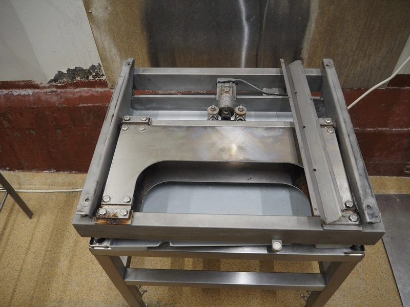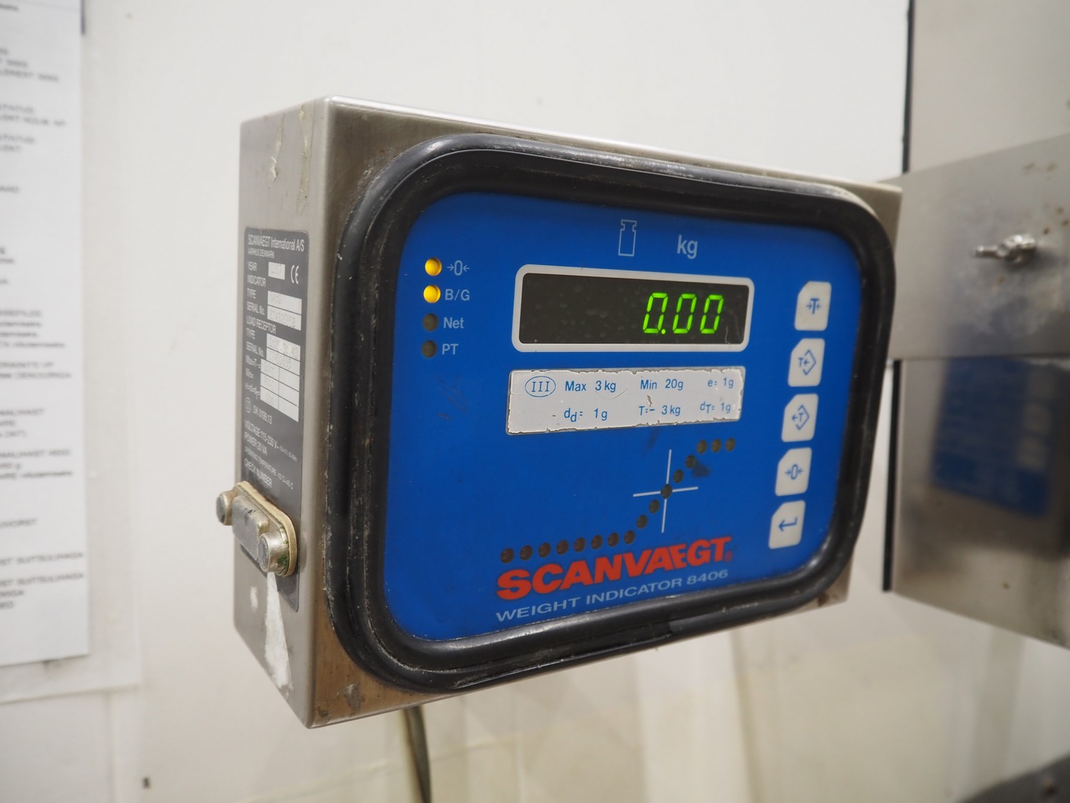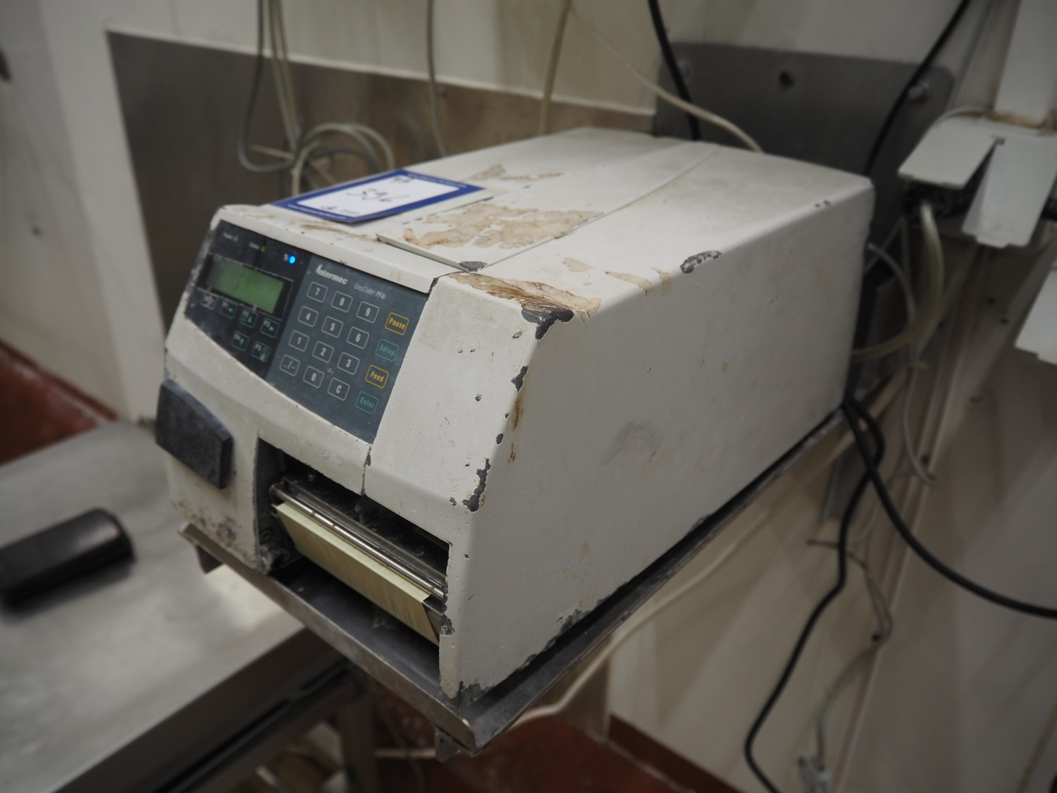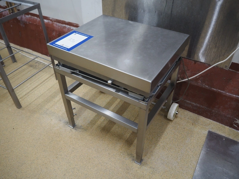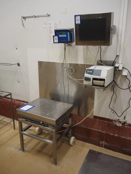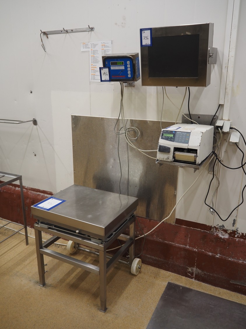 Weighing and labelling unit, consisting of: Scanvaegt weighing scale, type receptor: 1025.30.43, serial number: 97452695, max: 60 kg, min: 400 gram, e=d= 20 gram, dimensions: 600 mm x 500 mm x 660 mm, type indicator: 842, serial number: 97452695B, year of construction: 1997, dimensions: 250 mm x 200 mm x 180 mm, Scanvaegt s/s control panel, dimensions: 410 mm x 280 mm x 340 mm, Intermec label printer, model: EasyCoder PF4i, dimensions: 400 mm x 240 mm x 180 mm.