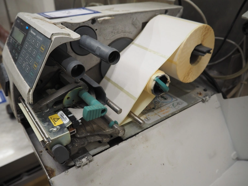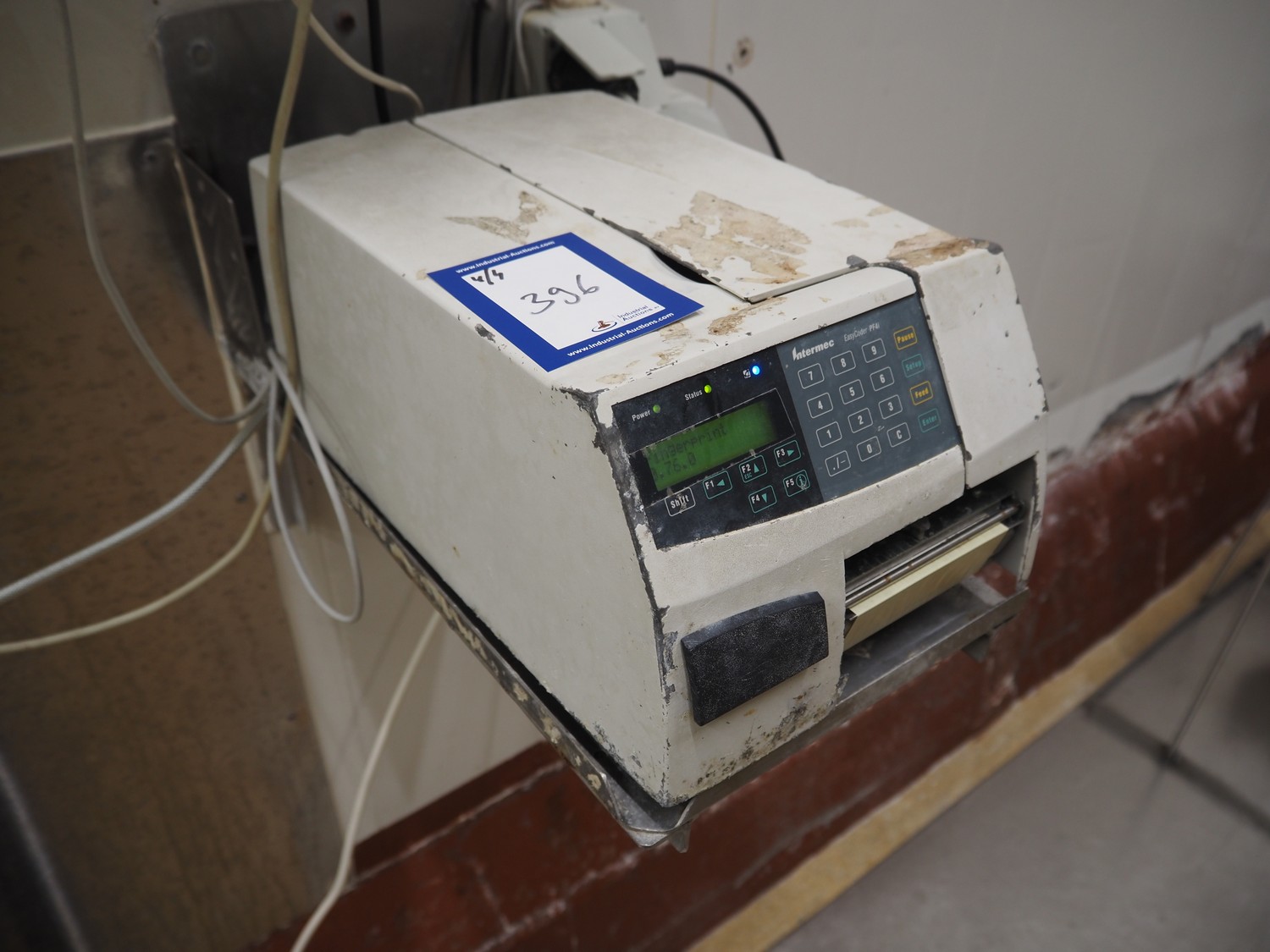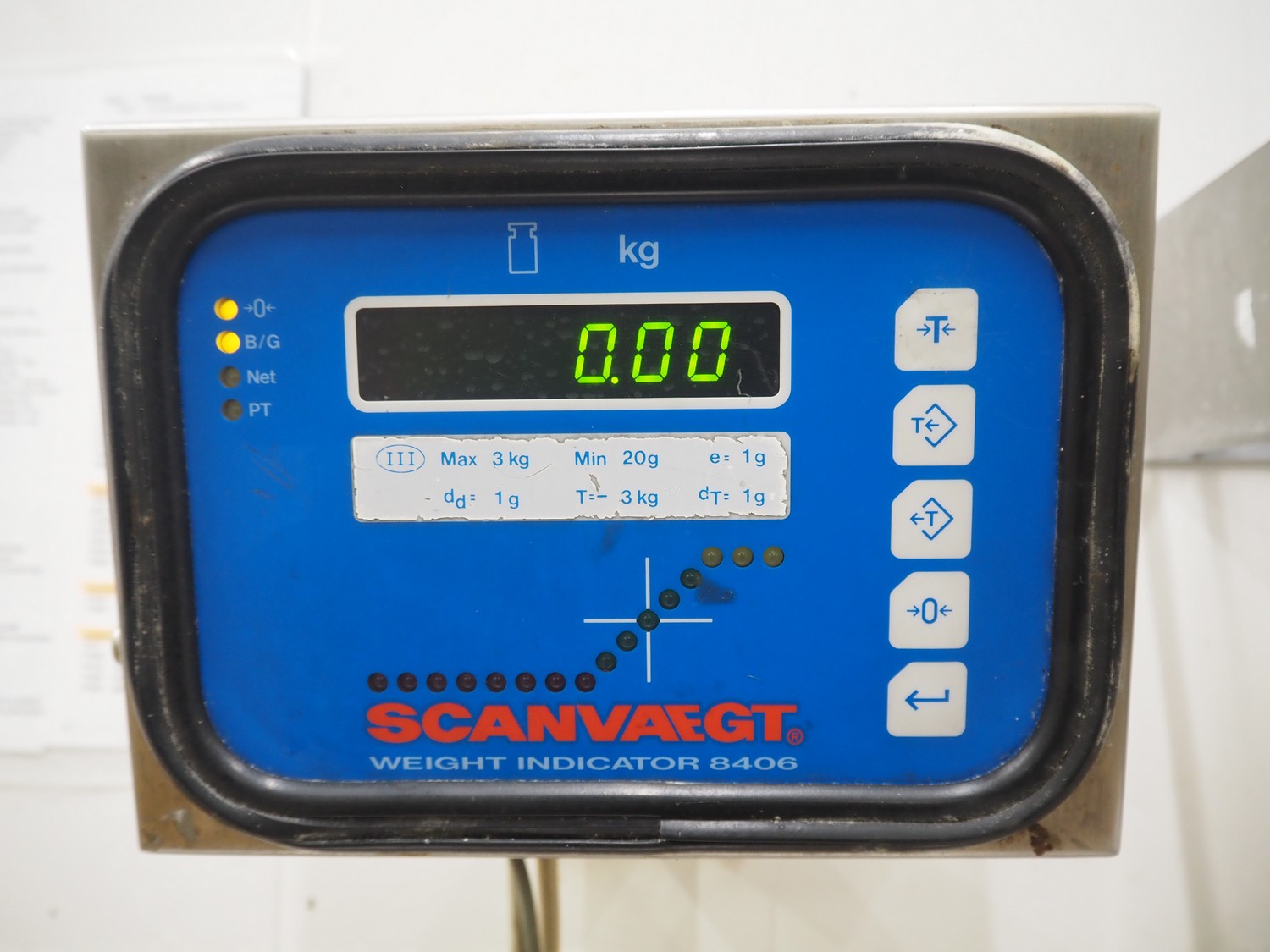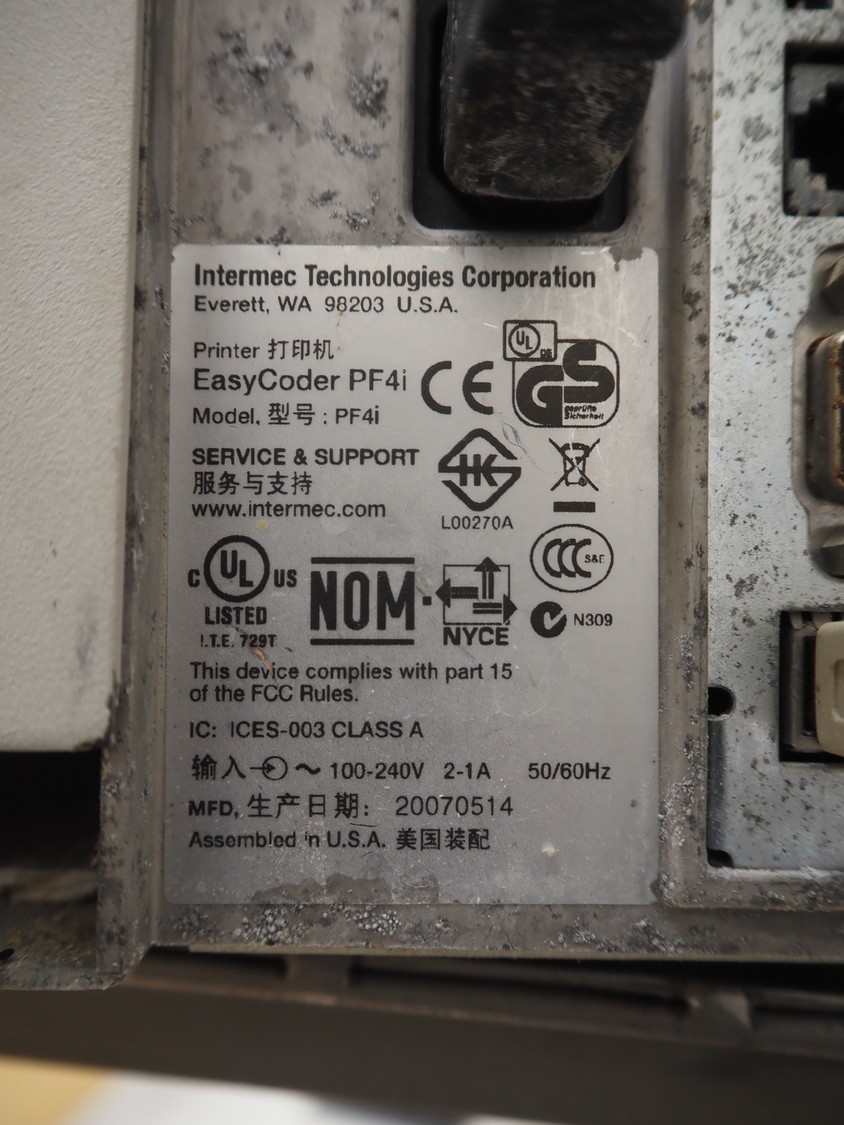 Weighing and labelling unit, consisting of: Scanvaegt weighing scale, type receptor: 1025.30.43, serial number: 97452695, max: 60 kg, min: 400 gram, e=d= 20 gram, dimensions: 600 mm x 500 mm x 660 mm, type indicator: 842, serial number: 97452695B, year of construction: 1997, dimensions: 250 mm x 200 mm x 180 mm, Scanvaegt s/s control panel, dimensions: 410 mm x 280 mm x 340 mm, Intermec label printer, model: EasyCoder PF4i, dimensions: 400 mm x 240 mm x 180 mm.