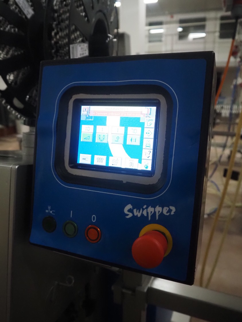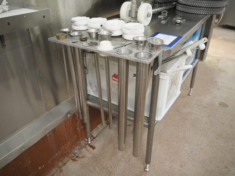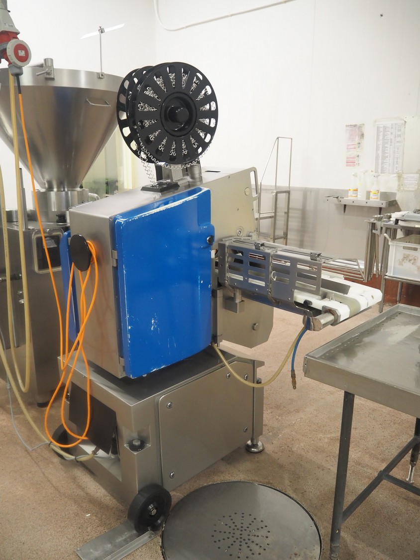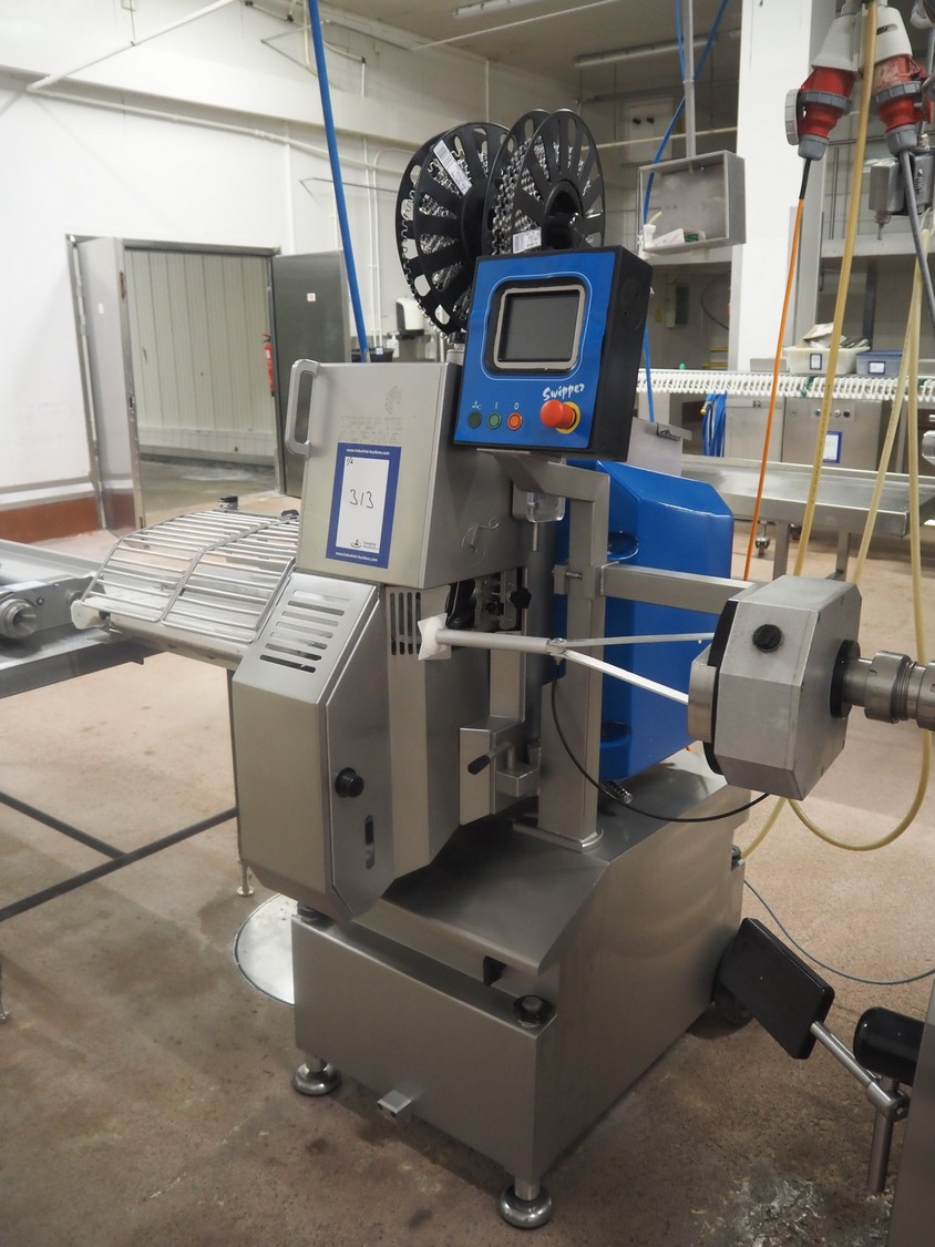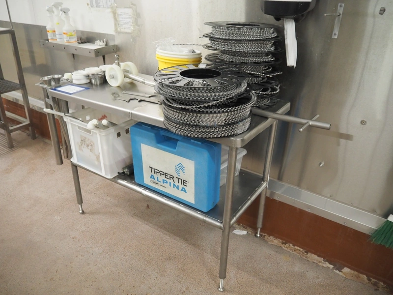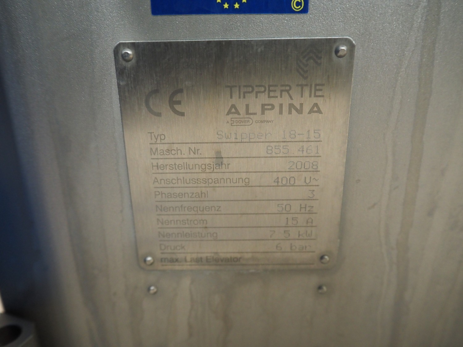 Tipper Tie Alpina automatic double clipper, type: Swipper 18-15, machine number: 855.461, year of construction: 2008, 400 V, 3 Ph, 50 Hz, 15 A, 7.5 kW, 6 bar, plastic outfeed belt, belt width: 70 mm, total dimensions: 1570 mm x 1030 mm x 1900 mm. Including s/s table with various parts, dimensions table: 1500 mm x 600 mm x 880 mm.