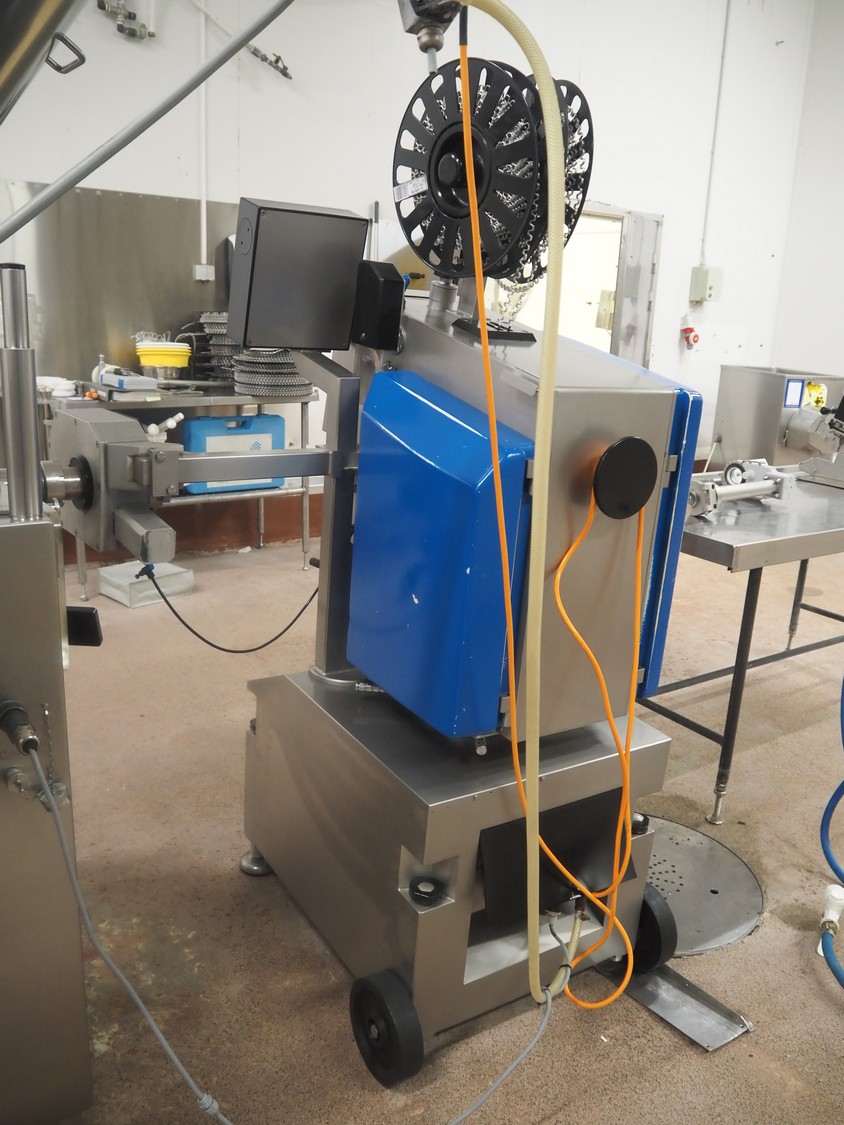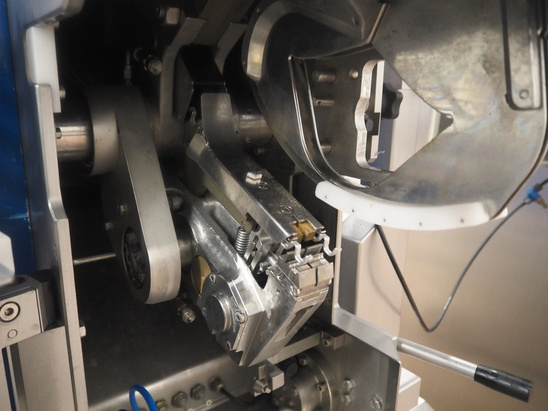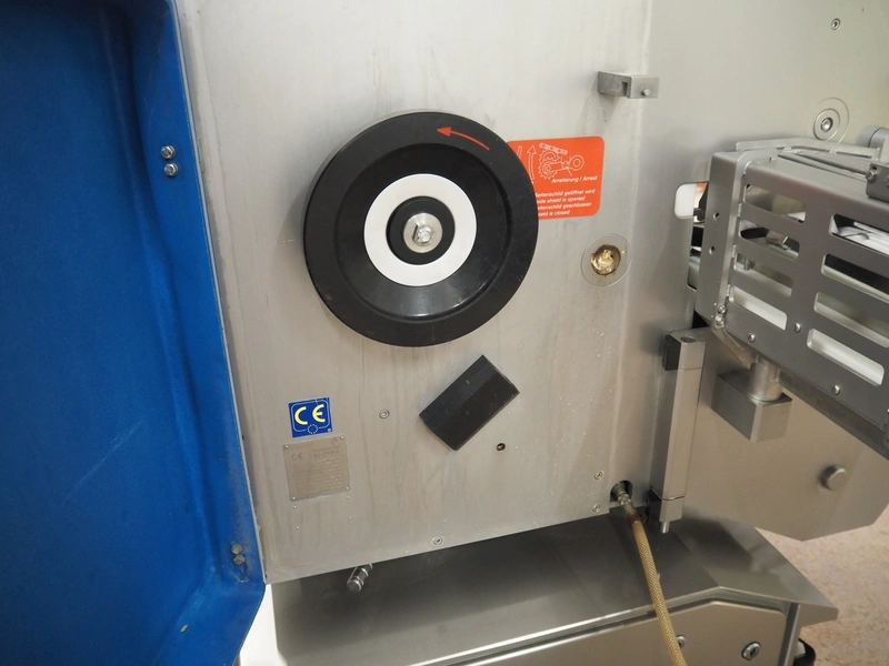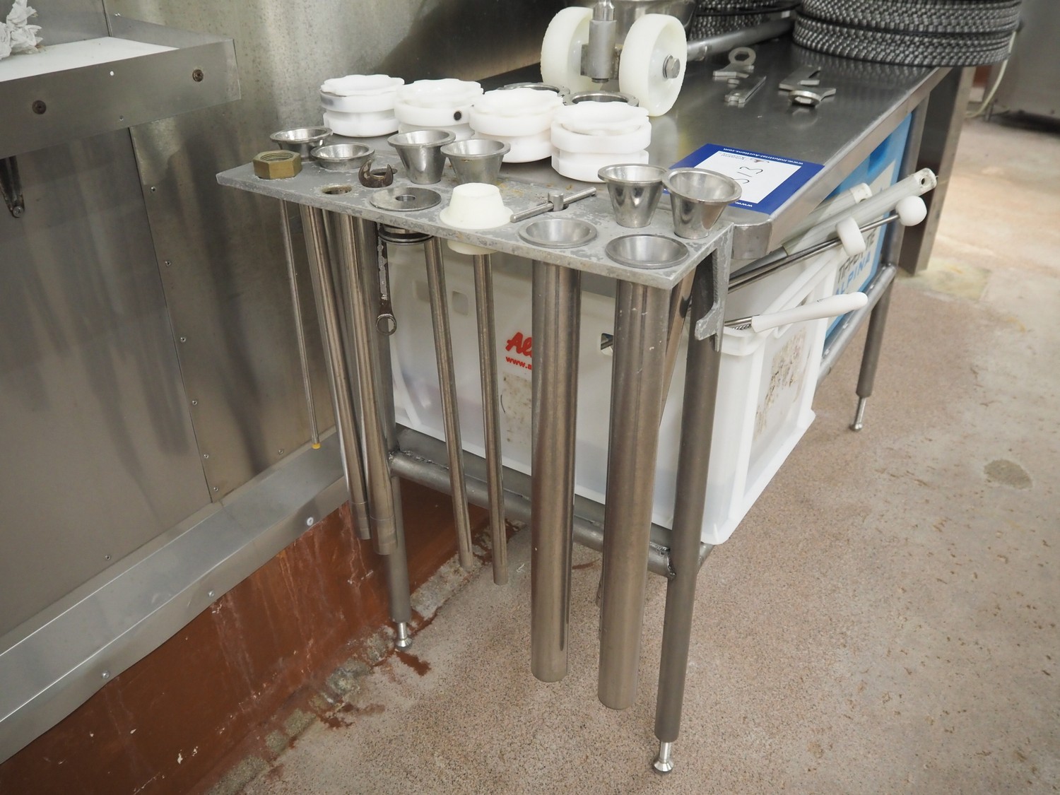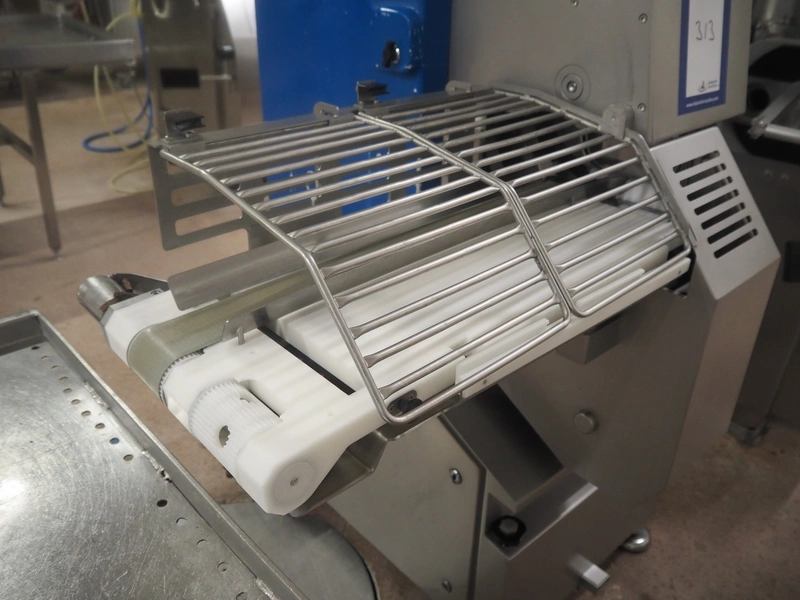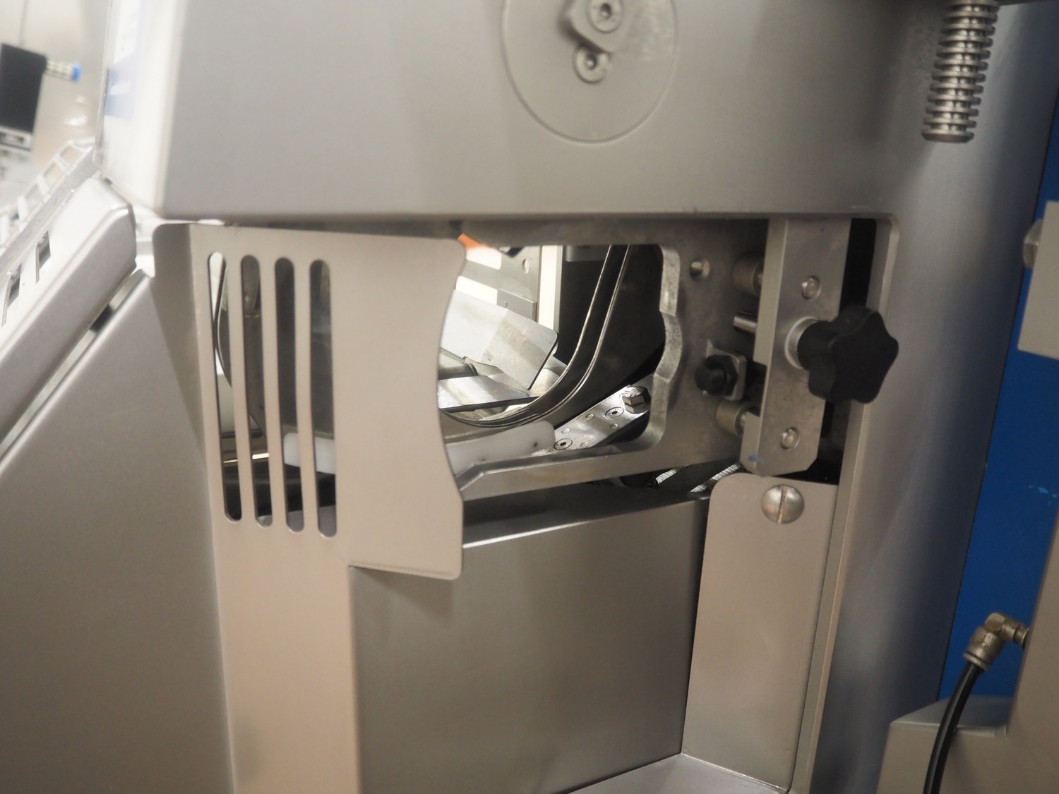 Tipper Tie Alpina automatic double clipper, type: Swipper 18-15, machine number: 855.461, year of construction: 2008, 400 V, 3 Ph, 50 Hz, 15 A, 7.5 kW, 6 bar, plastic outfeed belt, belt width: 70 mm, total dimensions: 1570 mm x 1030 mm x 1900 mm. Including s/s table with various parts, dimensions table: 1500 mm x 600 mm x 880 mm.