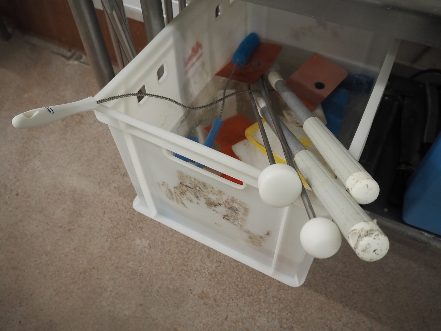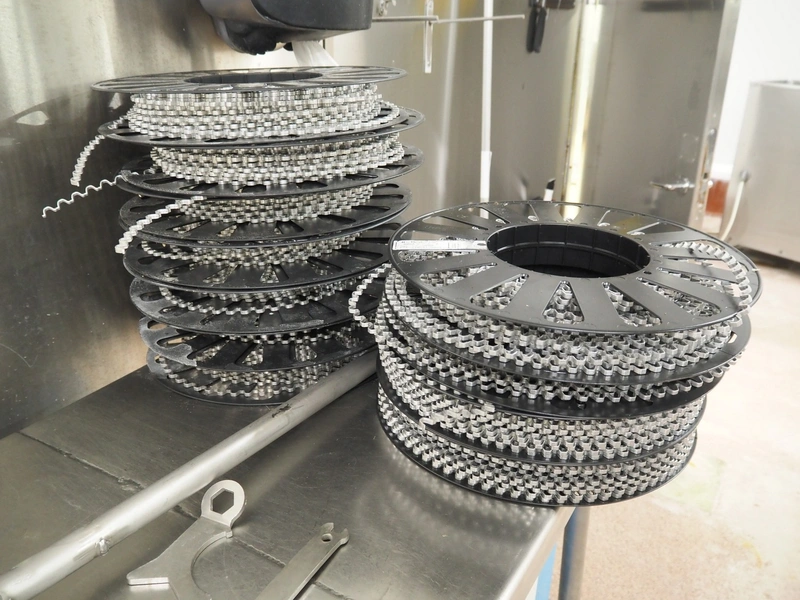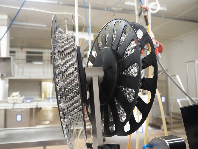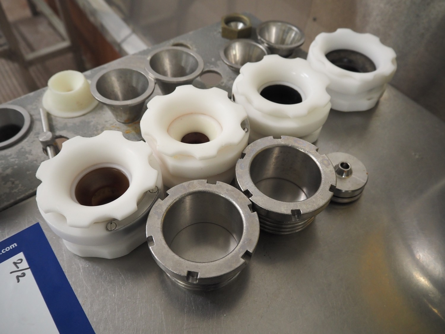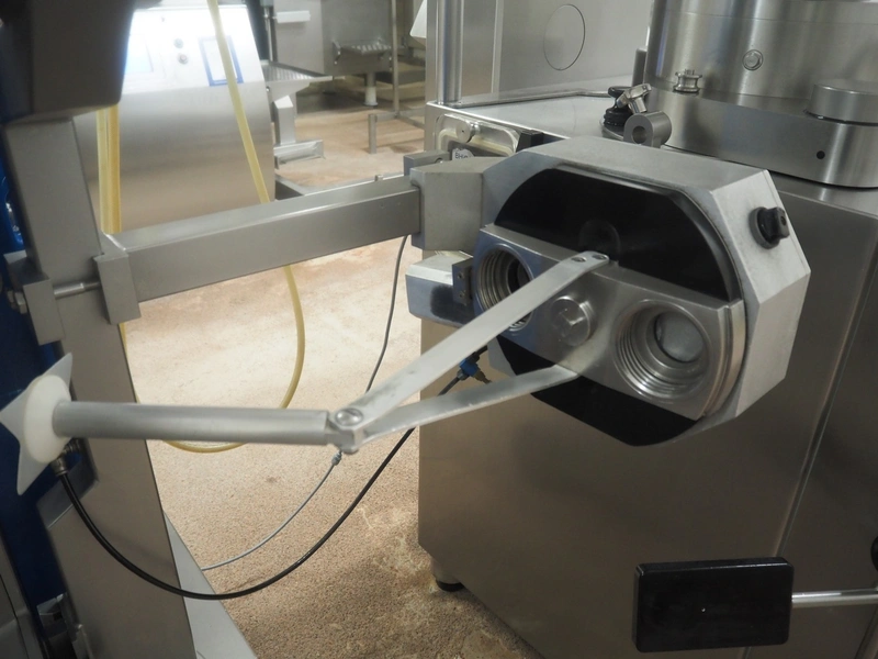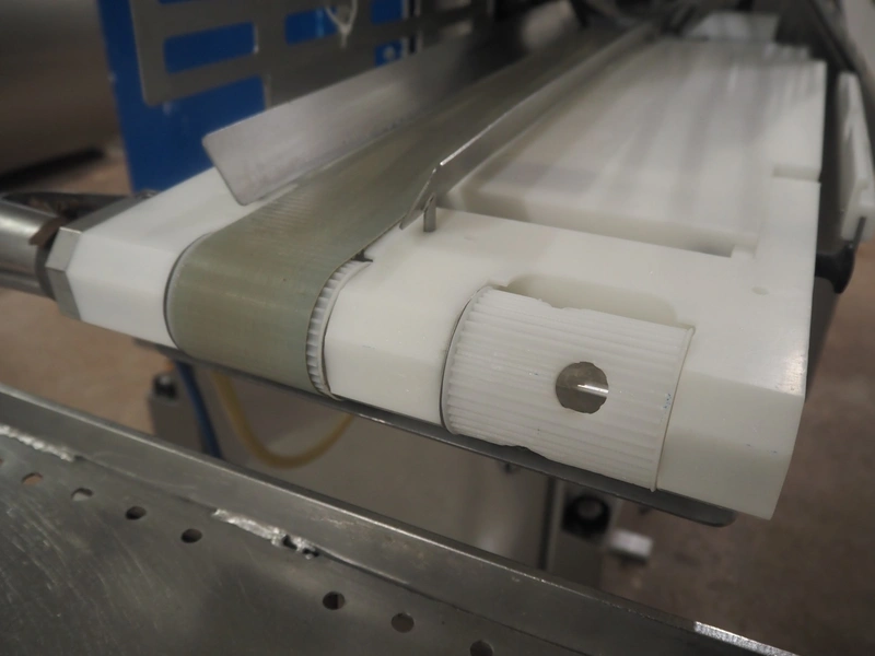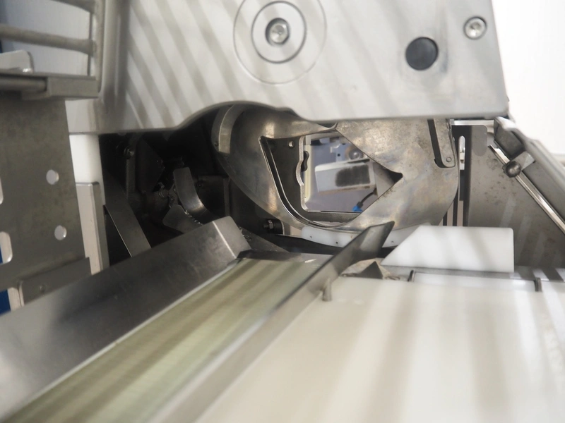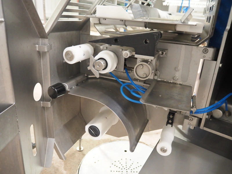 Tipper Tie Alpina automatic double clipper, type: Swipper 18-15, machine number: 855.461, year of construction: 2008, 400 V, 3 Ph, 50 Hz, 15 A, 7.5 kW, 6 bar, plastic outfeed belt, belt width: 70 mm, total dimensions: 1570 mm x 1030 mm x 1900 mm. Including s/s table with various parts, dimensions table: 1500 mm x 600 mm x 880 mm.