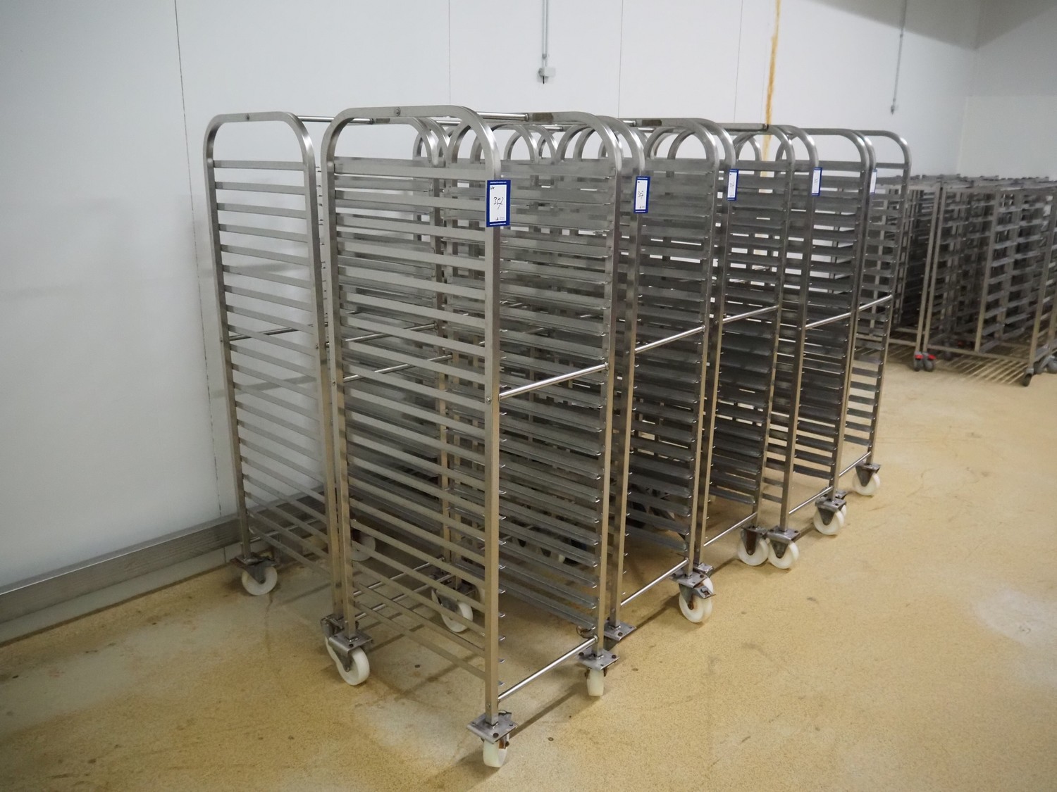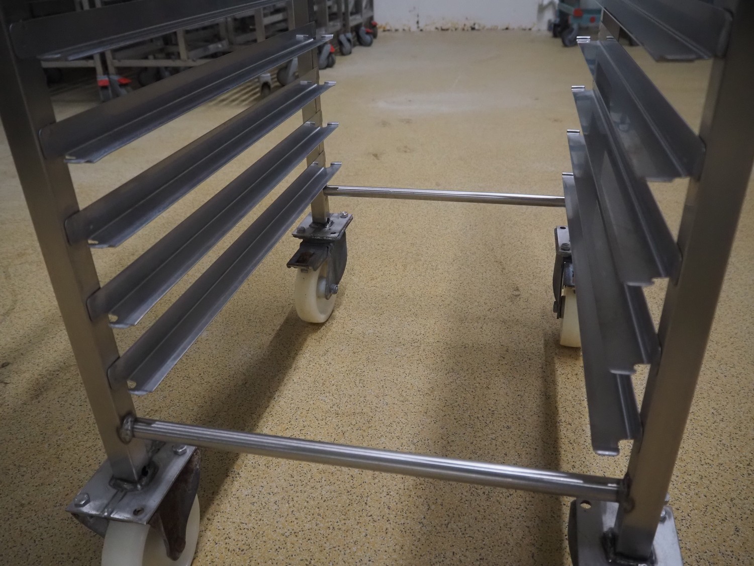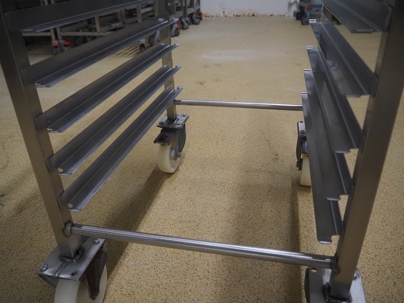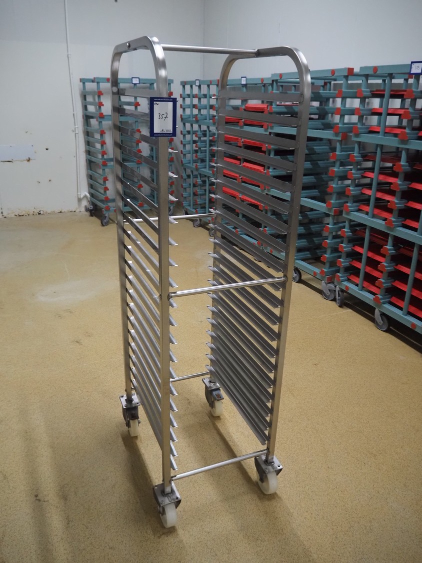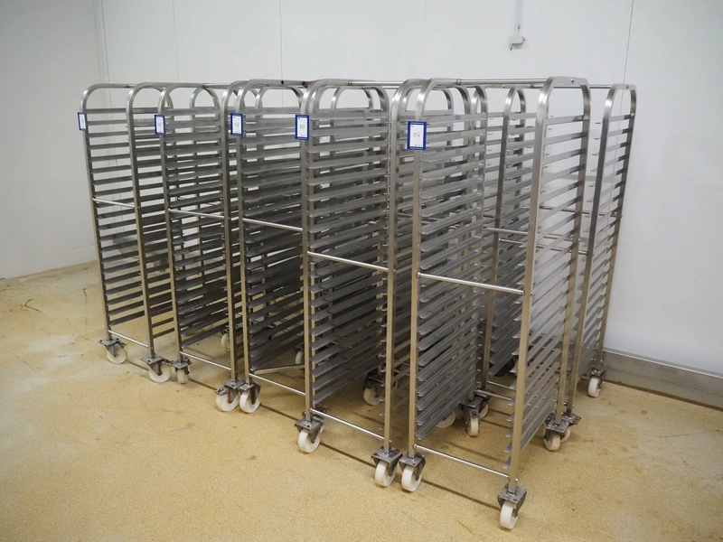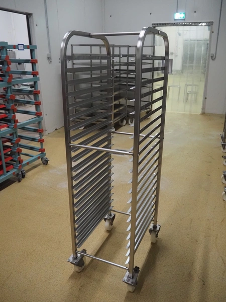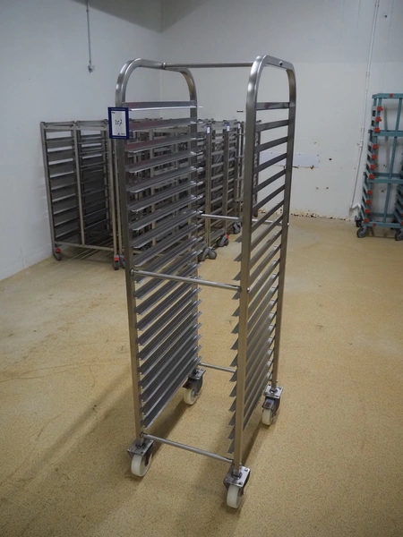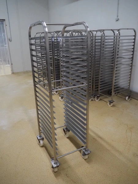 10 s/s trolleys for plates, 20 floors, dimensions floors: (20x) 620 mm x 410 mm, total dimensions: (10x) 630 mm x 470 mm x 1690 mm.