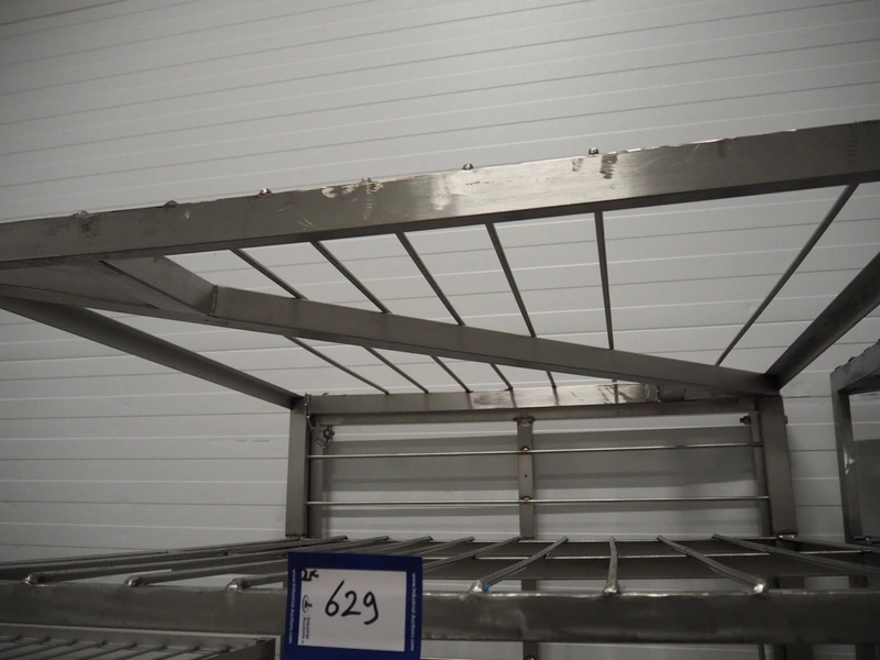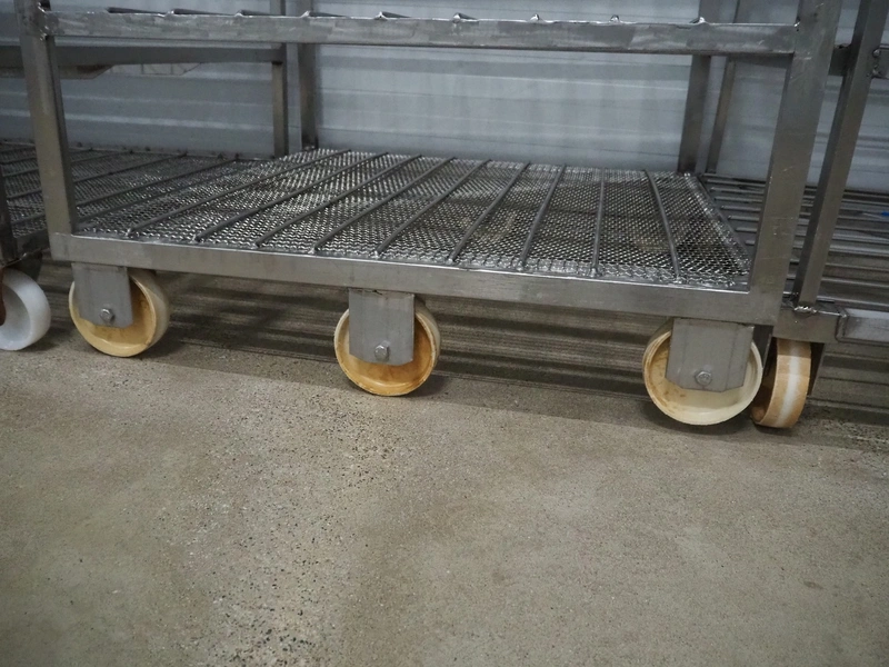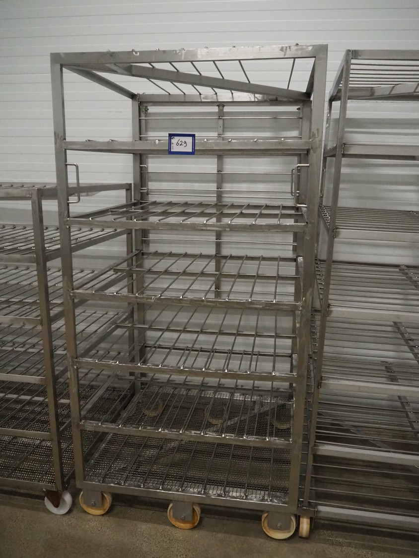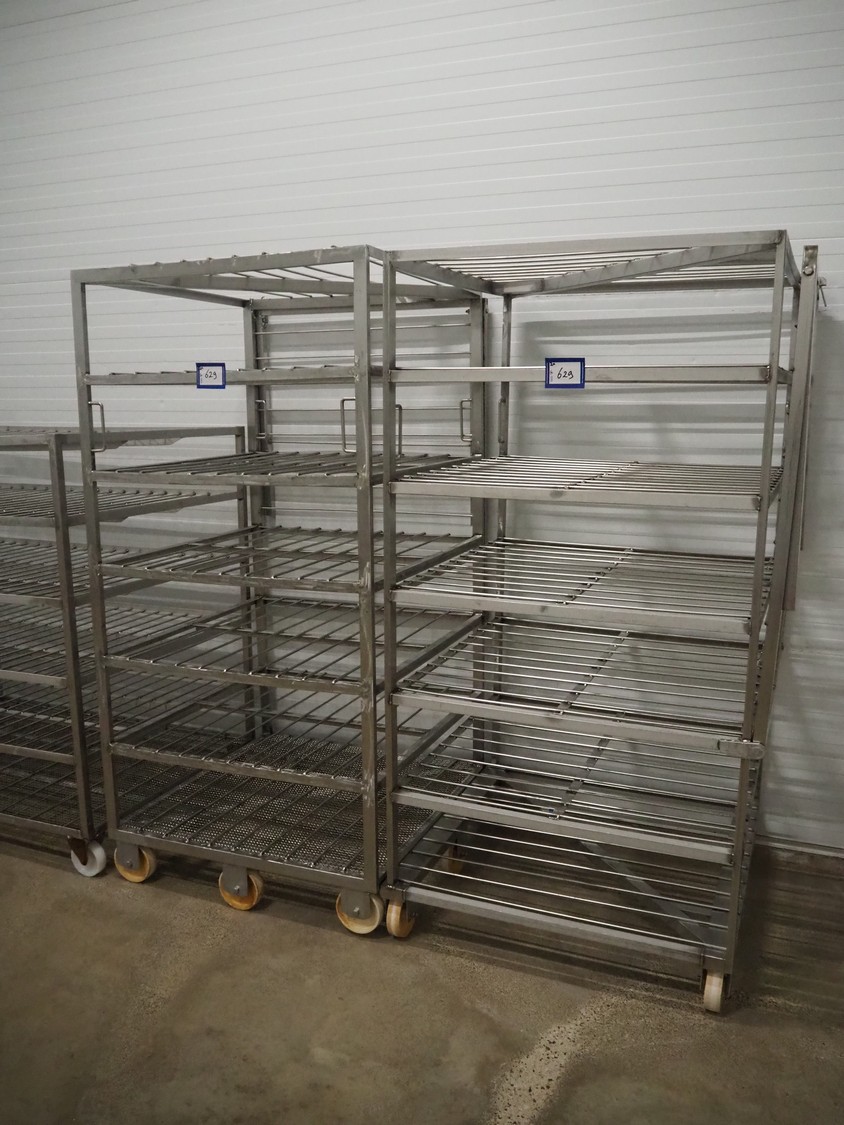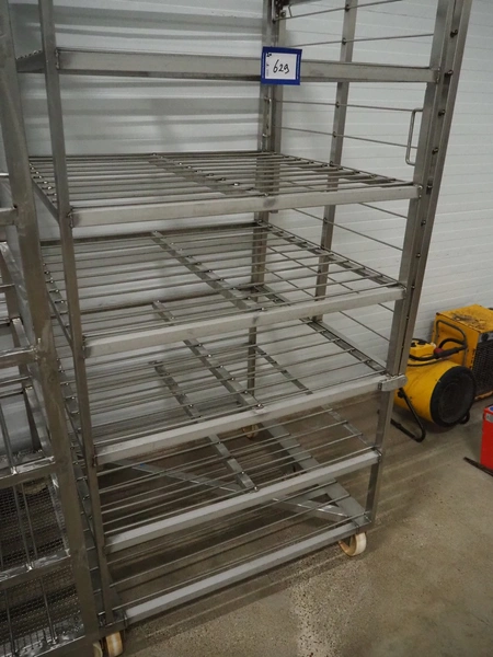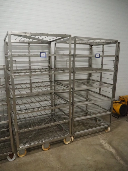 2 s/s cooking trolleys, 6 floors each, dimensions each floor: 940 mm x 1000 mm, distance between floors: 270 mm, total dimensions: (2x) 1030 mm x 1000 mm x 2000 mm.