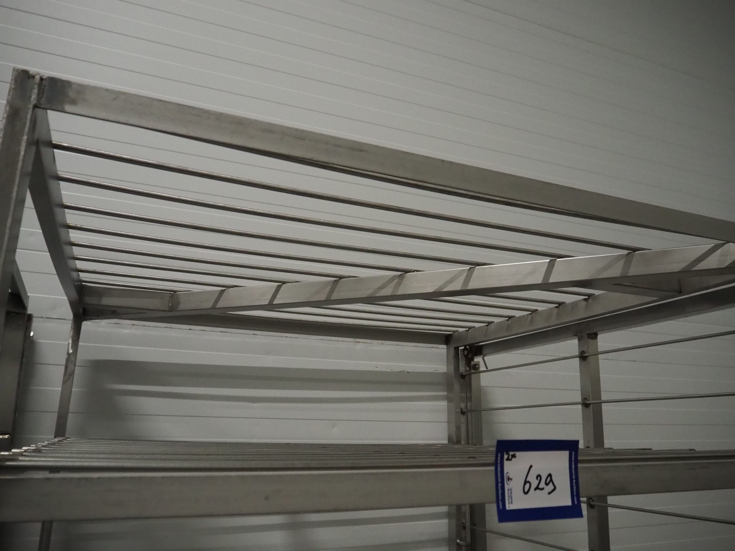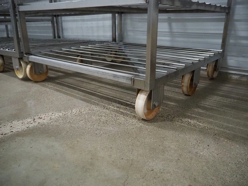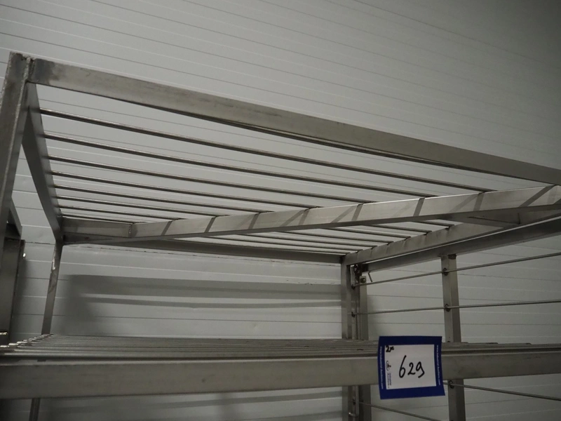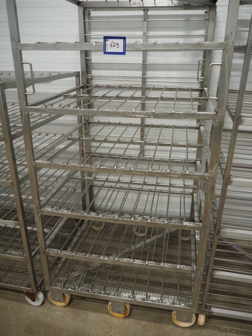2 s/s cooking trolleys, 6 floors each, dimensions each floor: 940 mm x 1000 mm, distance between floors: 270 mm, total dimensions: (2x) 1030 mm x 1000 mm x 2000 mm.