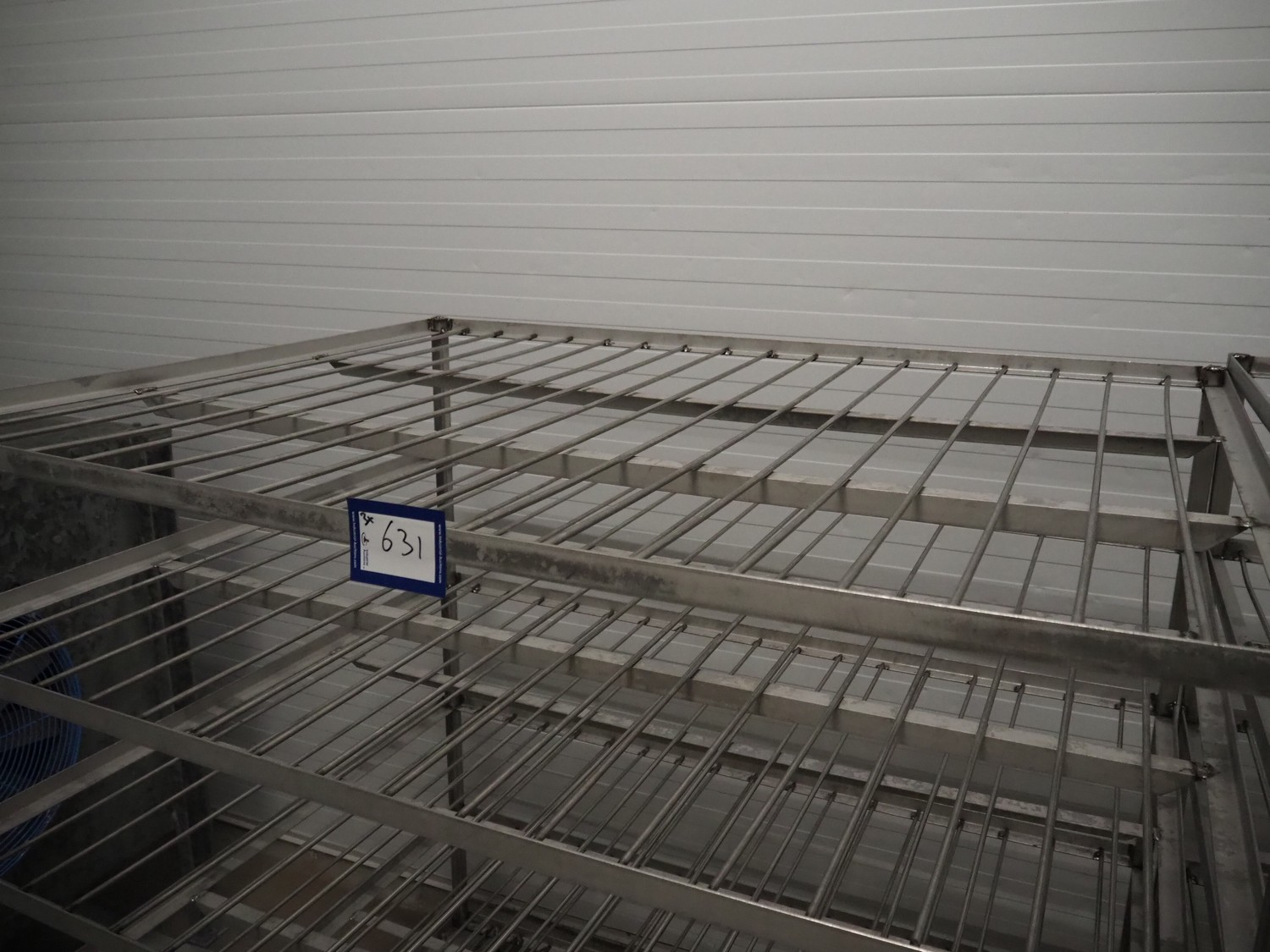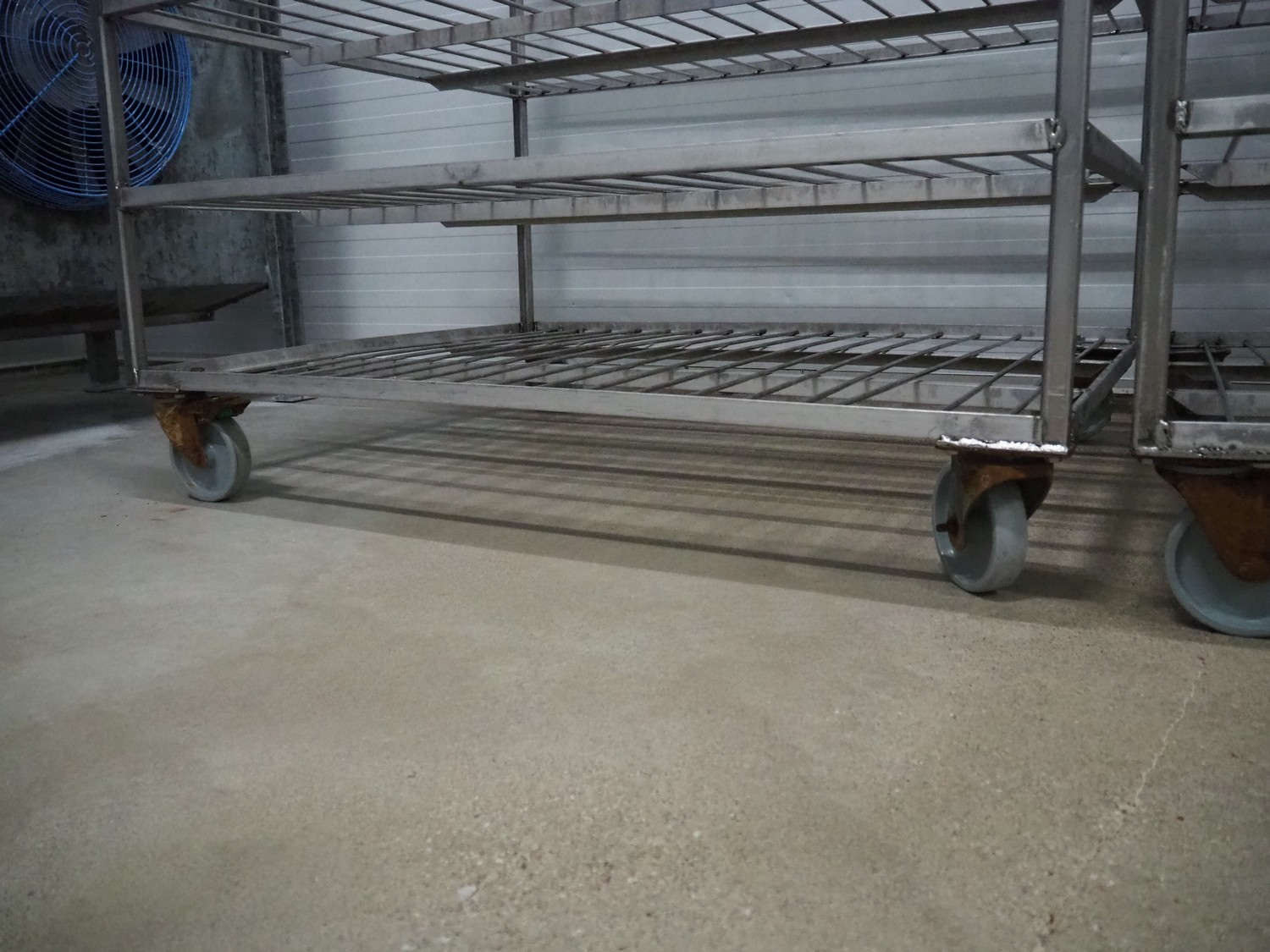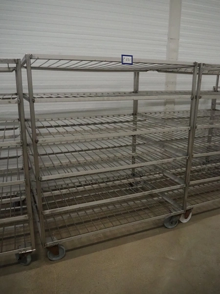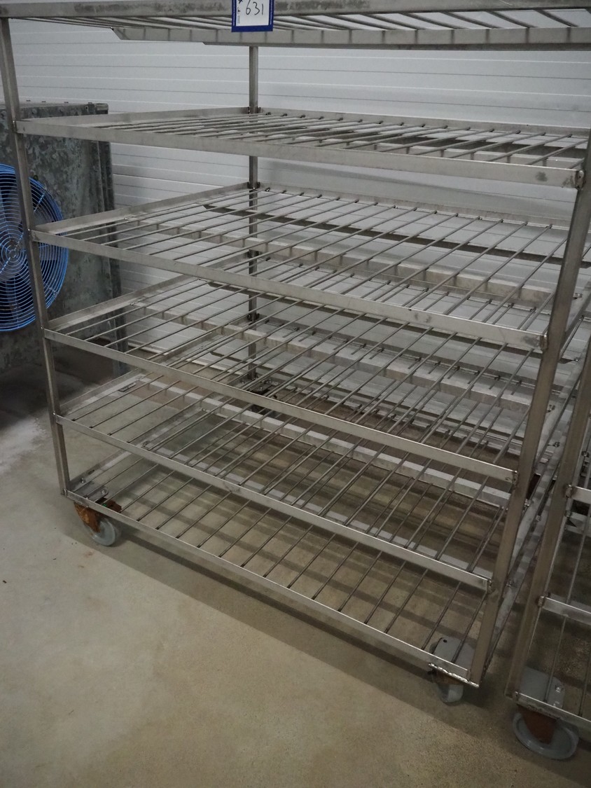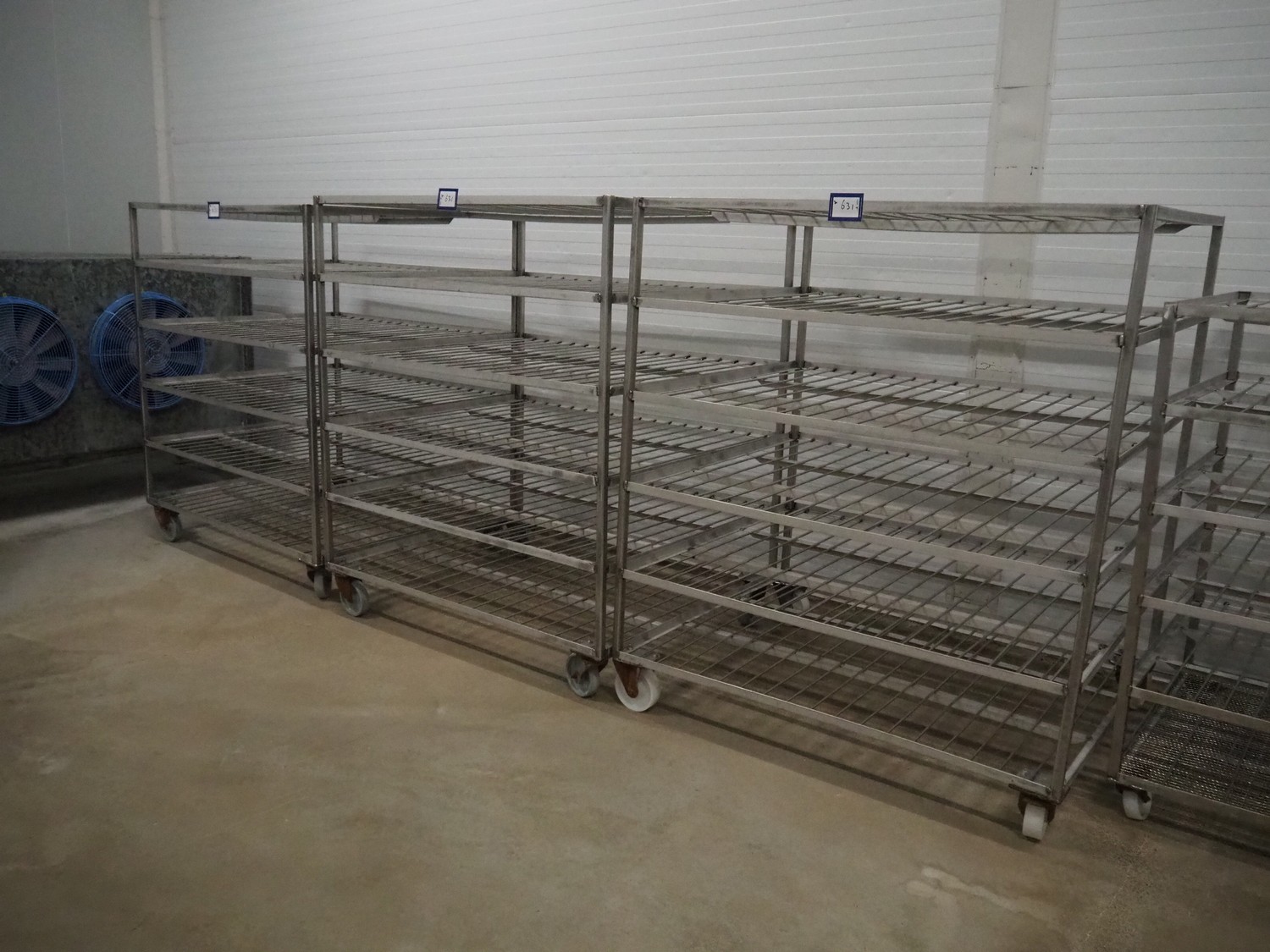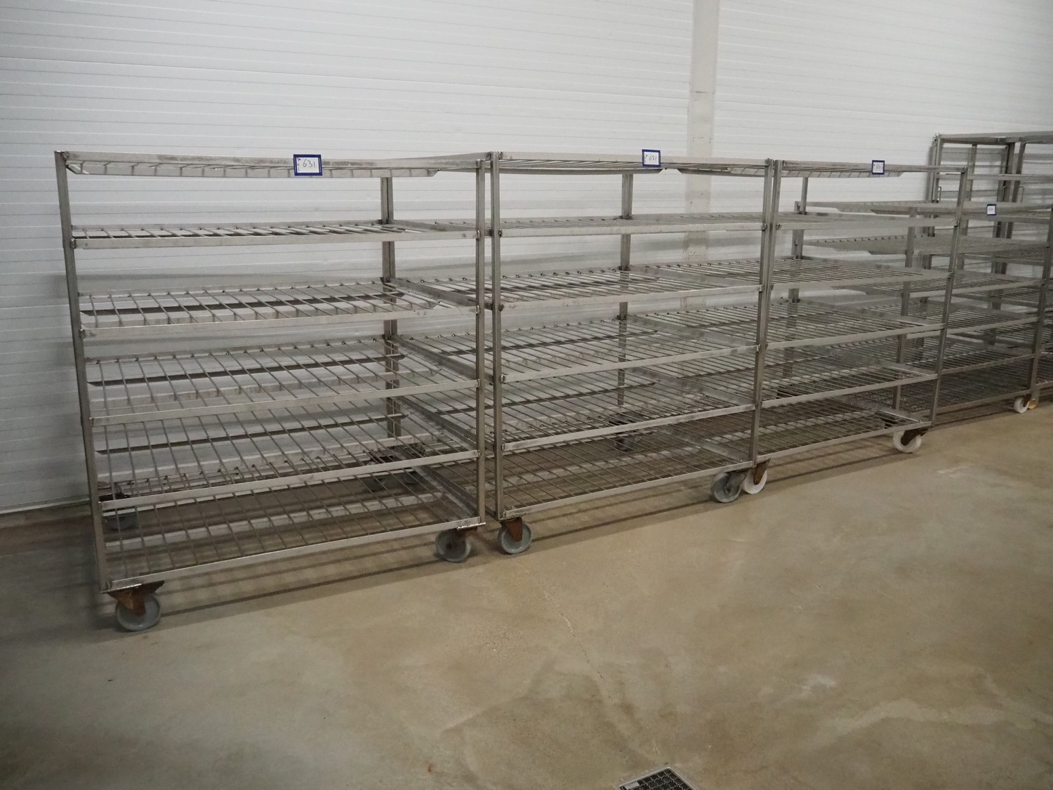 3 s/s cooking trolleys, 6 floors each, dimensions each floor: 1450 mm x 1200 mm, distance between floors: 270 mm, total dimensions: (3x) 1500 mm x 1200 mm x 1710 mm.