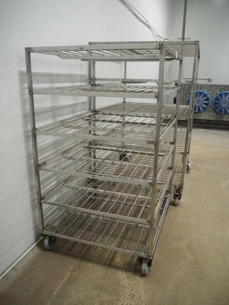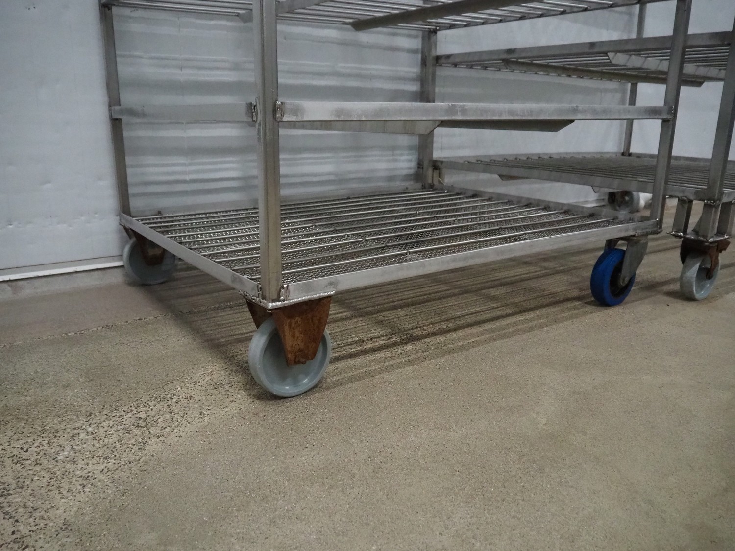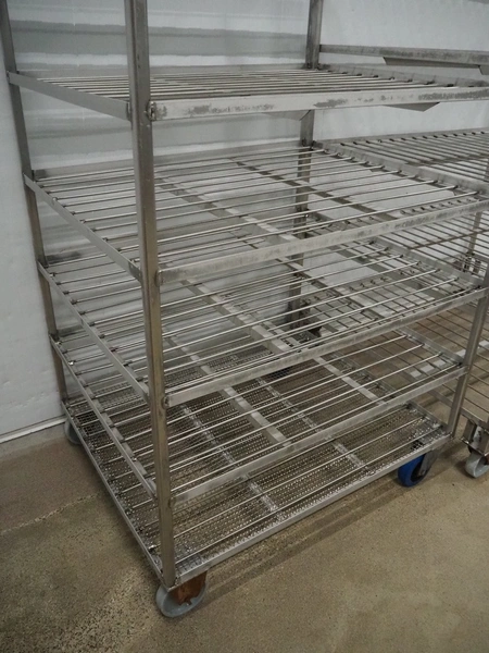 S/s cooking trolley, 6 floors each, dimensions each floor: 1140 mm x 1000 mm, distance between floors: 270 mm, total dimensions: 1200 mm x 1000 mm x 1730 mm.
