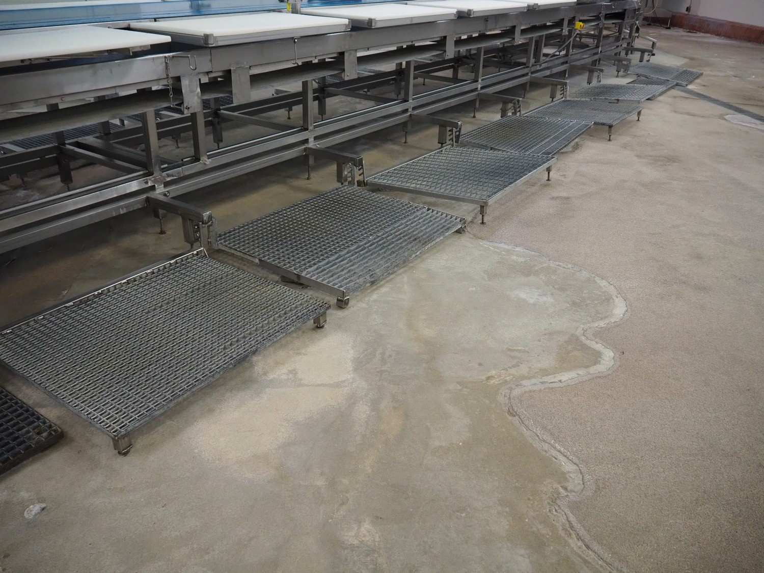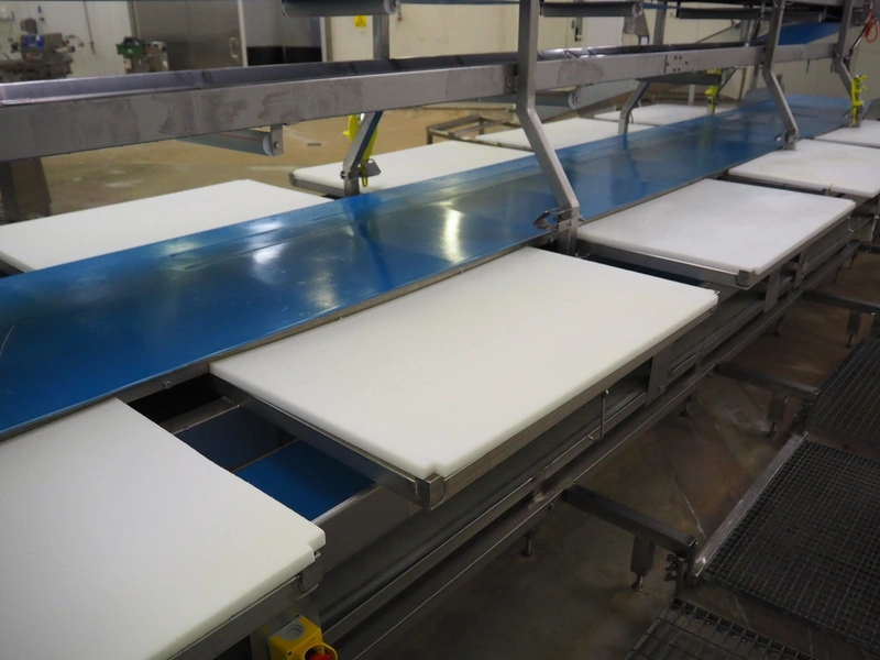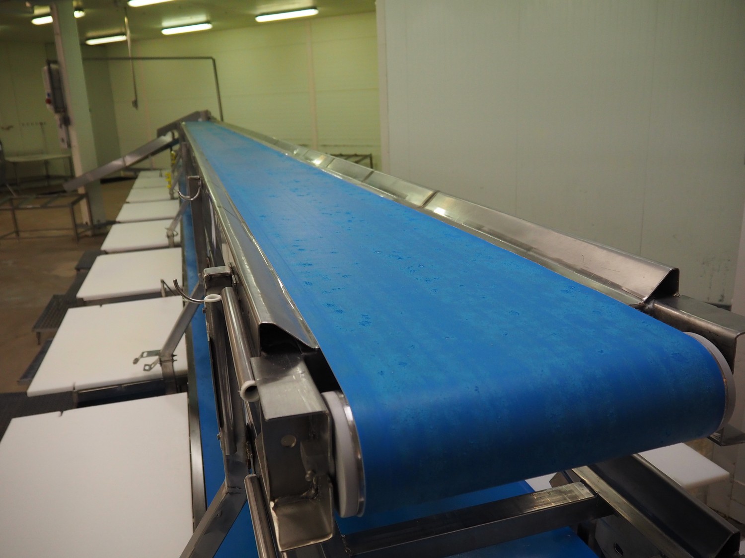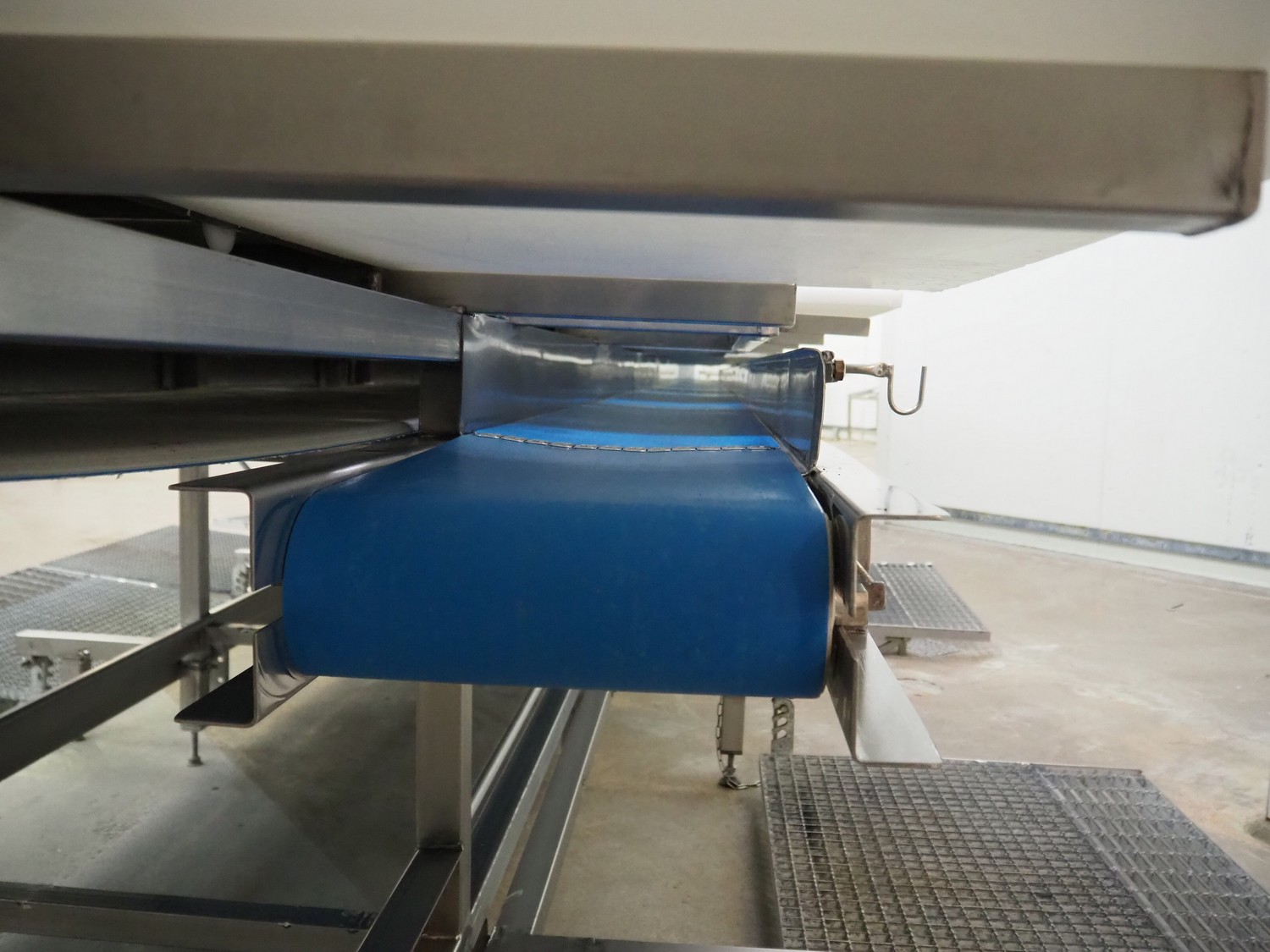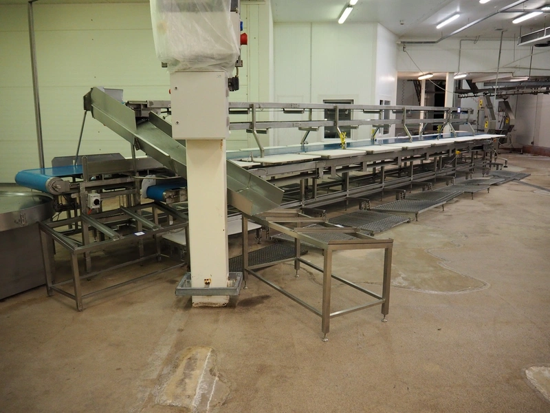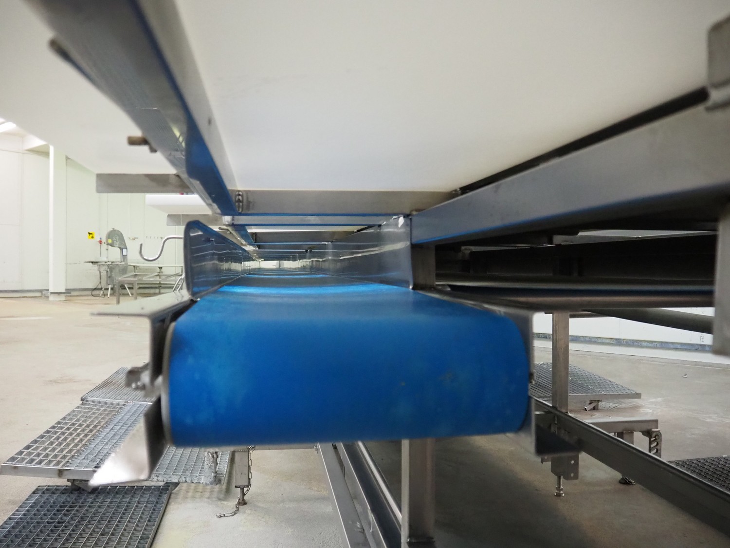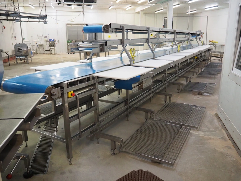 Deboning belt, s/s frame, (2x) 9 stations, dimensions stations: (18x) 990 mm x 550 mm, 4 plastic belts, belt width: 760 mm, 380 mm and (2x) 310 mm, total dimensions: 12600 mm x 1880 mm x 1850 mm. Including s/s outfeed slide.