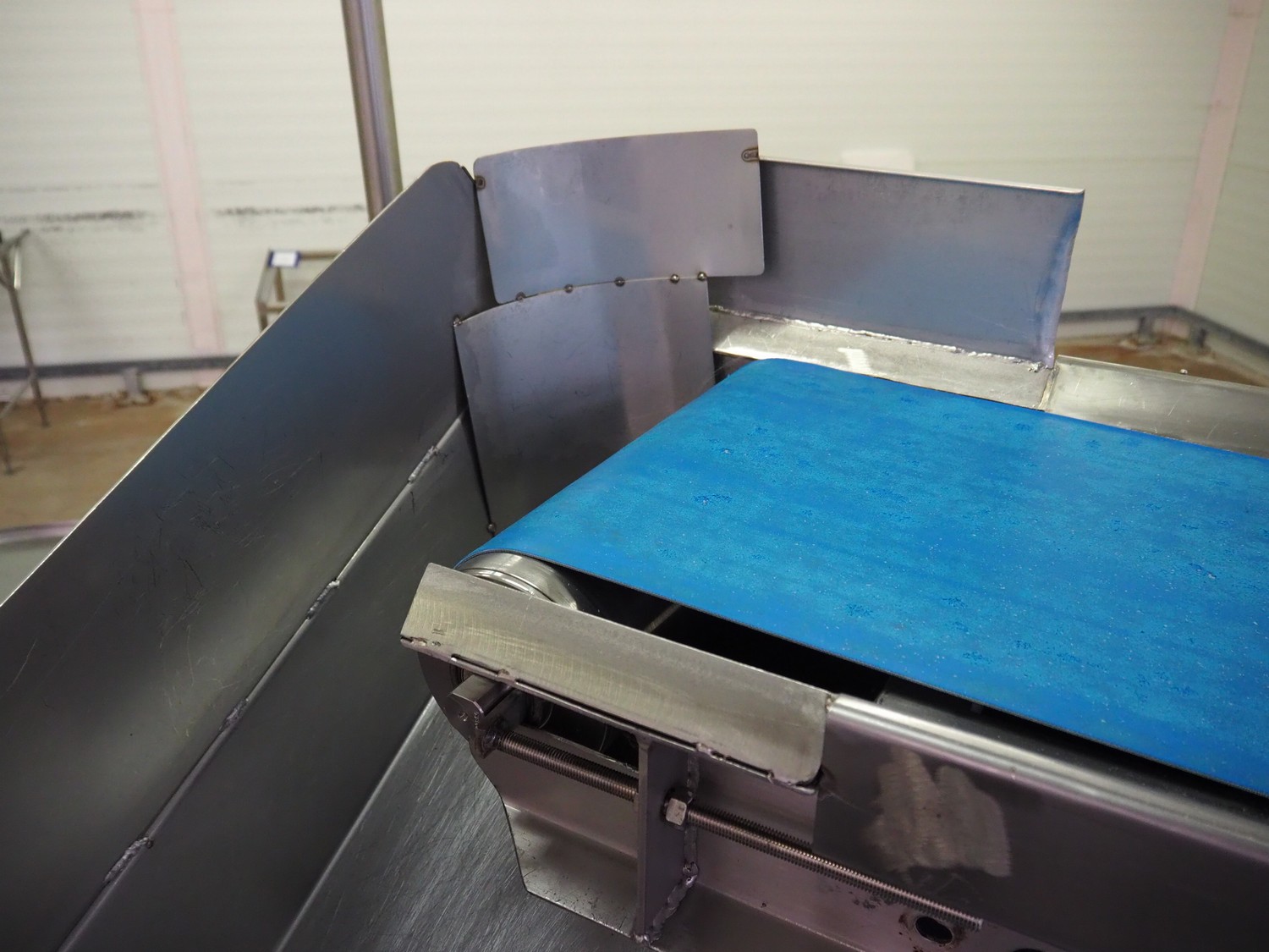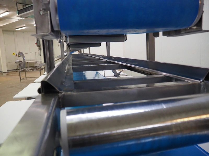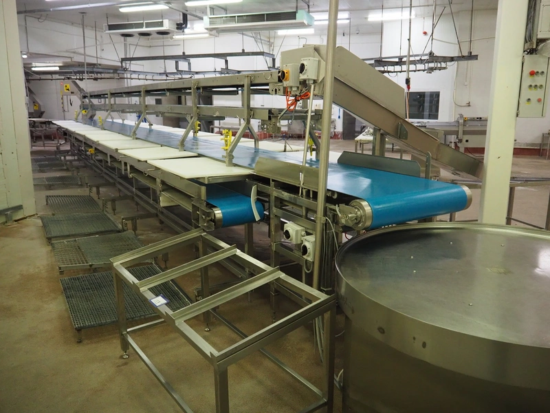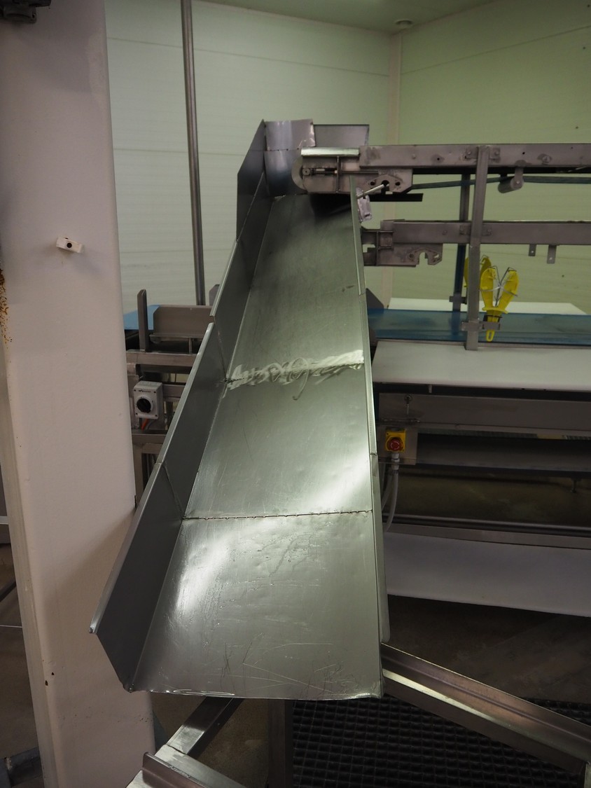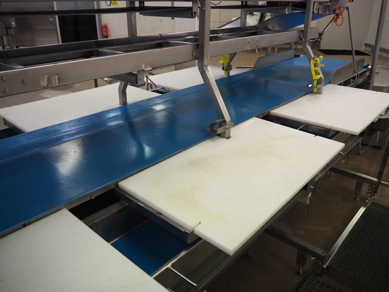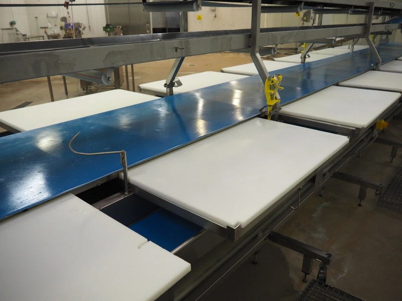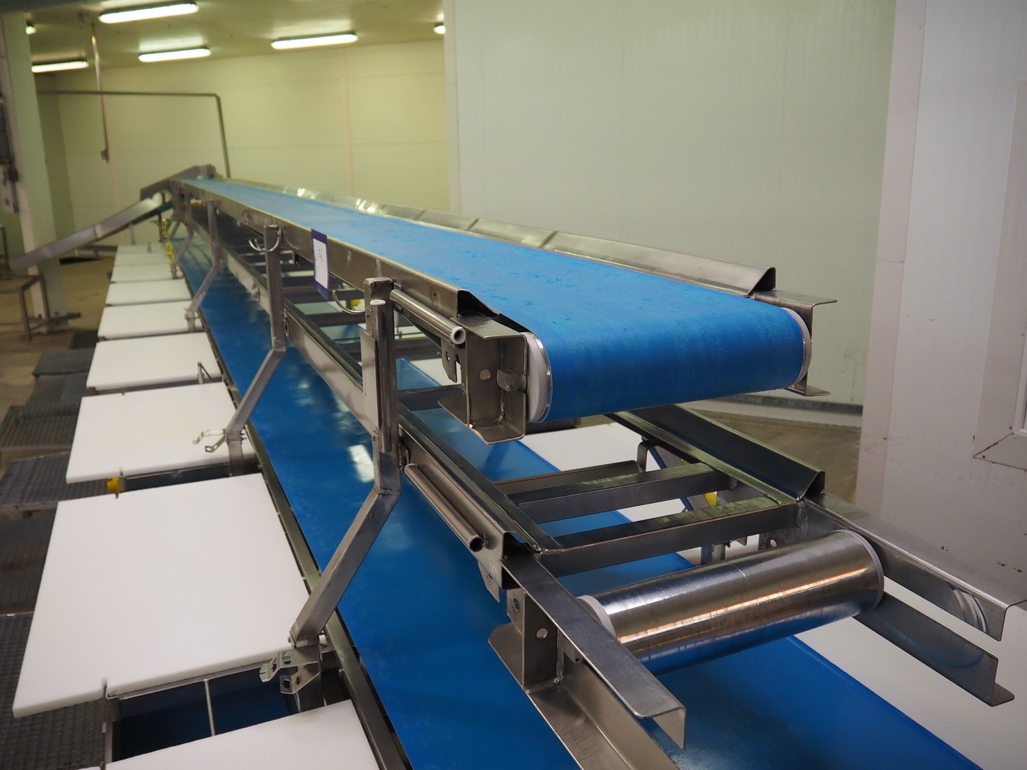 Deboning belt, s/s frame, (2x) 9 stations, dimensions stations: (18x) 990 mm x 550 mm, 4 plastic belts, belt width: 760 mm, 380 mm and (2x) 310 mm, total dimensions: 12600 mm x 1880 mm x 1850 mm. Including s/s outfeed slide.