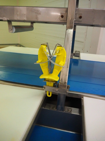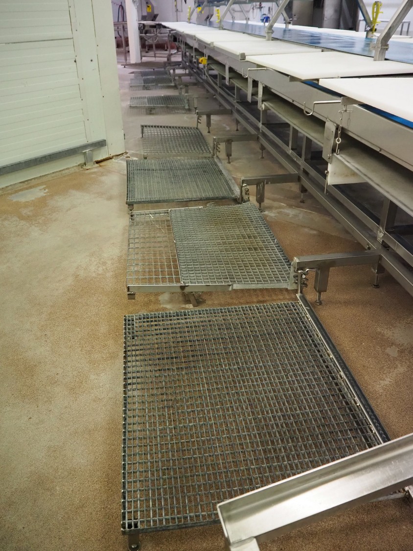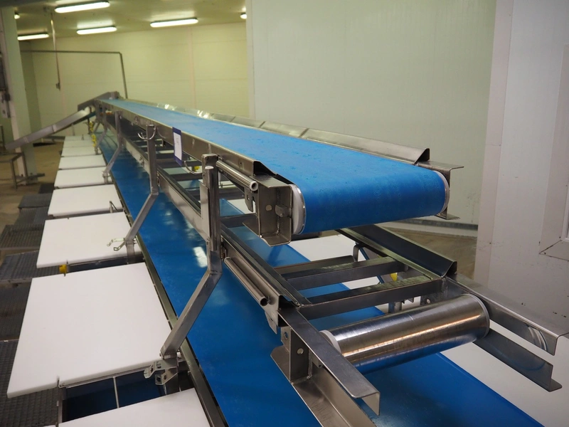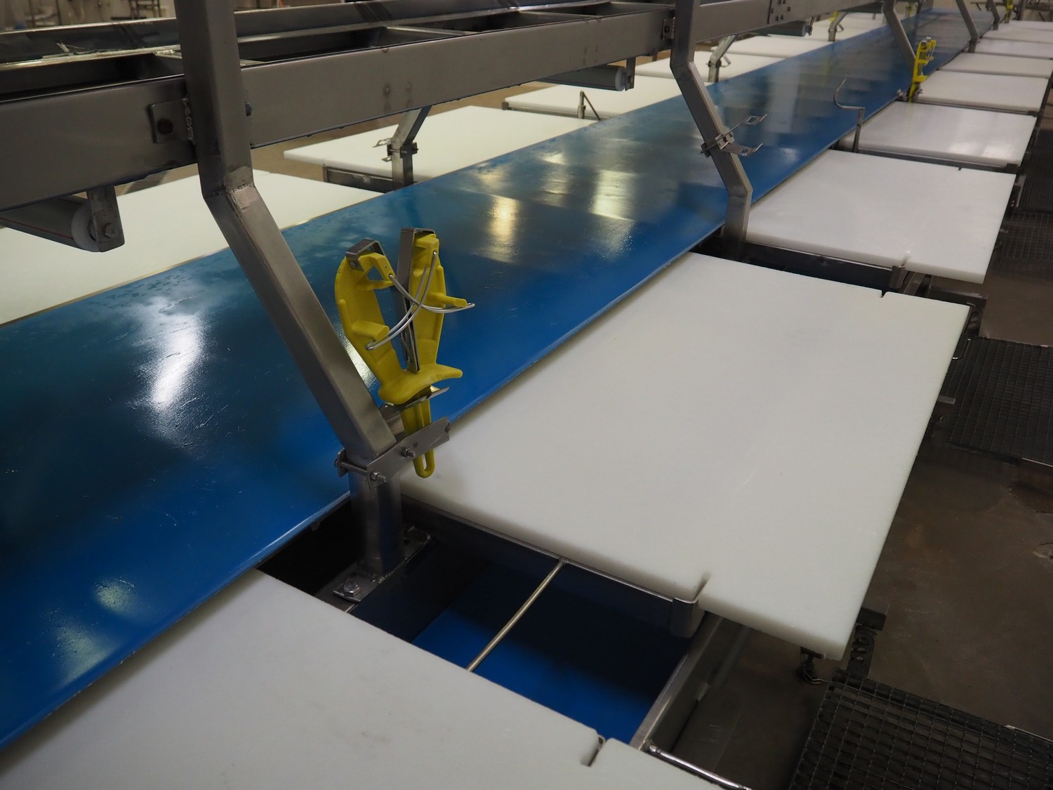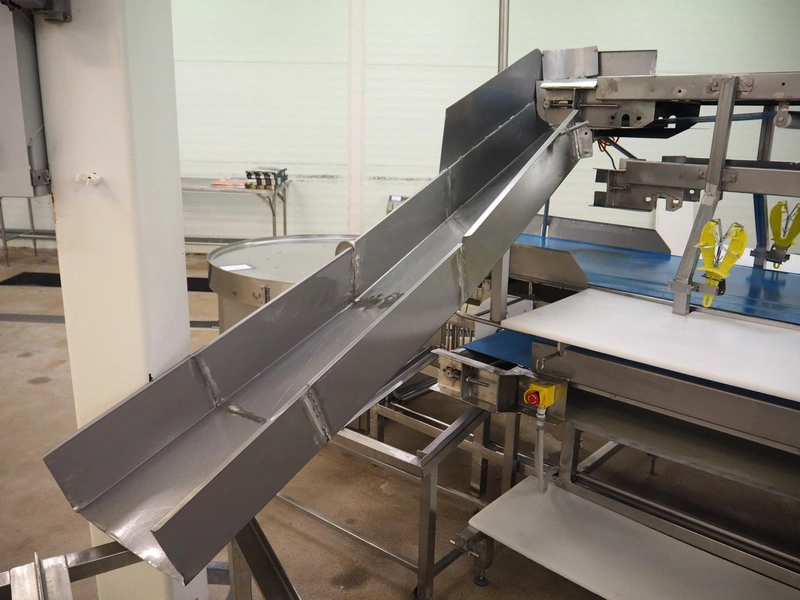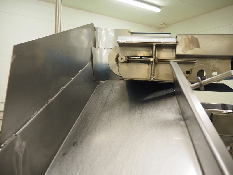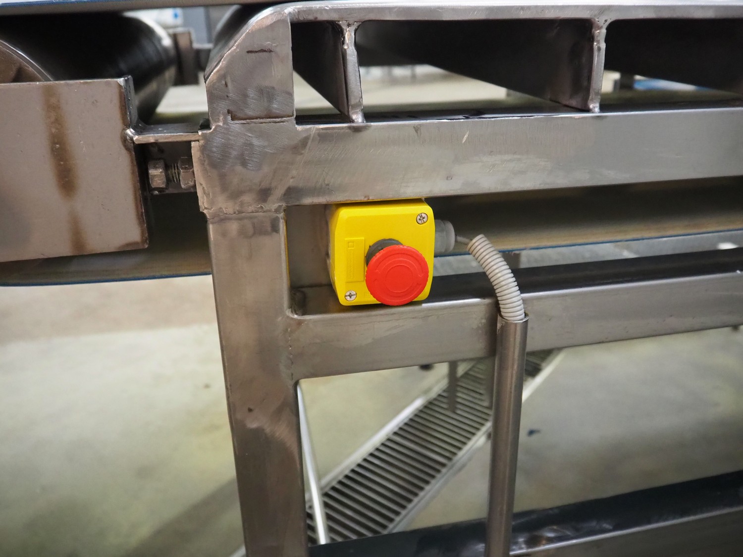 Deboning belt, s/s frame, (2x) 9 stations, dimensions stations: (18x) 990 mm x 550 mm, 4 plastic belts, belt width: 760 mm, 380 mm and (2x) 310 mm, total dimensions: 12600 mm x 1880 mm x 1850 mm. Including s/s outfeed slide.