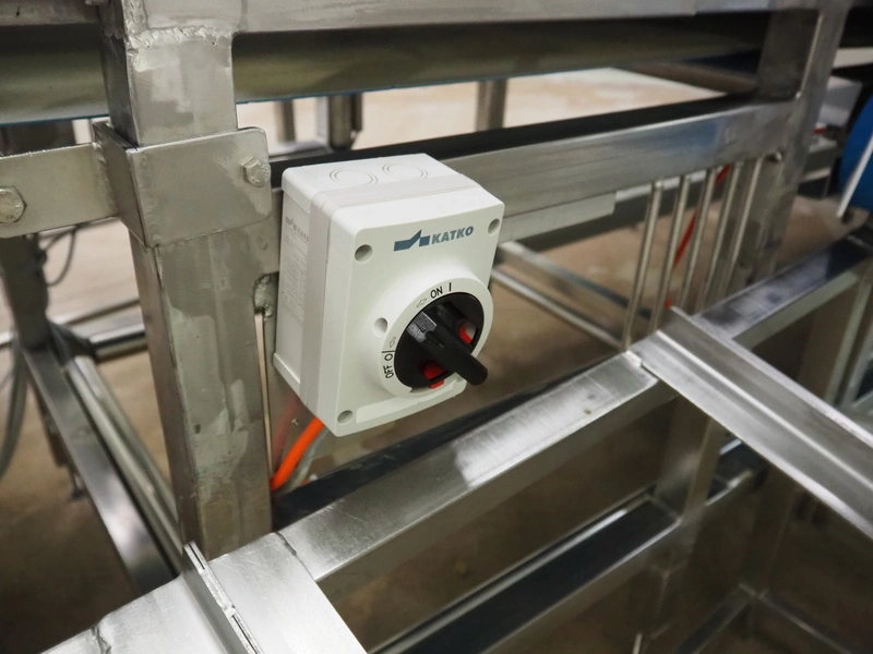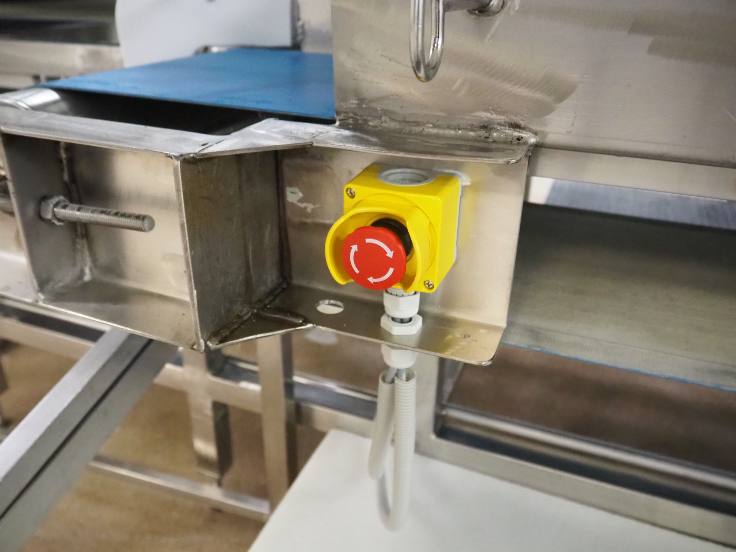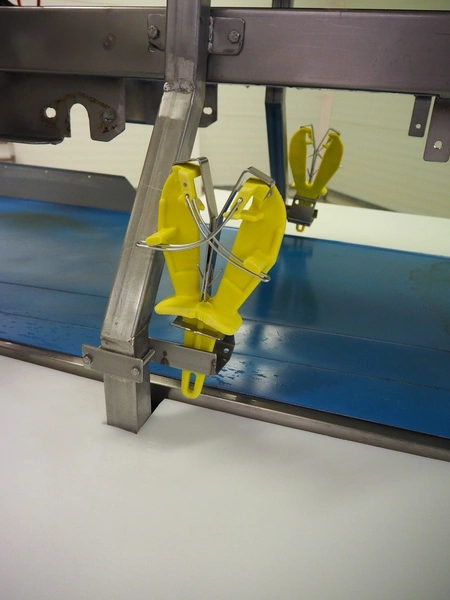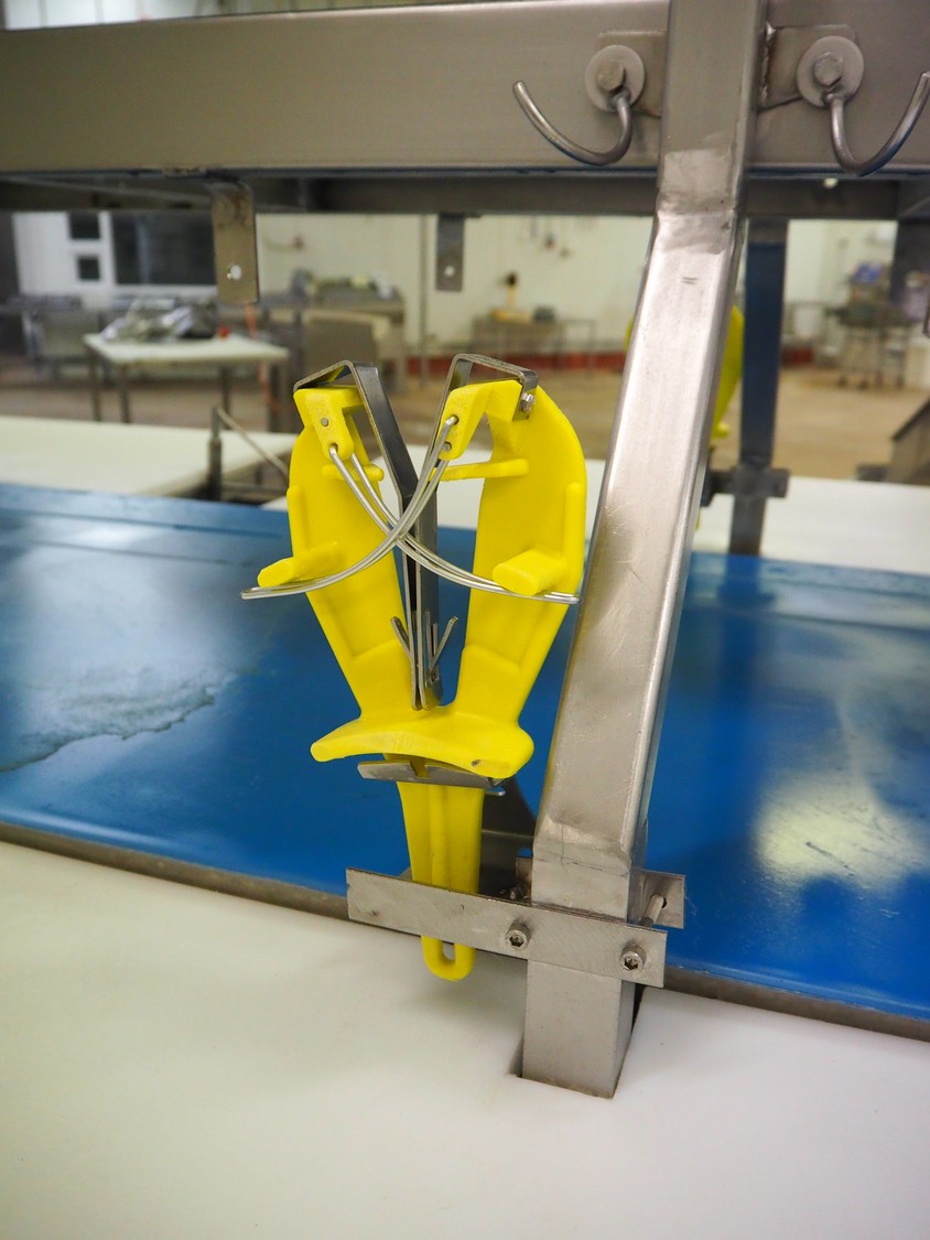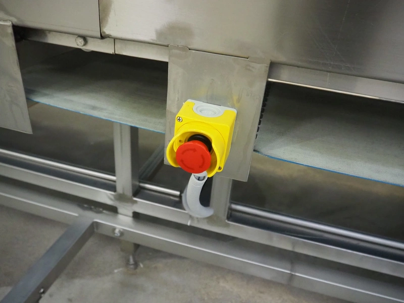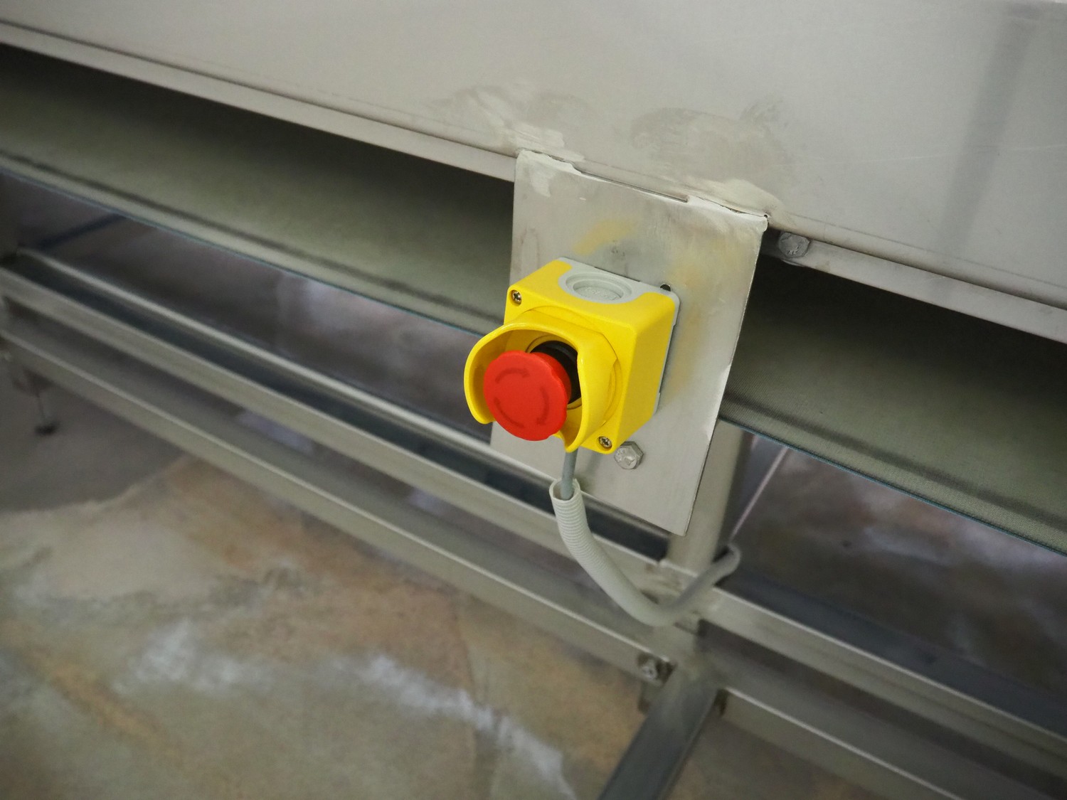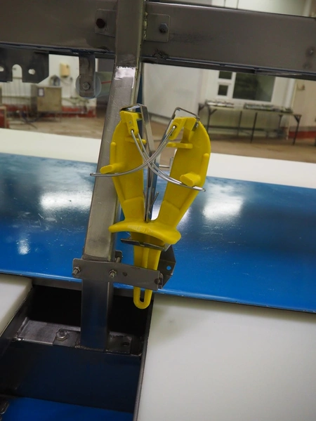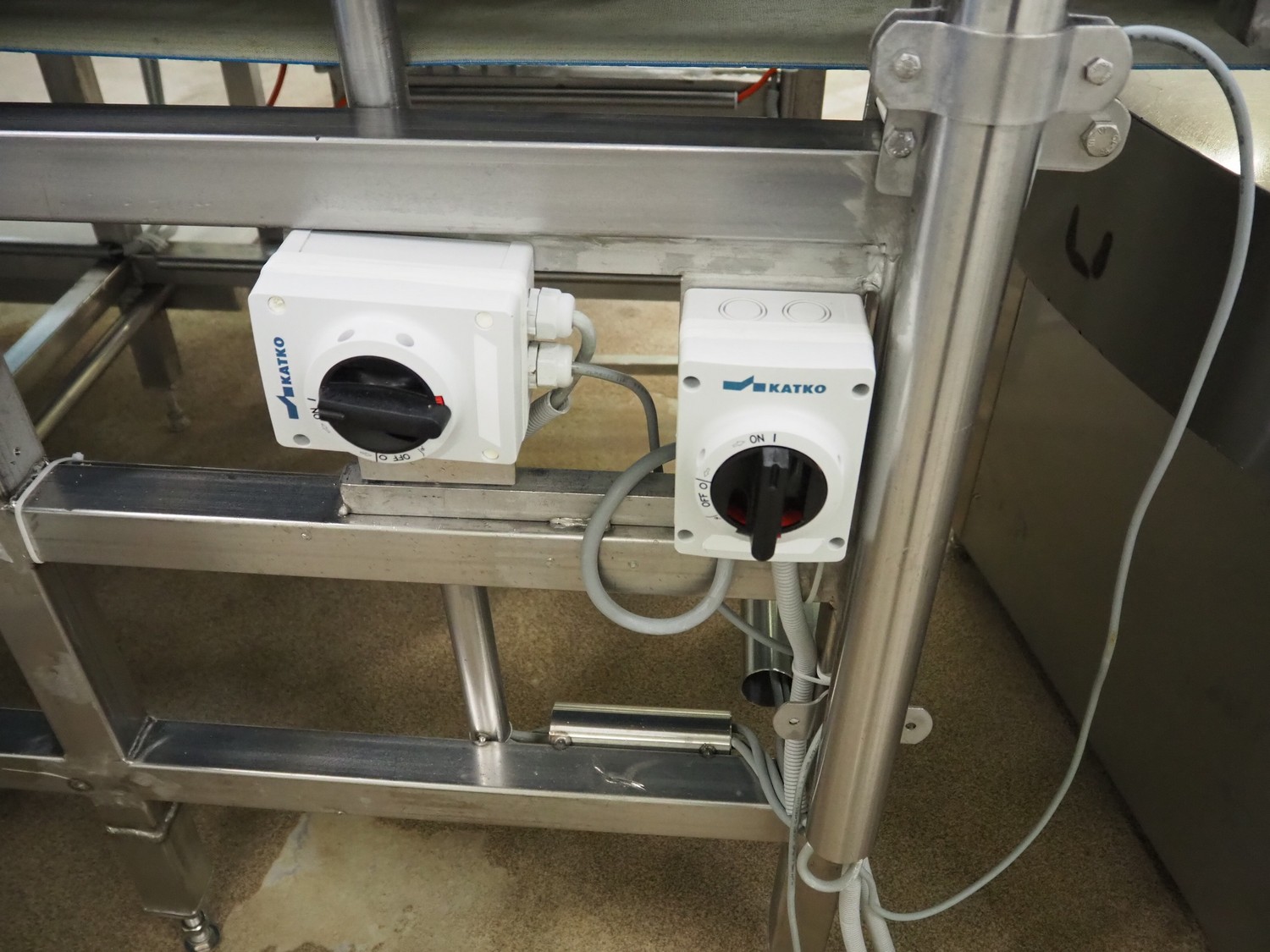 Deboning belt, s/s frame, (2x) 9 stations, dimensions stations: (18x) 990 mm x 550 mm, 4 plastic belts, belt width: 760 mm, 380 mm and (2x) 310 mm, total dimensions: 12600 mm x 1880 mm x 1850 mm. Including s/s outfeed slide.