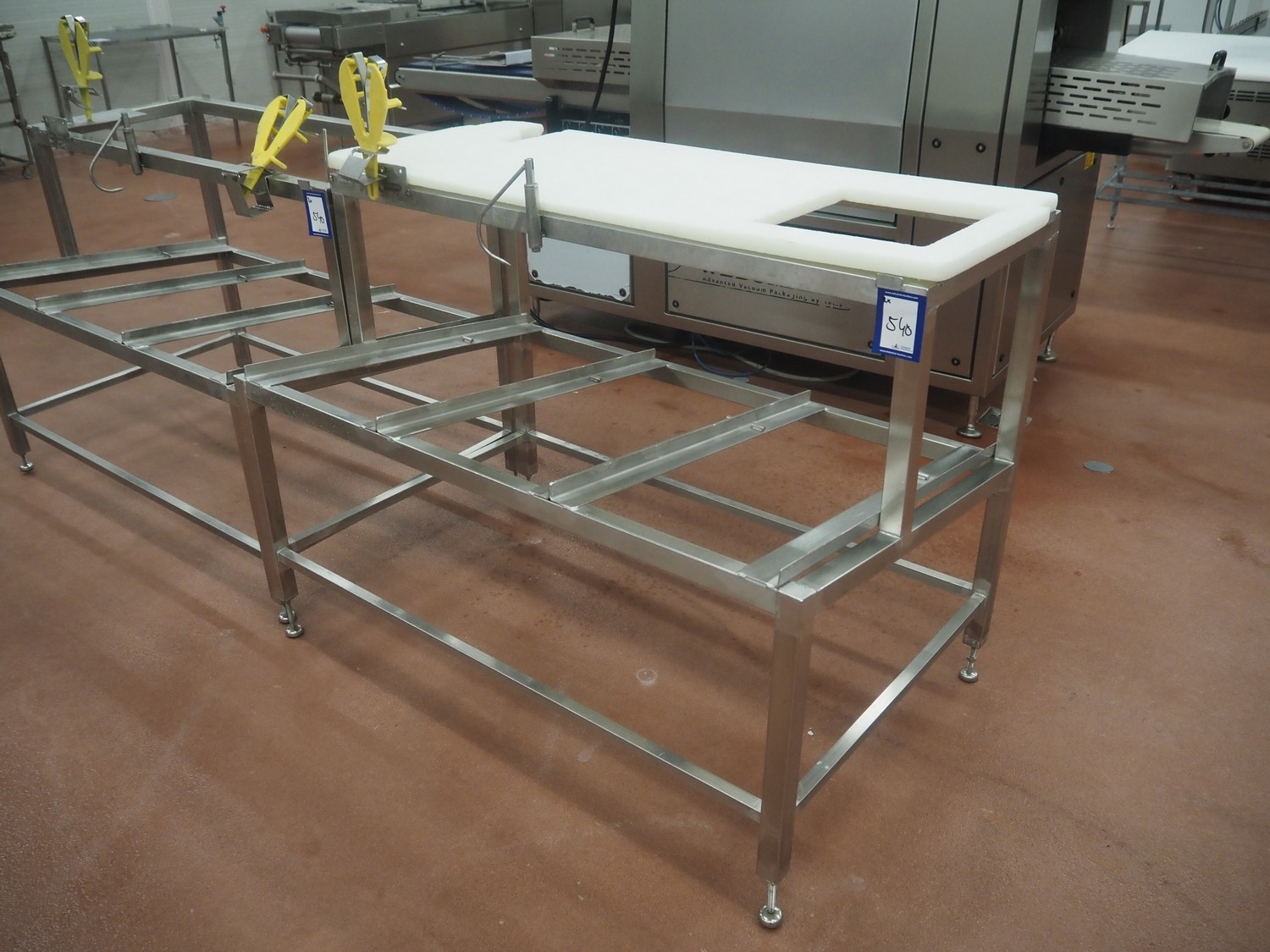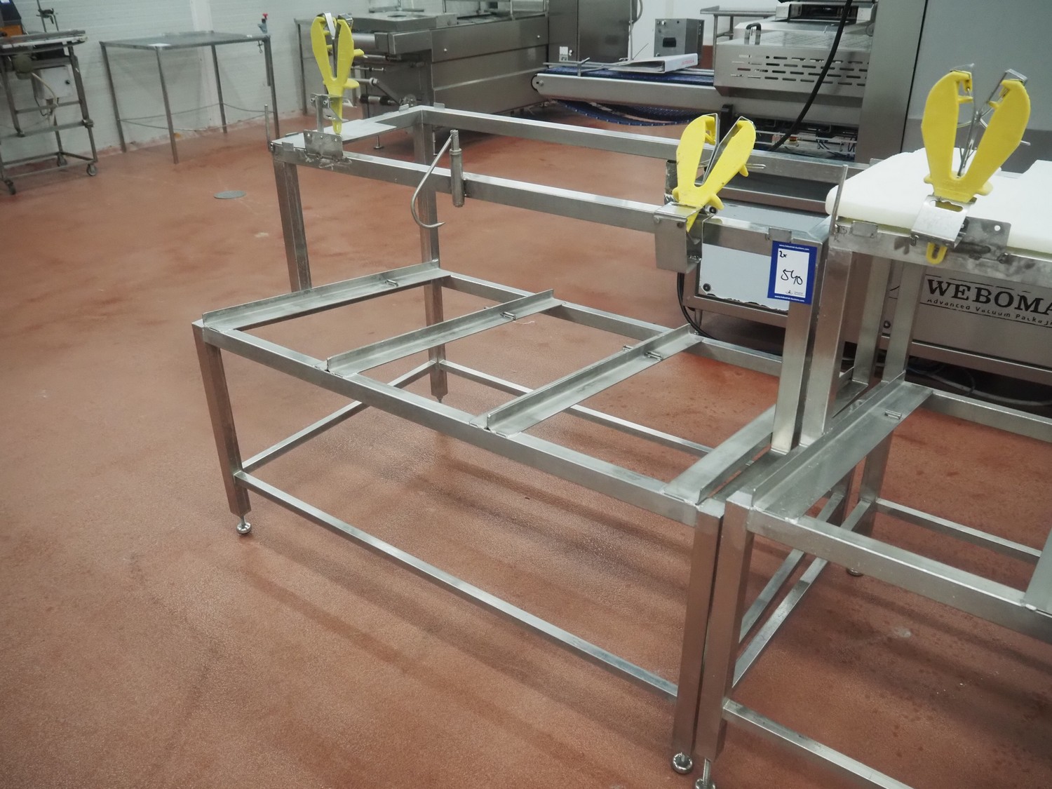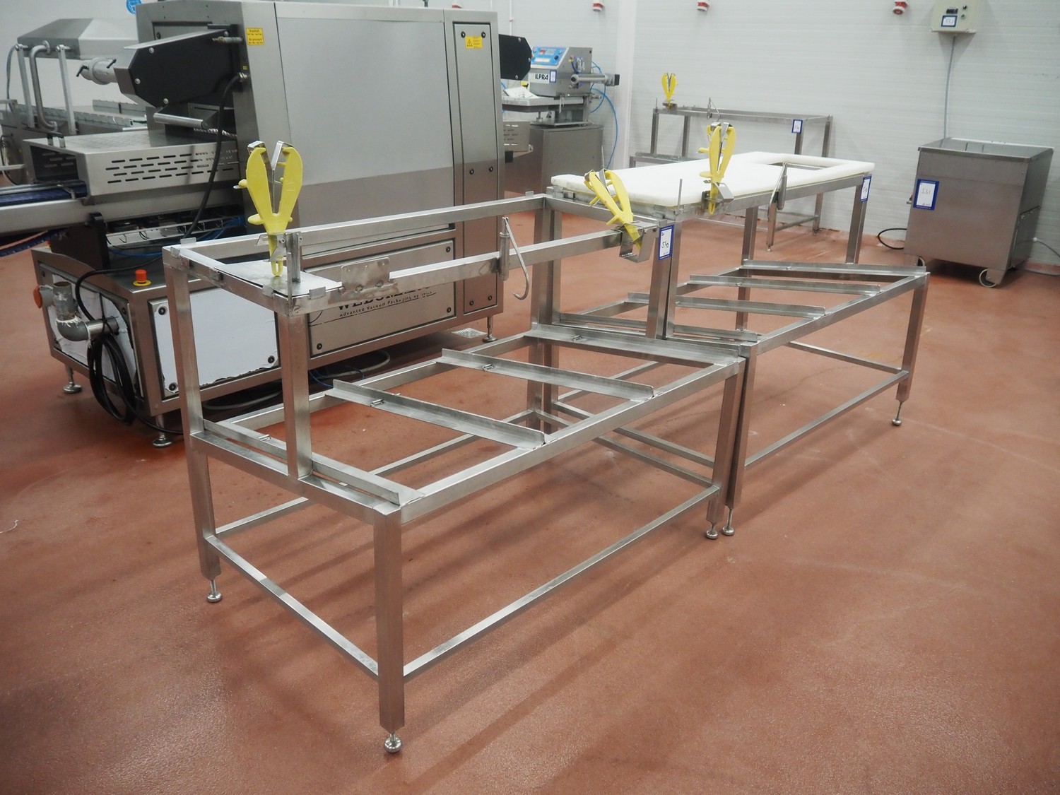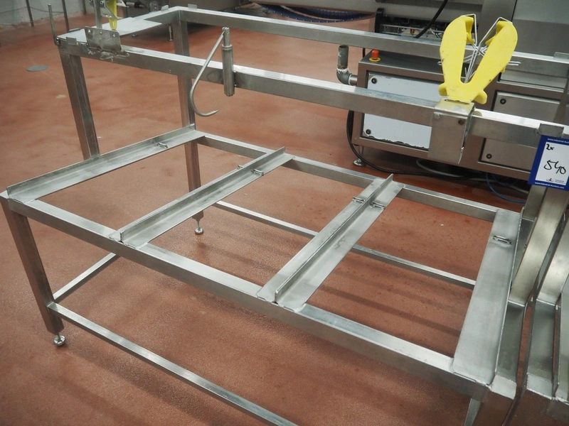 2 s/s frames for deboning table, dimensions: (2x) 1340 mm x 850 mm x 1250 mm, one frame with plastic worktop.