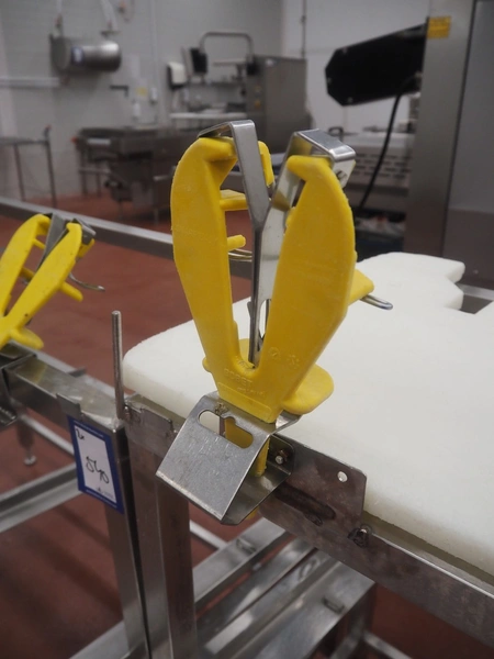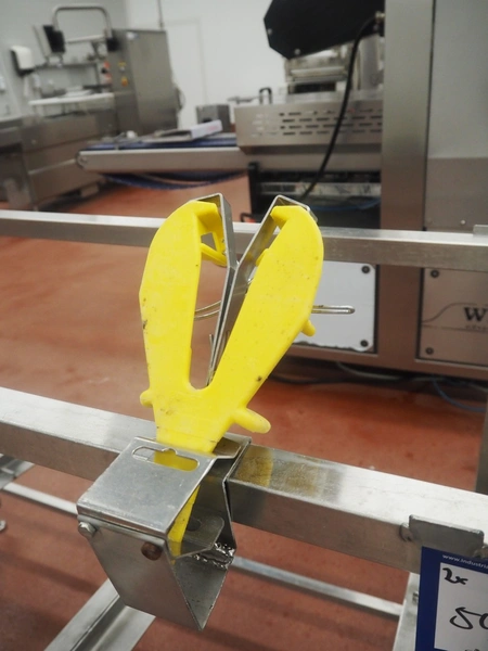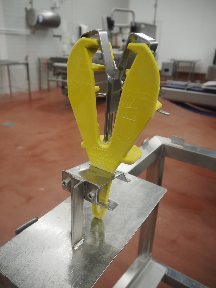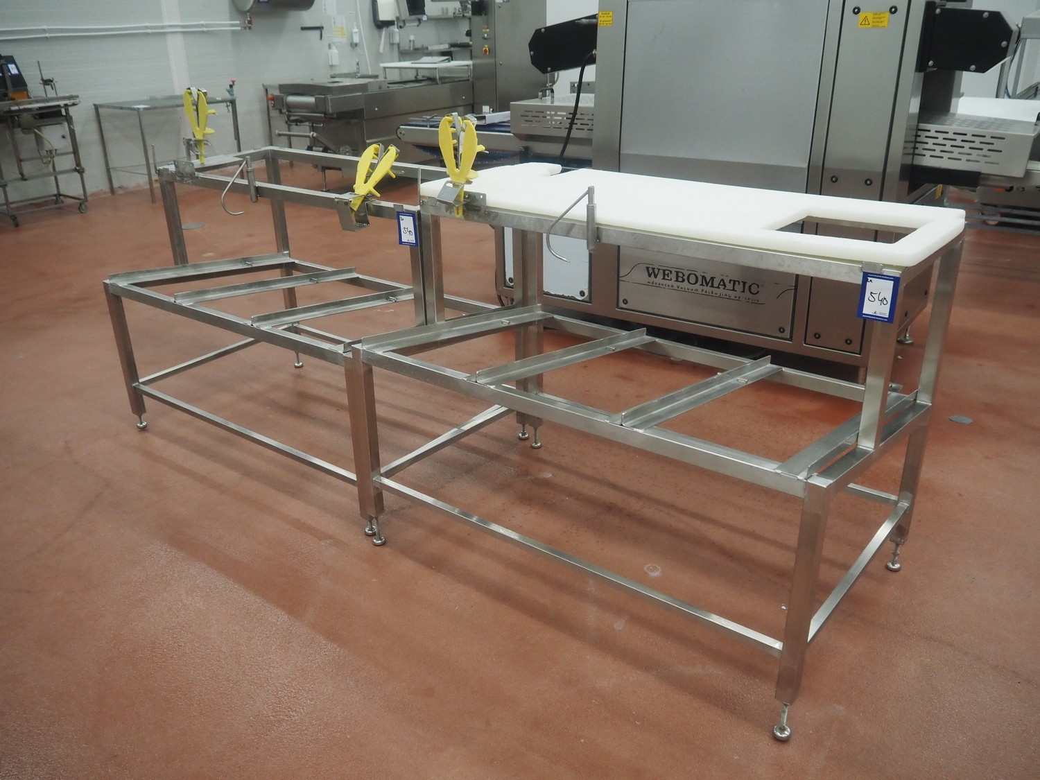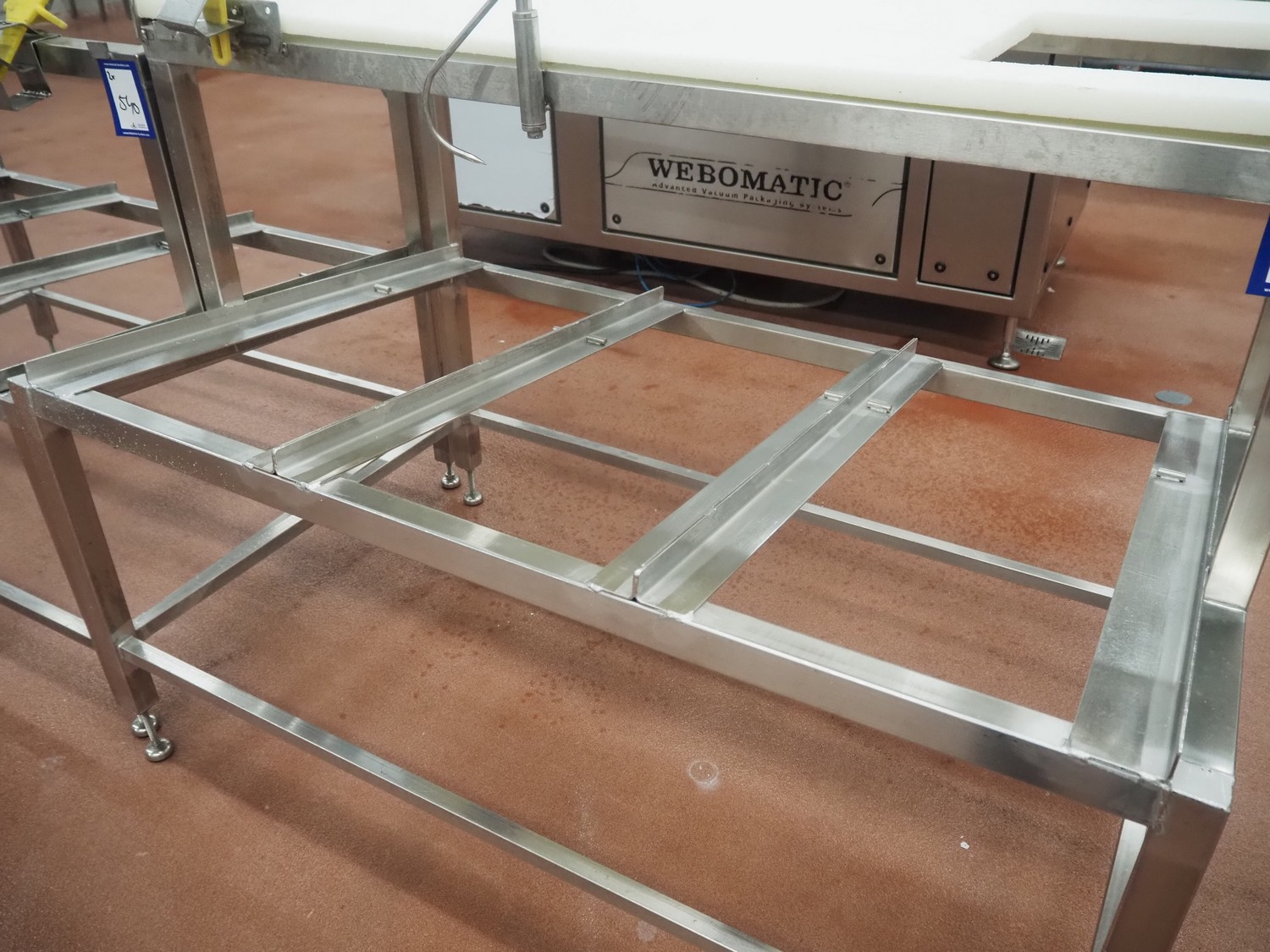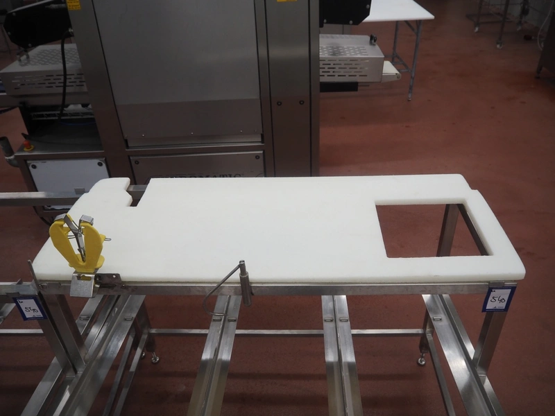 2 s/s frames for deboning table, dimensions: (2x) 1340 mm x 850 mm x 1250 mm, one frame with plastic worktop.